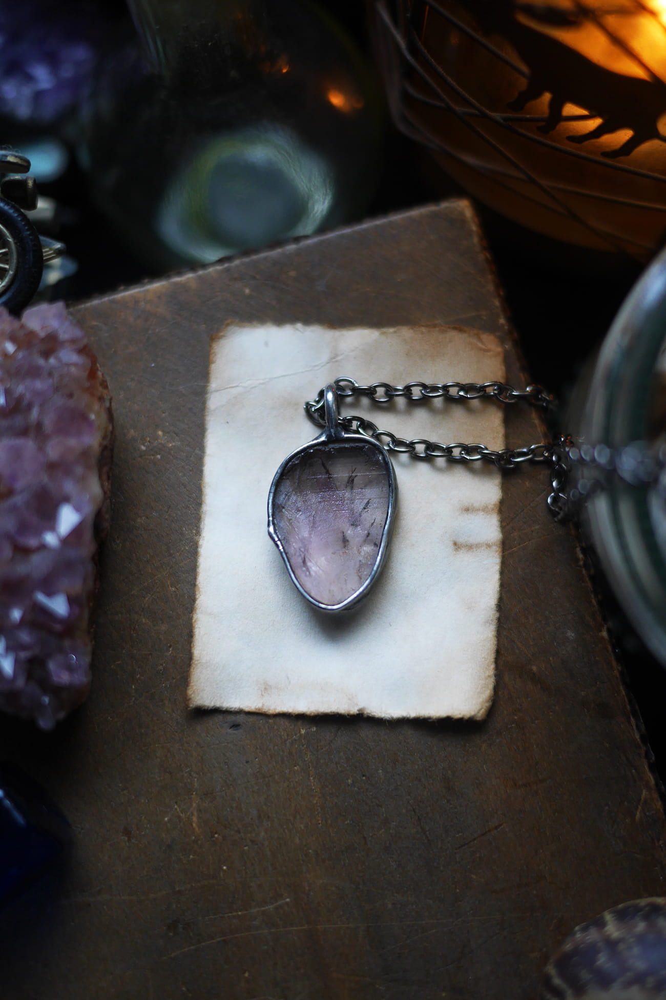 Ametyst z inkluzjami. Surowy przód, szlifowany tył.