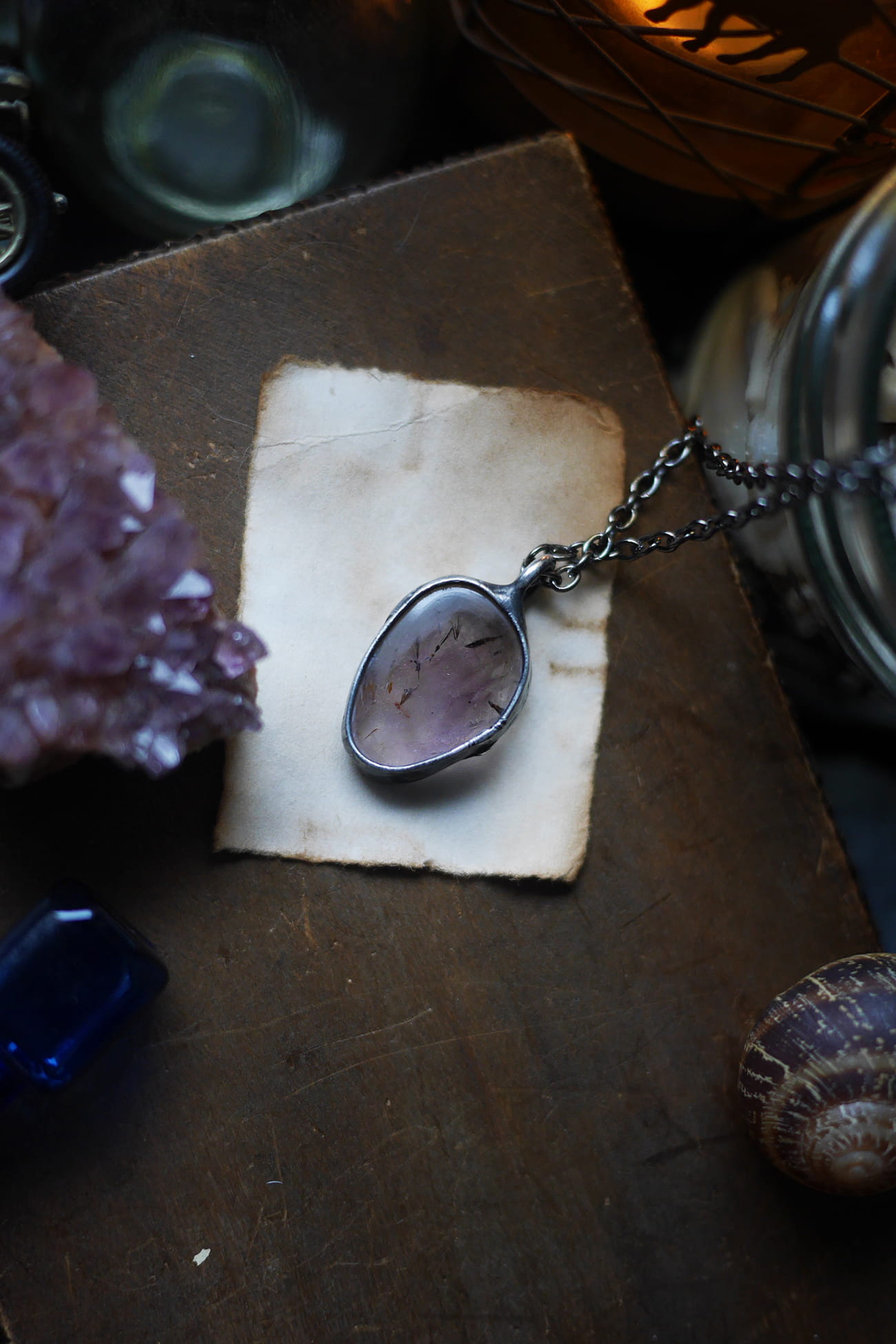 Kamień: surowa bryłka ametystu z inkluzjami, szlifowany tył.