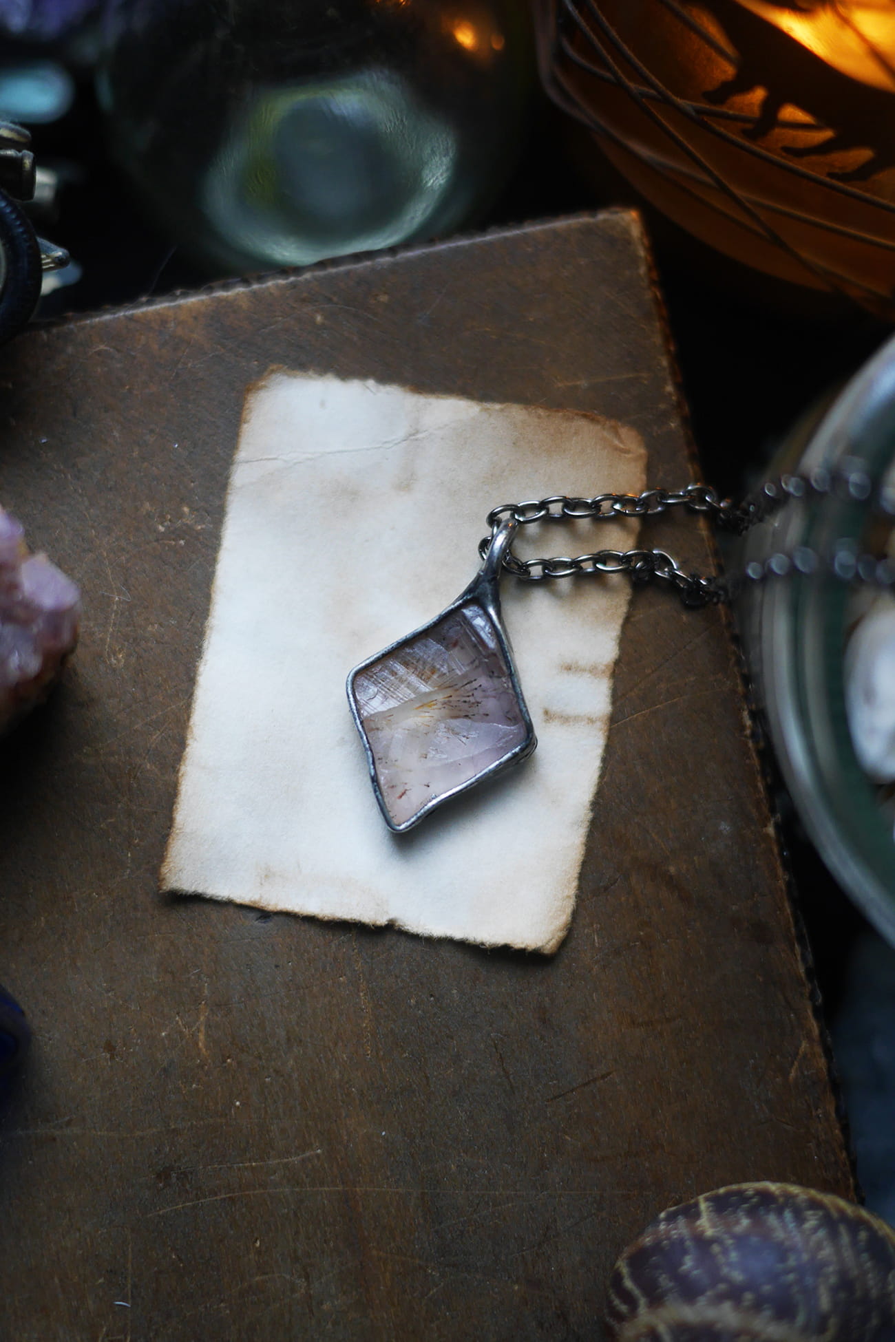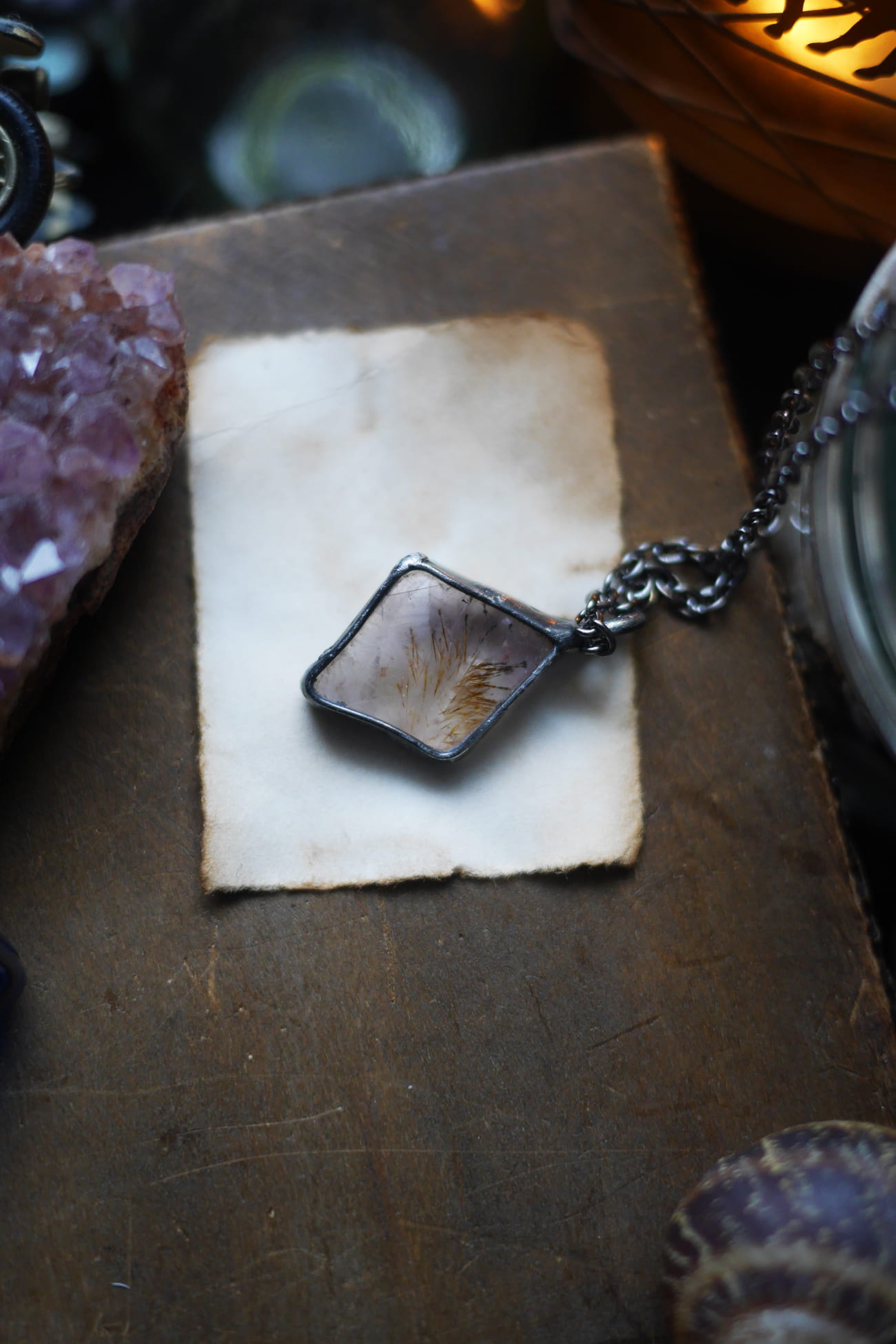 Kamień: surowa bryłka ametystu z inkluzjami, szlifowany tył.