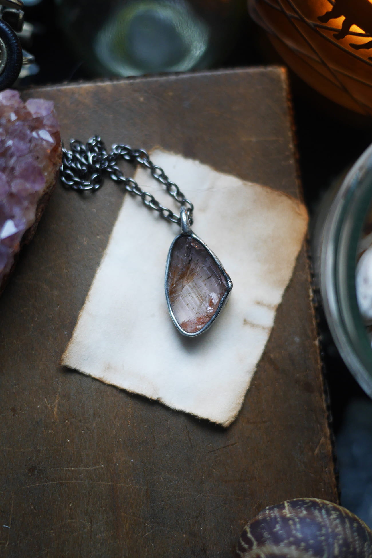 Ametyst z inkluzjami. Surowy przód, szlifowany tył.