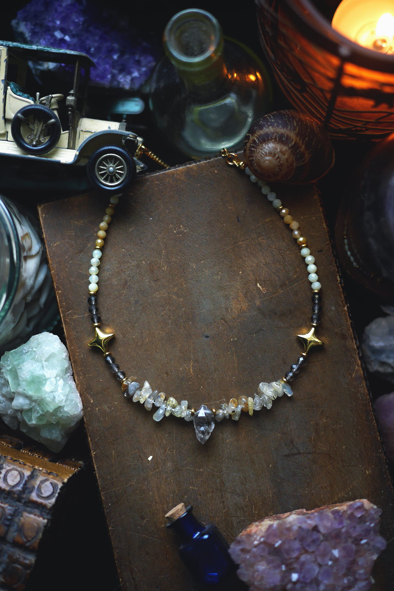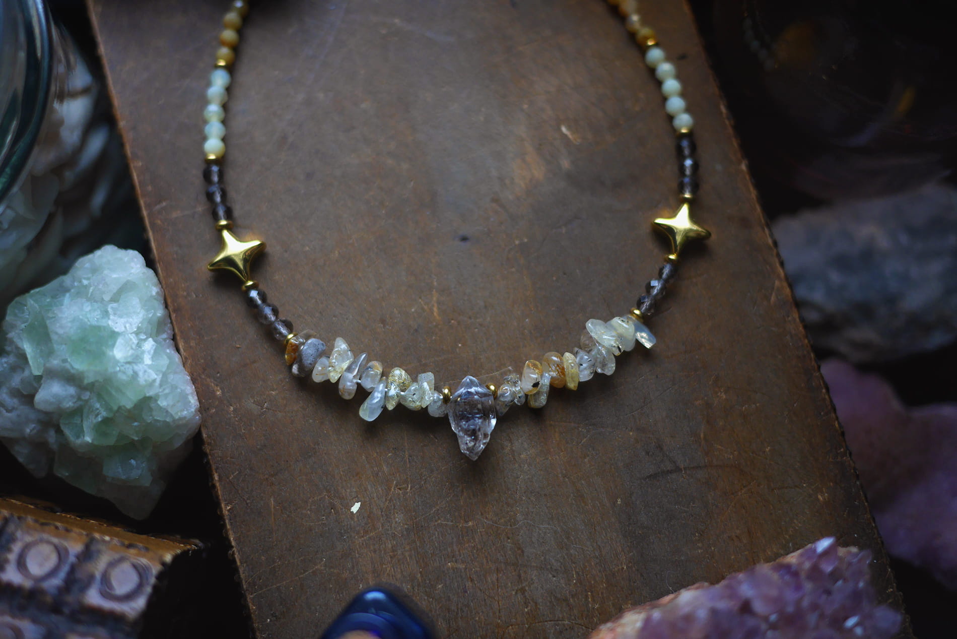 Kwarc herkimer, kwarc z rutylem, kwarc dymny, opal żółty i amazonit.