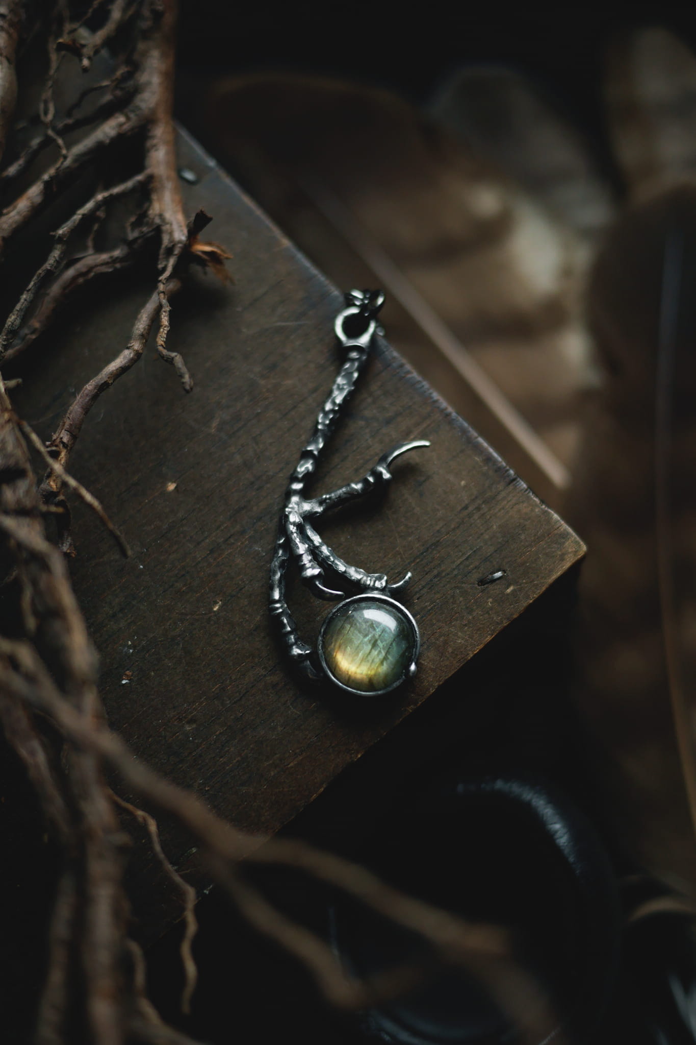 Metalowa ptasia łapka z okrągłym labradorytem.