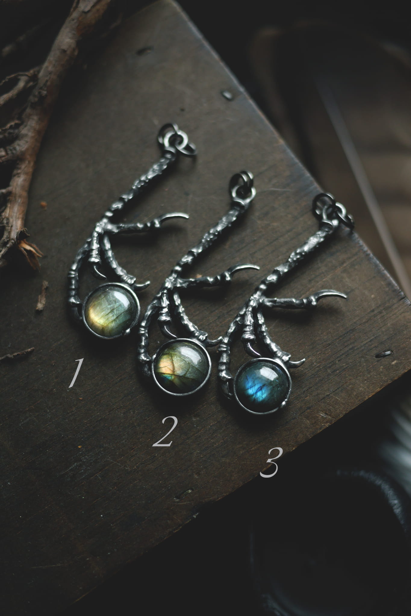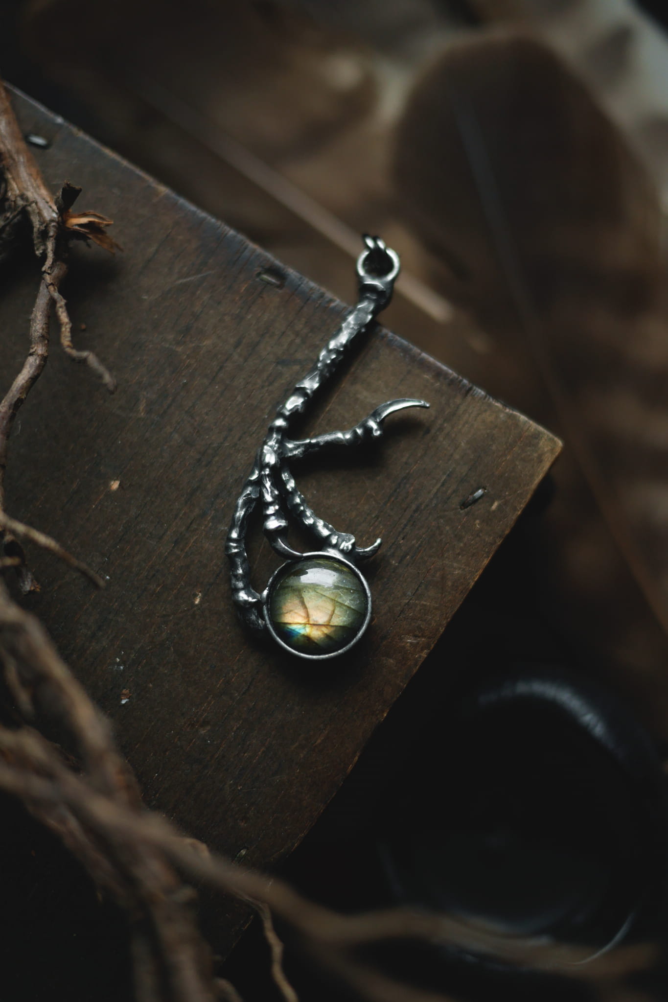 Metalowa ptasia łapka z okrągłym labradorytem.