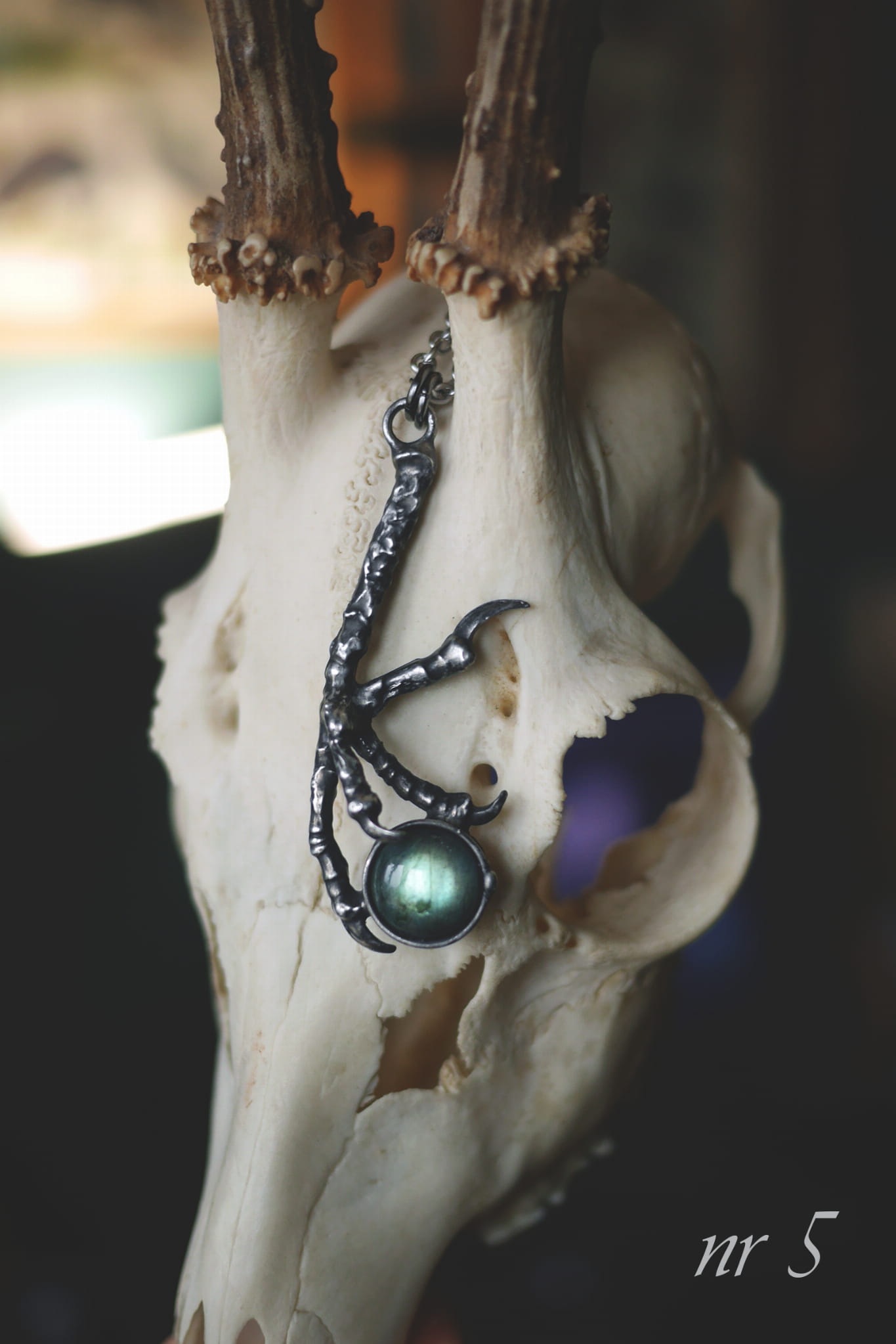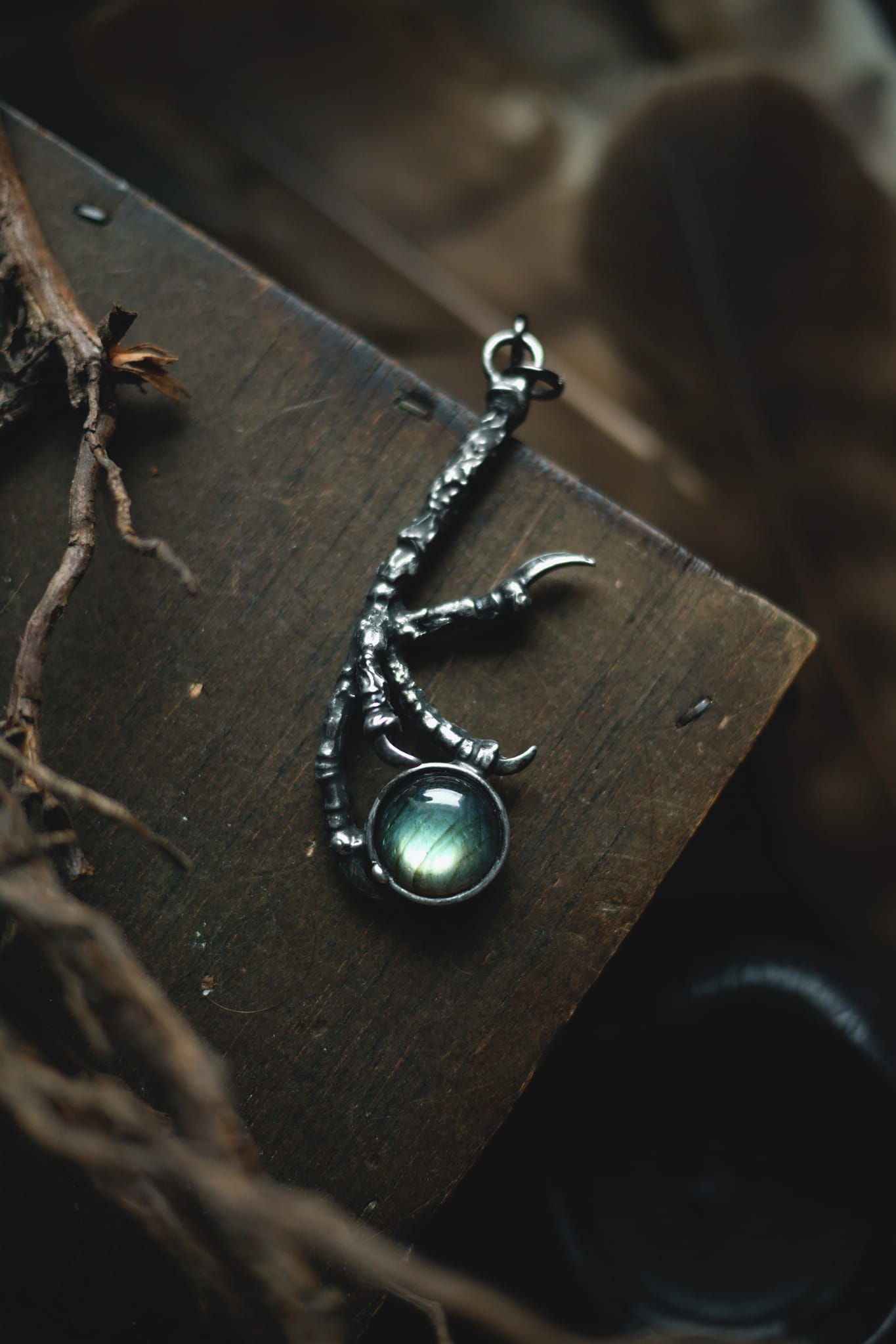 Metalowa ptasia łapka z okrągłym labradorytem.