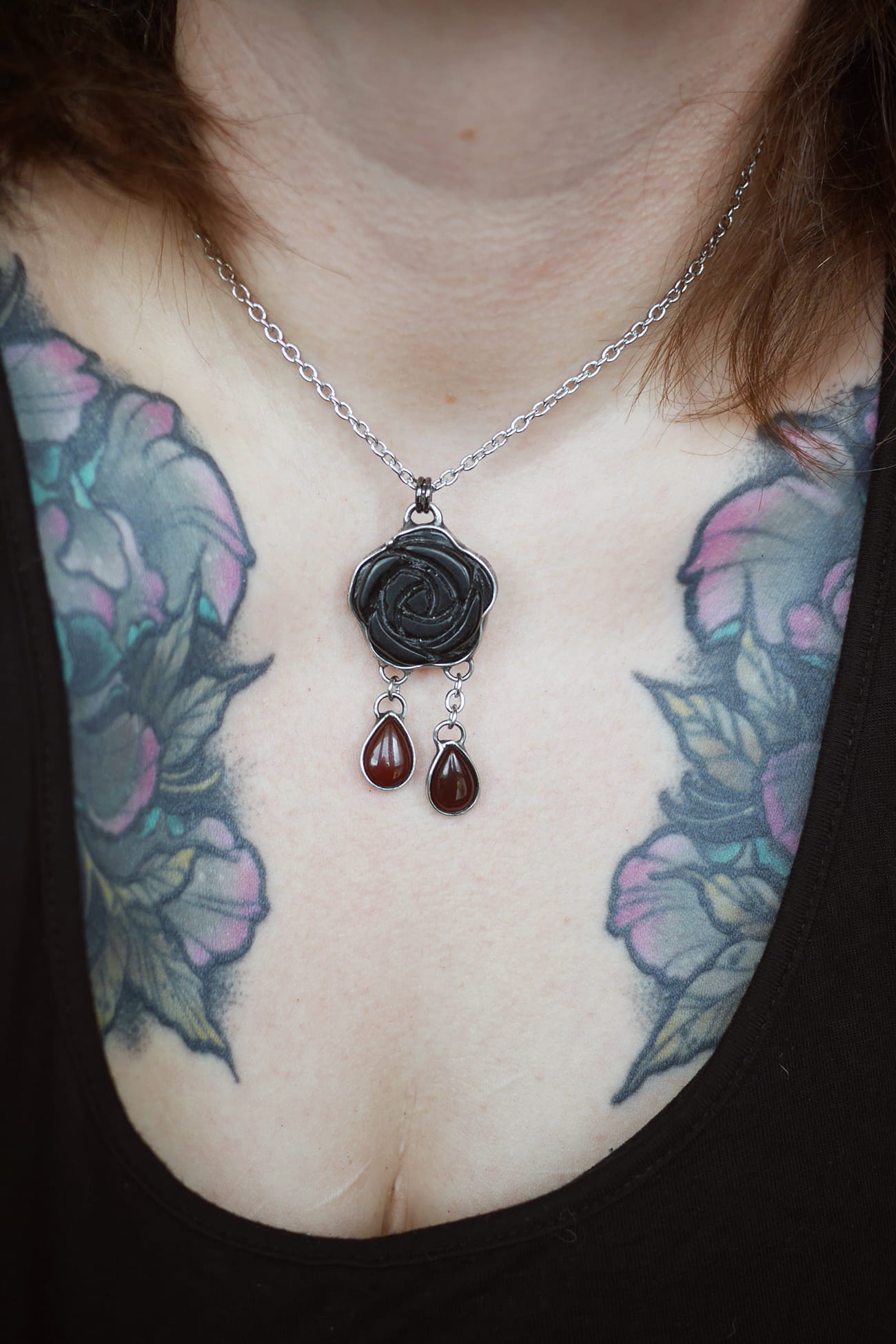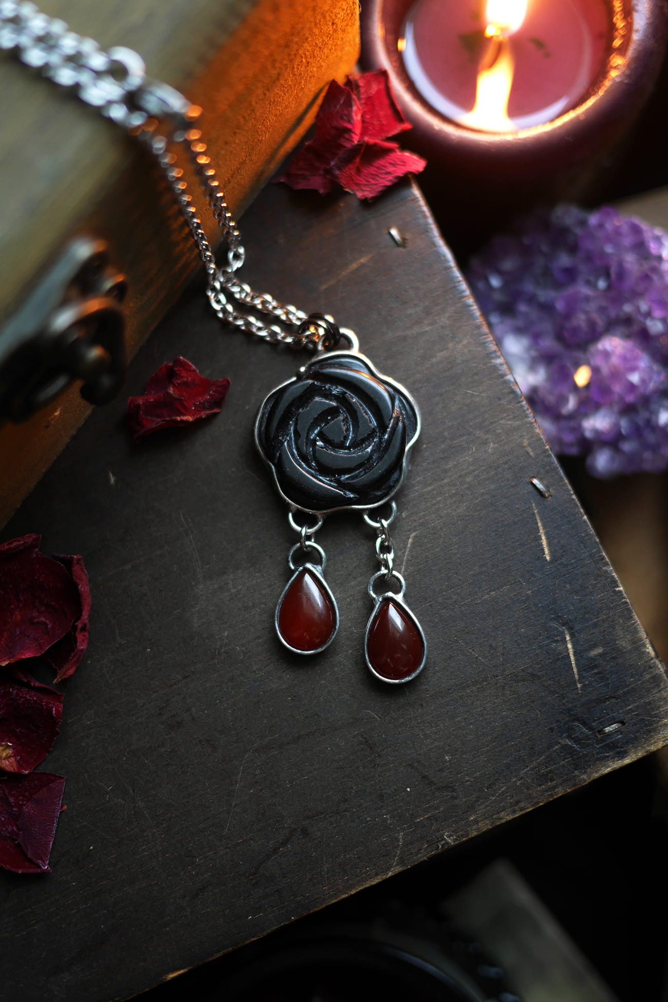 Kamień: rzeźbiony czarny onyks, agat czerwony w kształcie kropli.