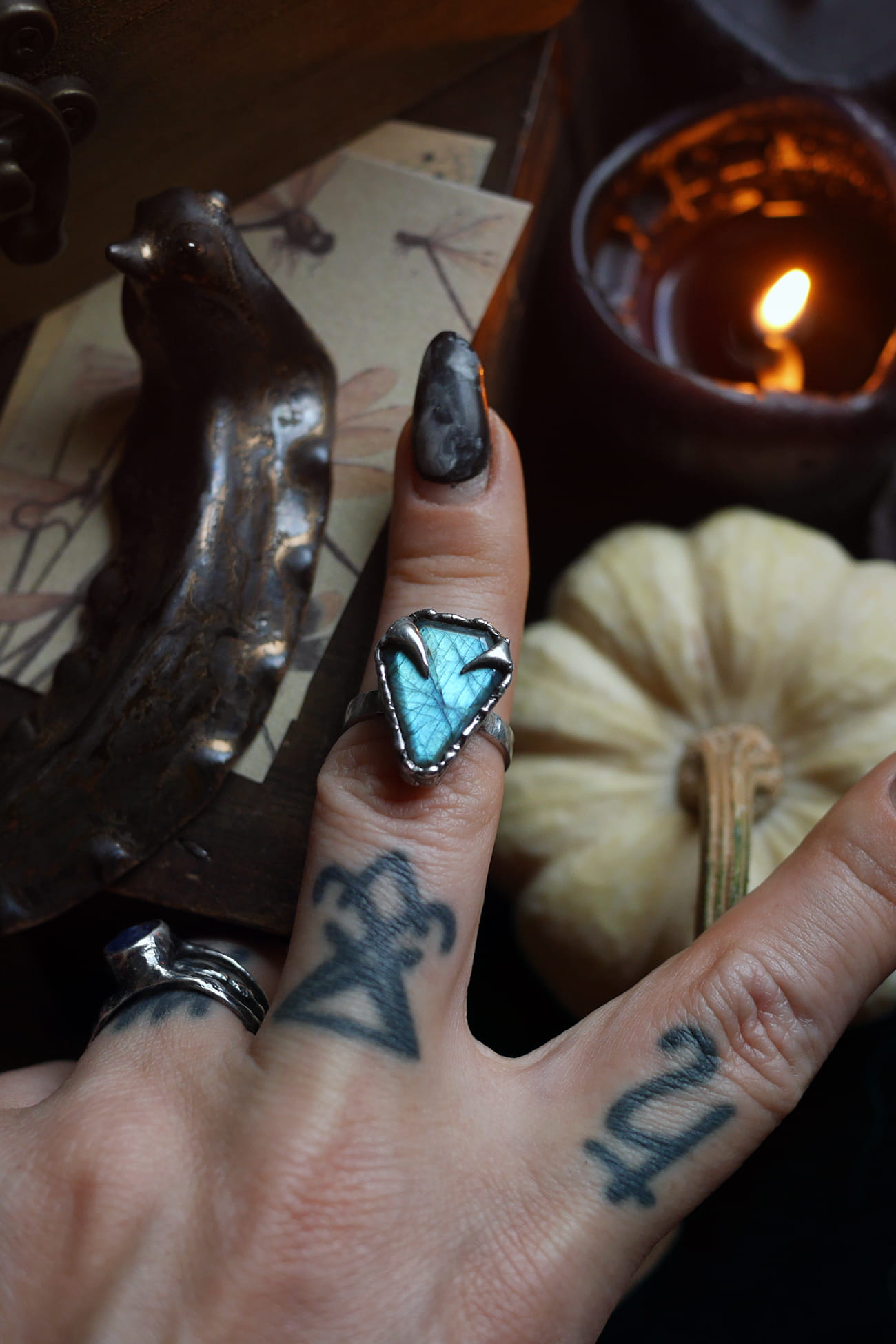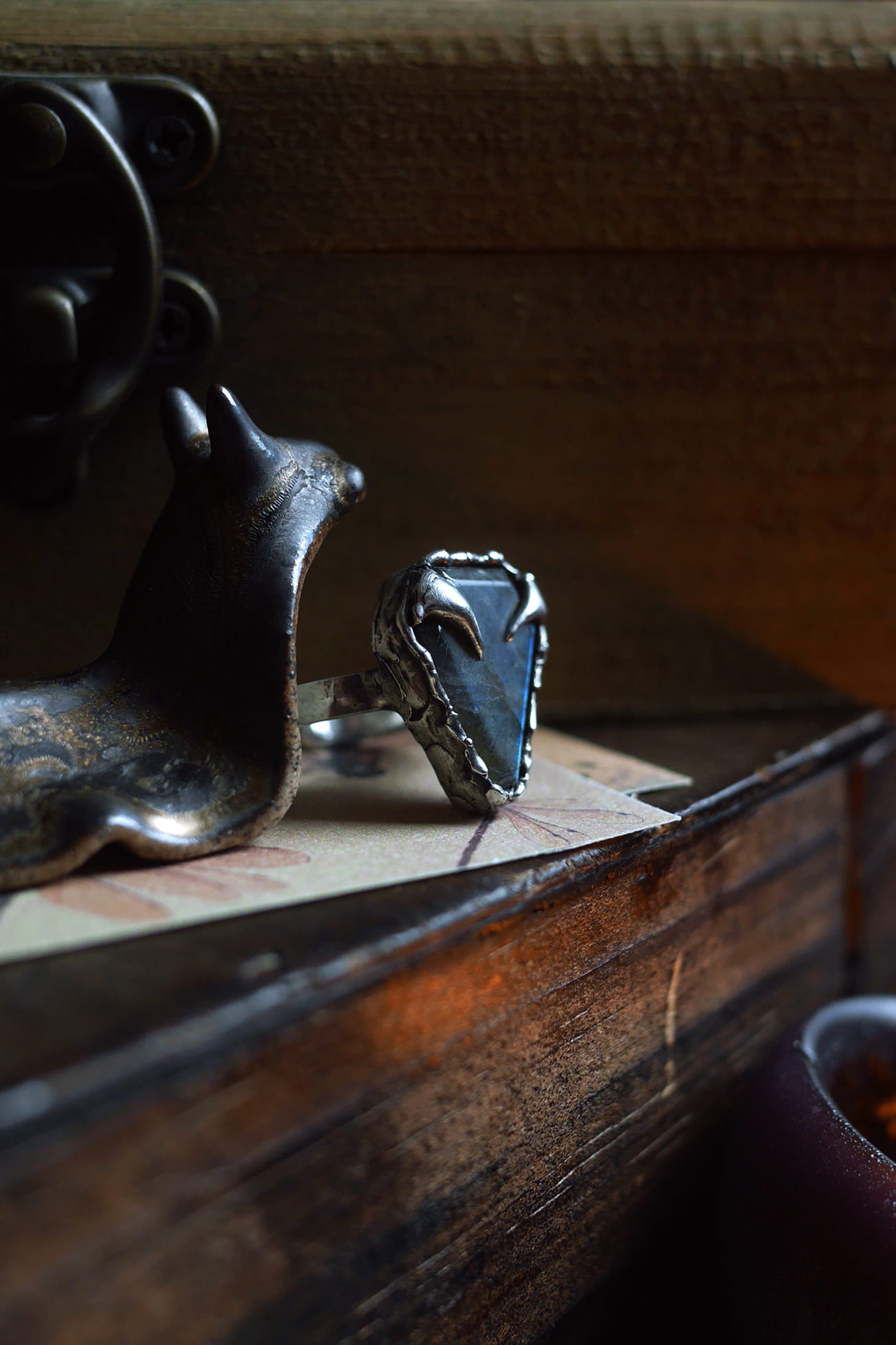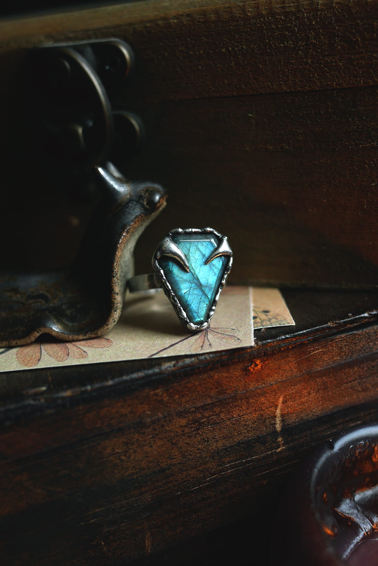 Regulowany pierścionek z labradorytem w kształcie trumny.