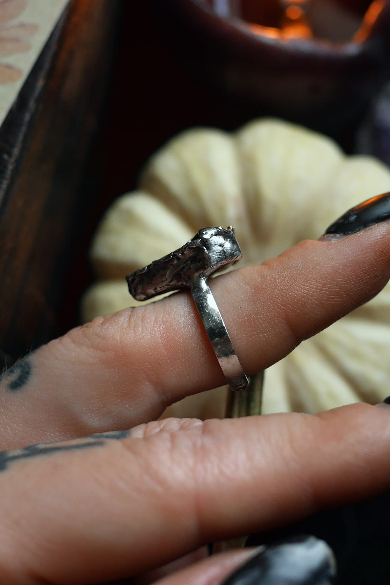 Bez patyny na obrączce, patynowana oprawa kamienia - polerowany.