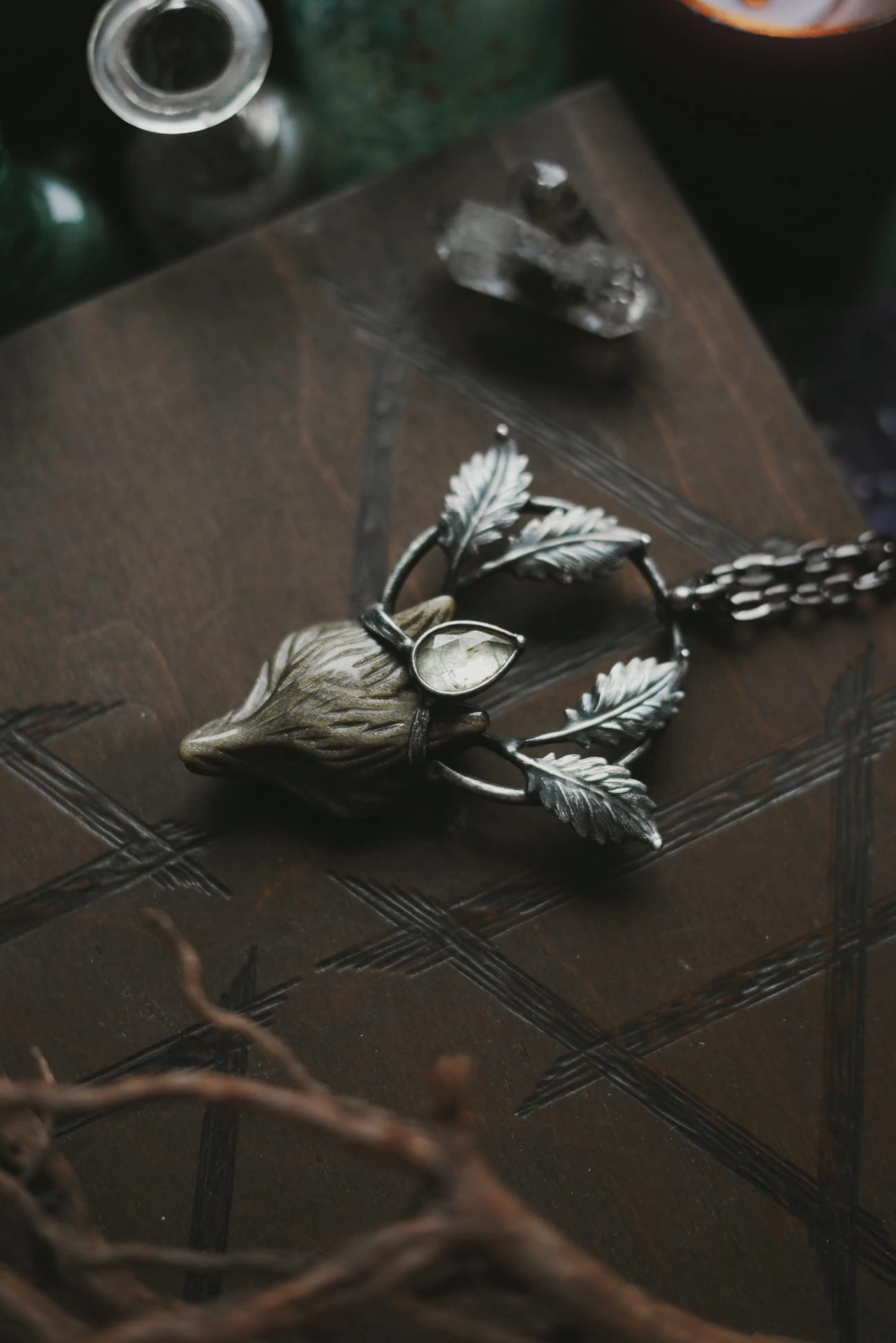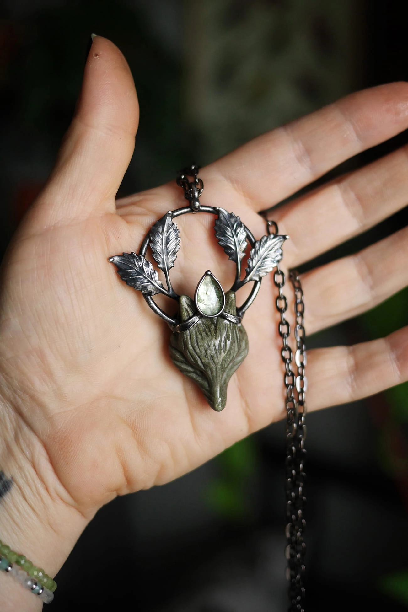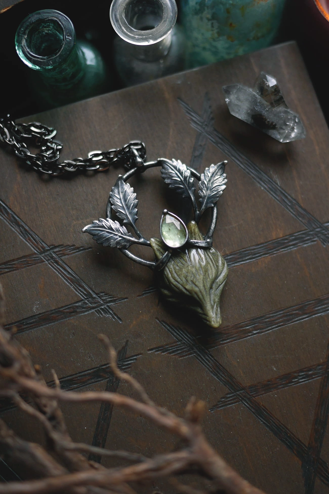 Rzeźbiona głowa lisa wykonana ze złotego obsydianu w połączeniu z zielonym kyanitem oraz listkami.