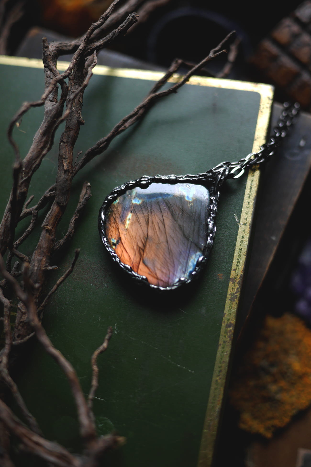 Kamień: labradoryt o fioletowo pomarańczowym ogniu z odrobiną granatu.
