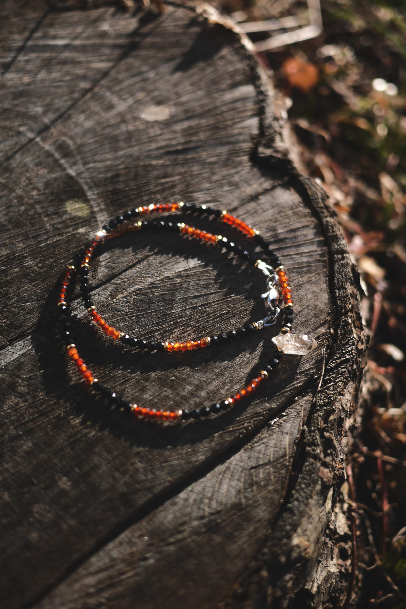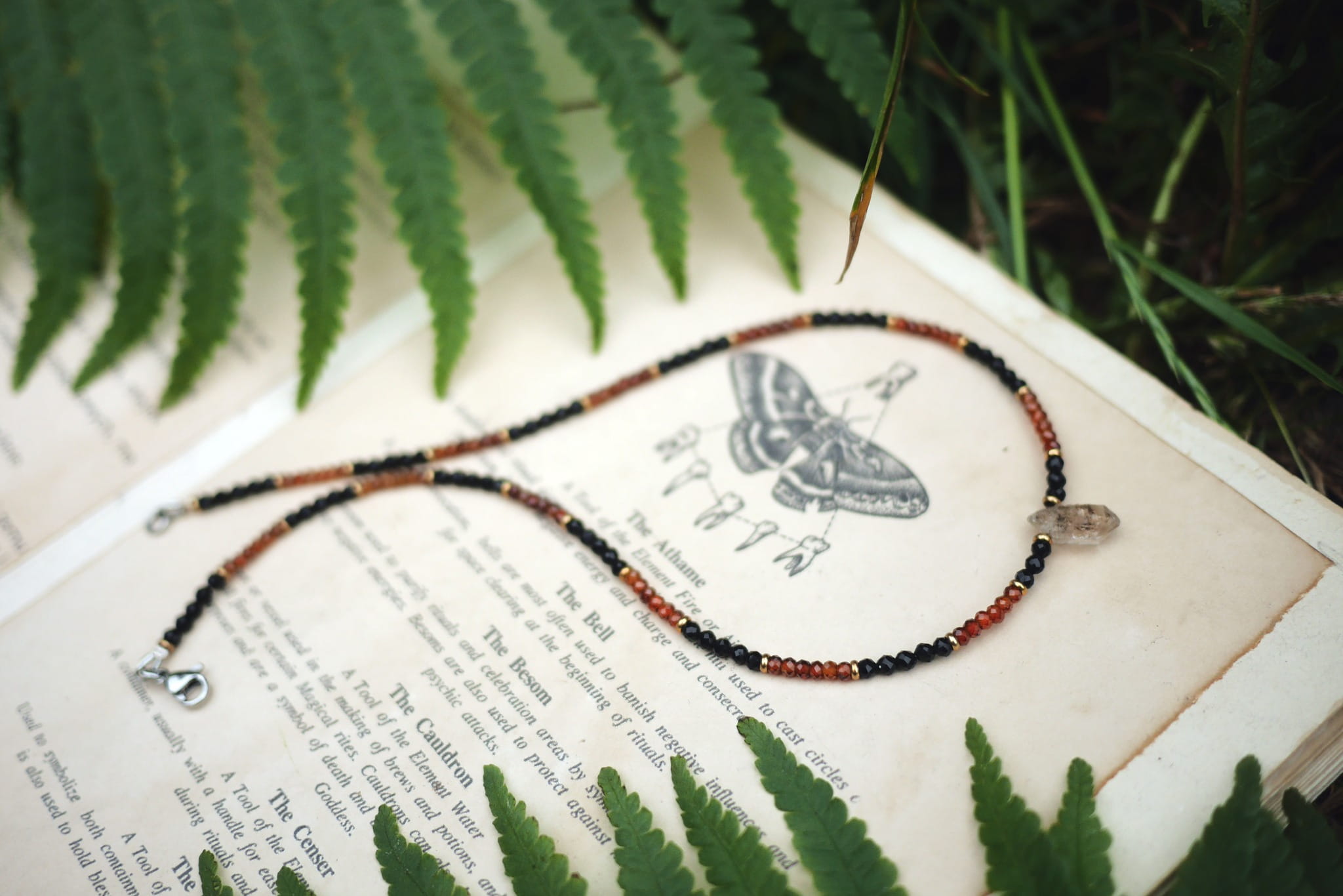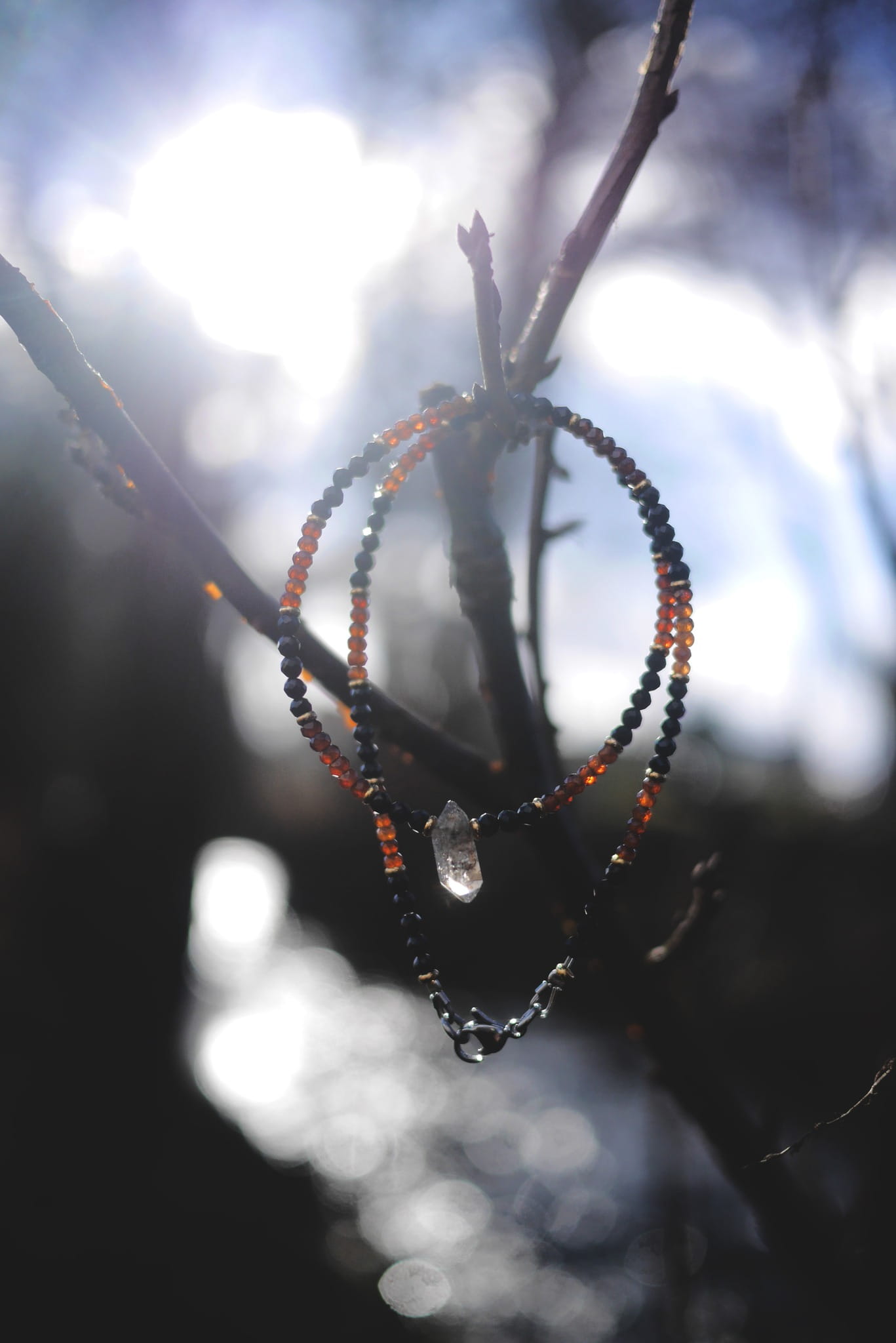 Czarny spinel, granat pomarańczowy oraz kwarc herkimer. Naszyjnik na lince jubilerskiej, zapinany na karabińczyk.