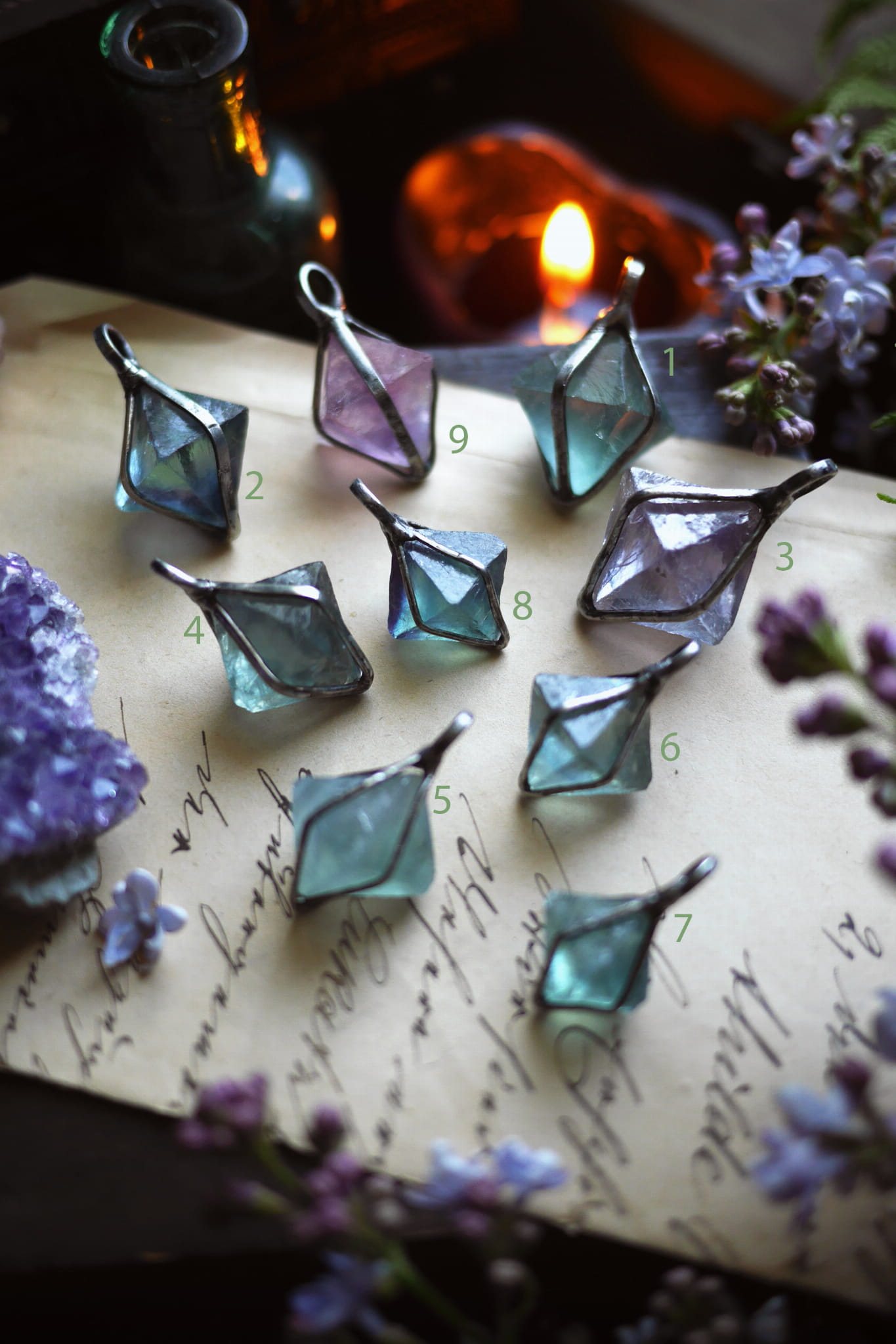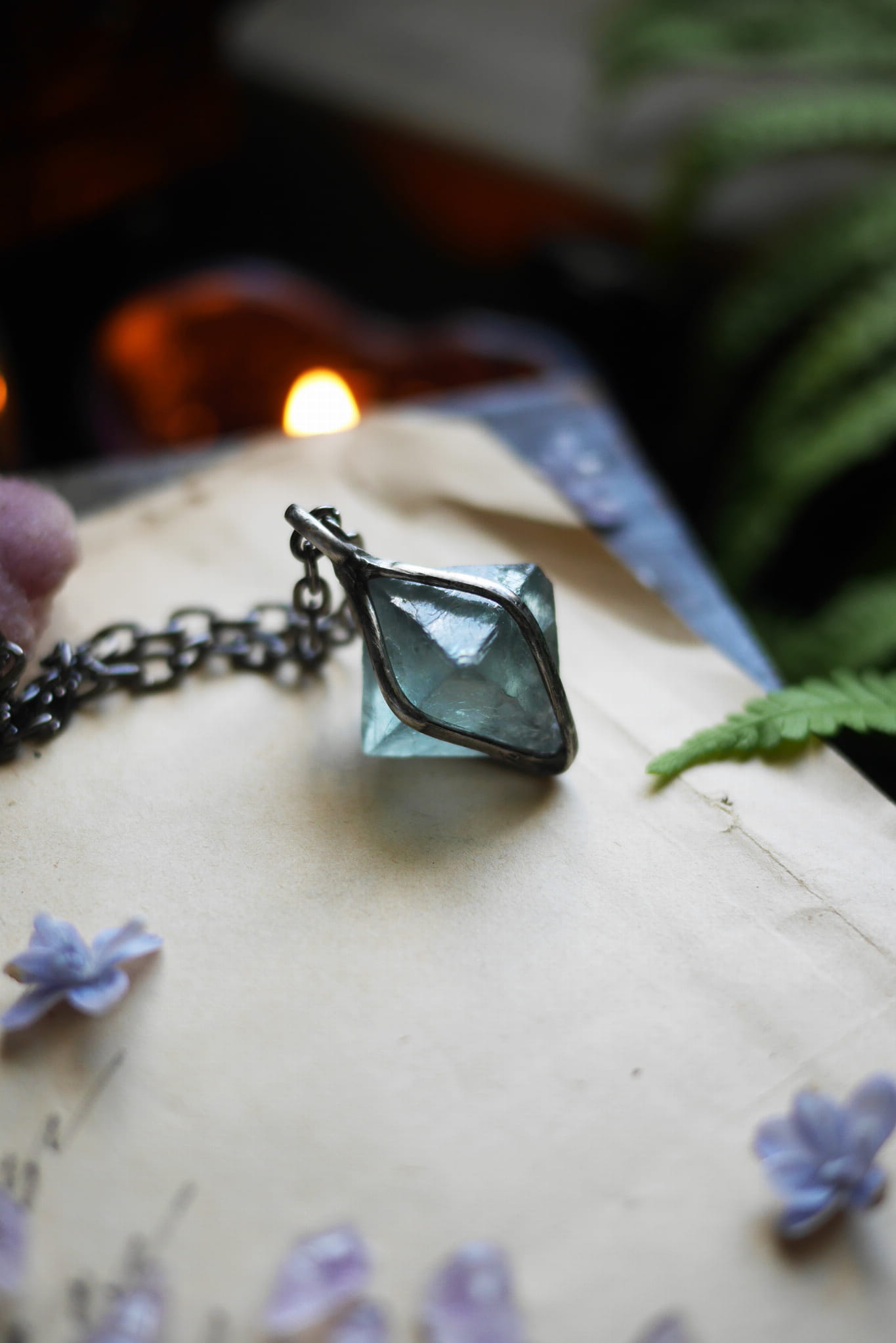 Kamień: Zielony fluoryt; surowy ośmiościan.