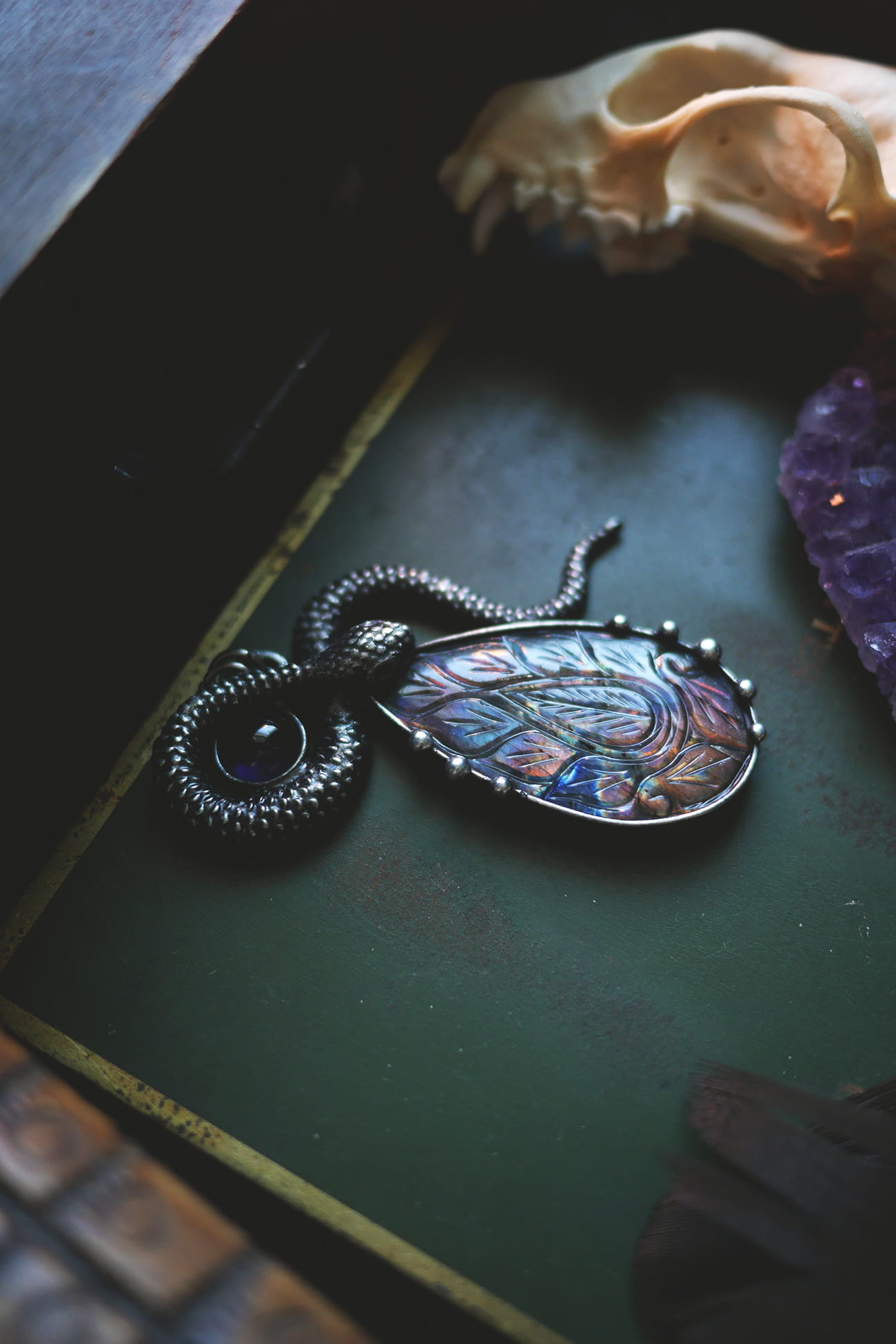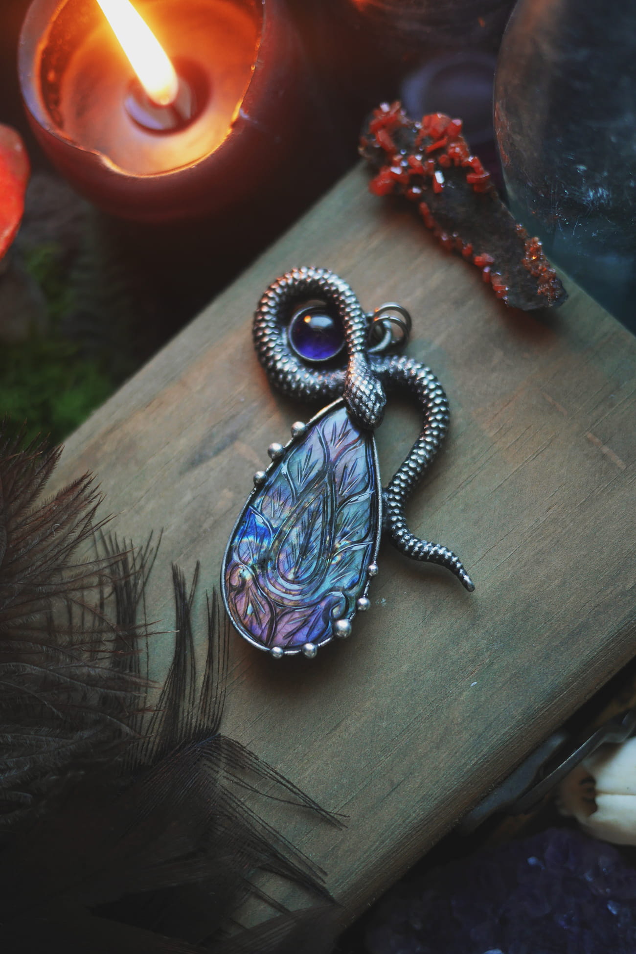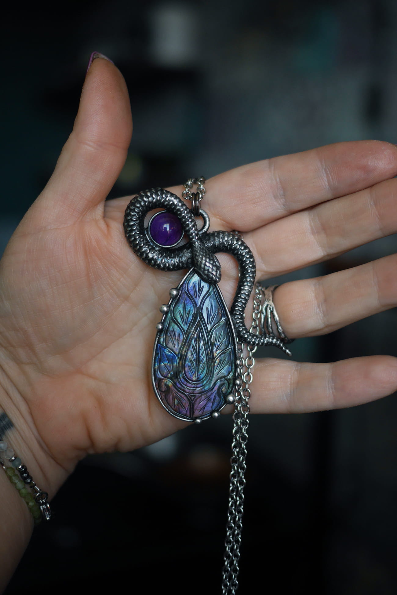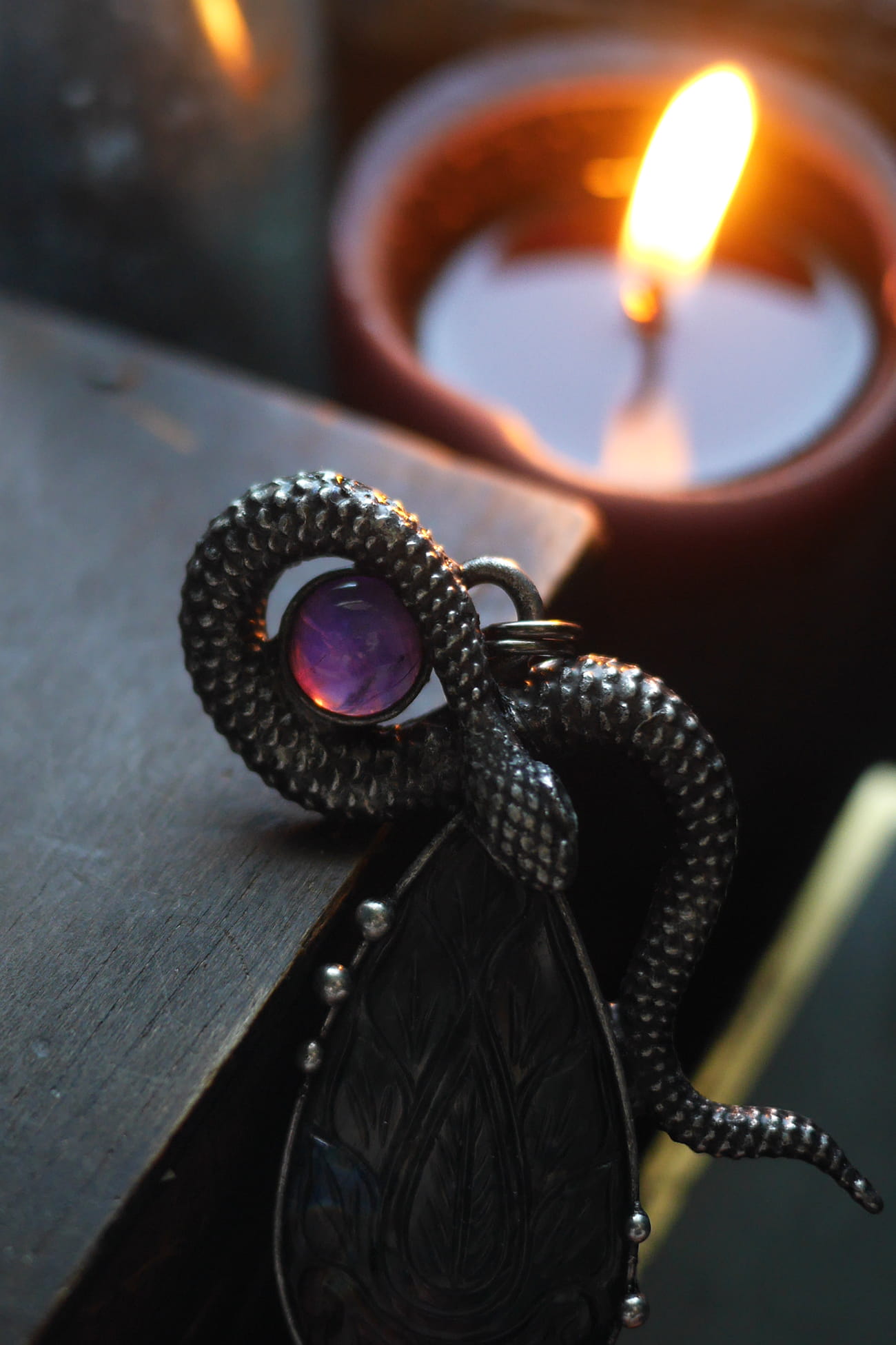 Kompozycja z wężem, ametystem oraz kuleczkami.