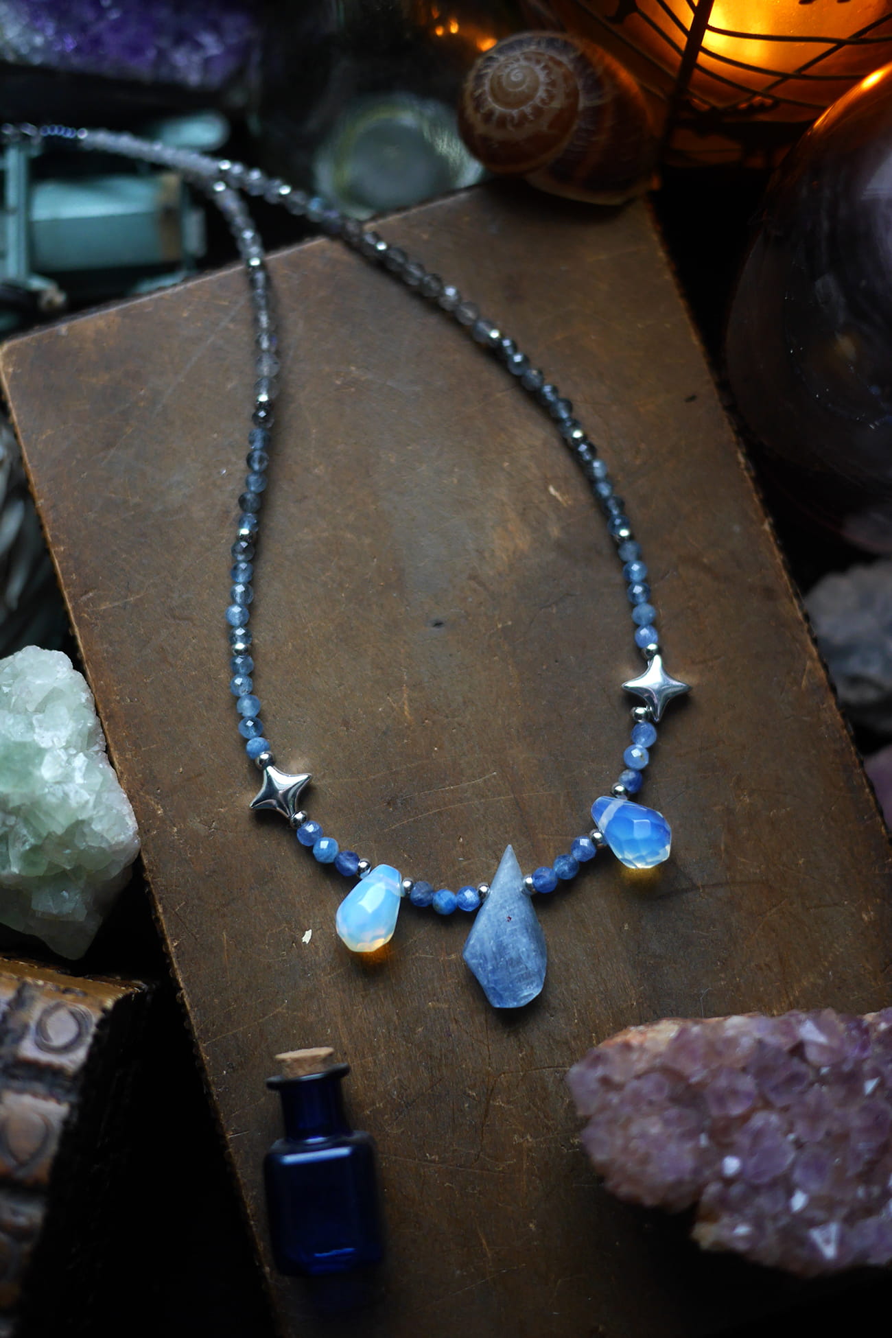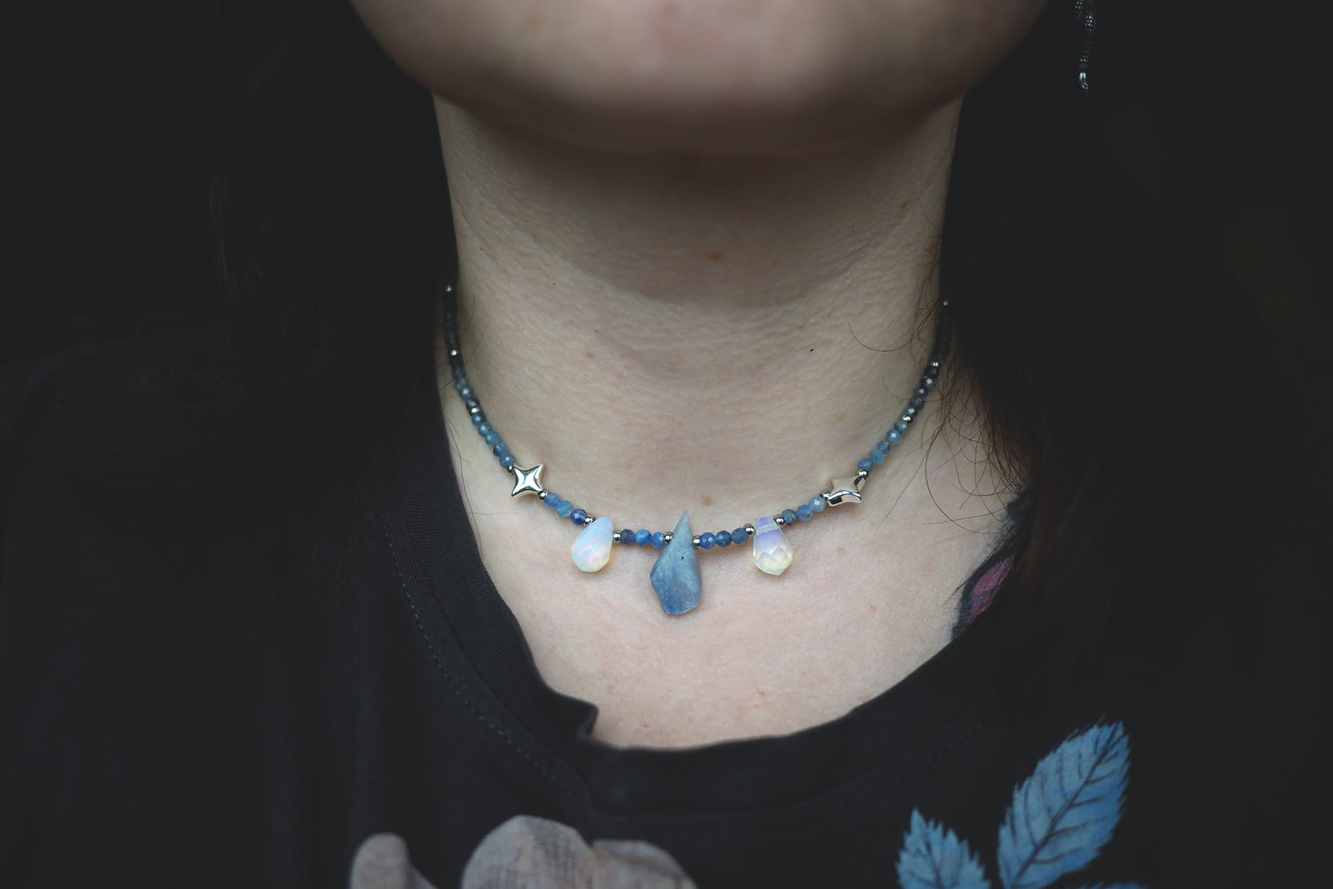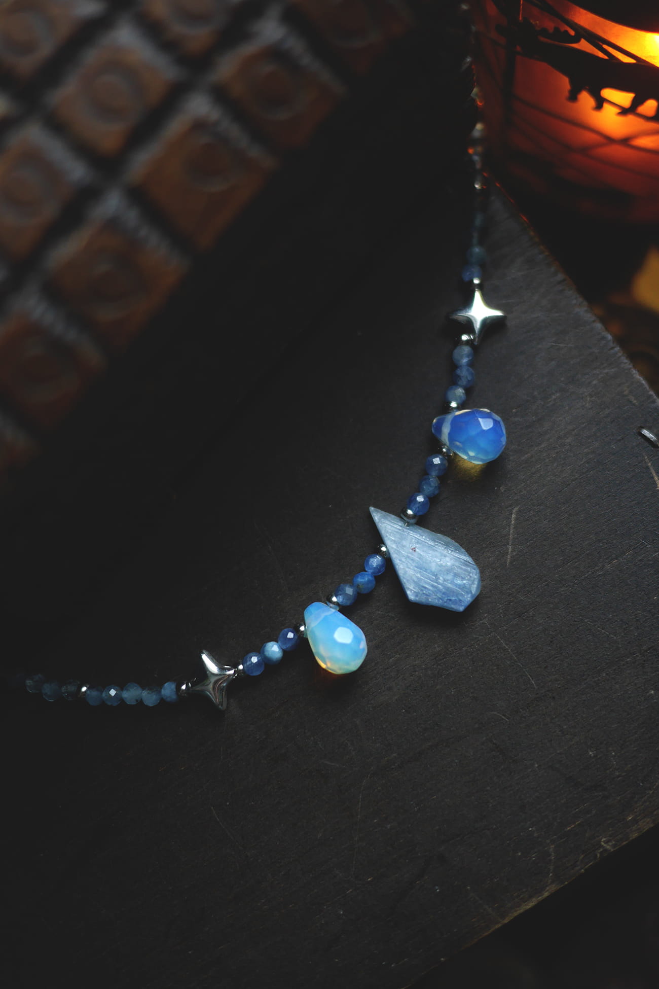 W centralnej części znajduje się kropelka niebieskiego kyanitu oraz dwie fasetowane kropelki z opalitu.