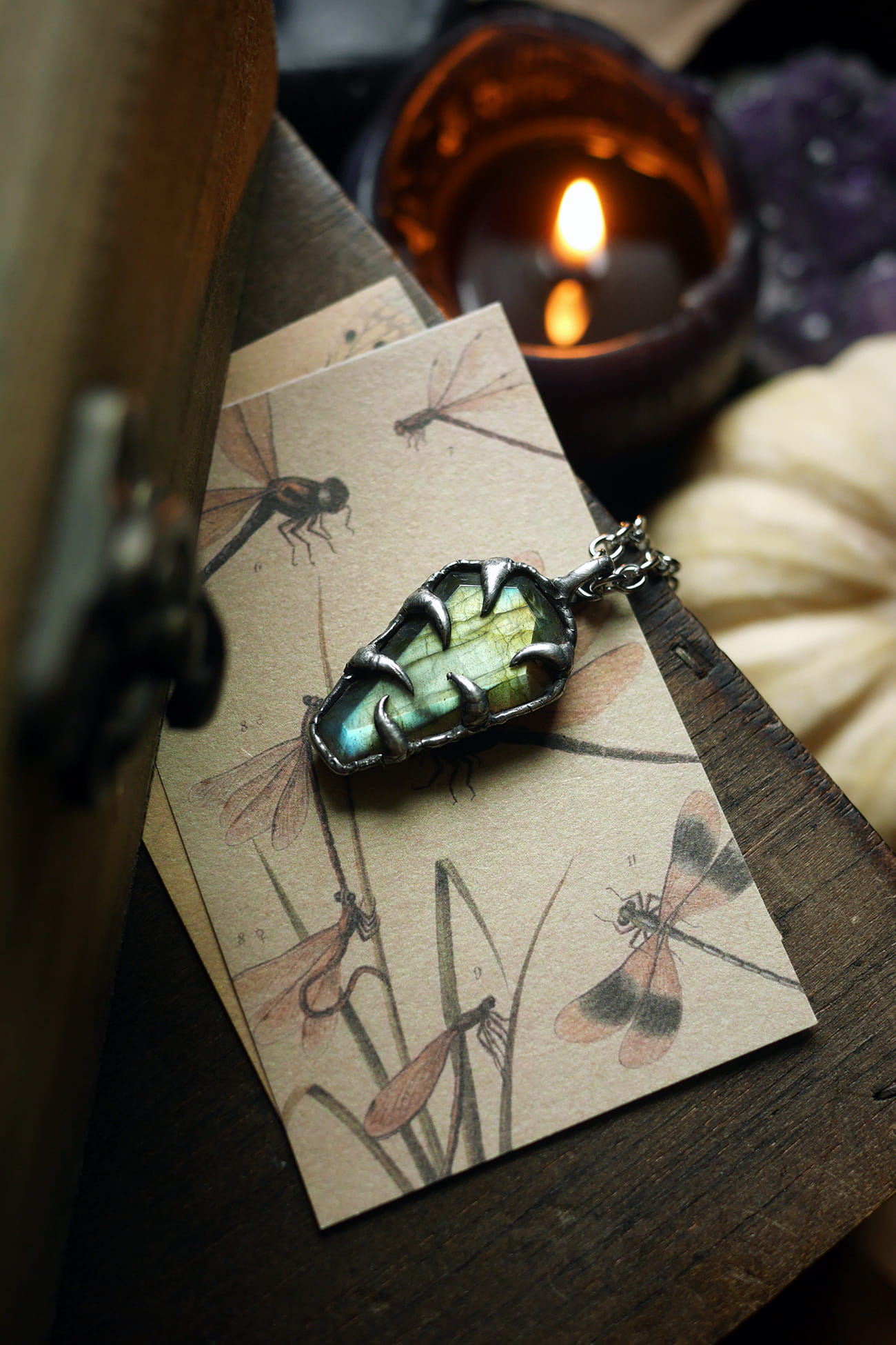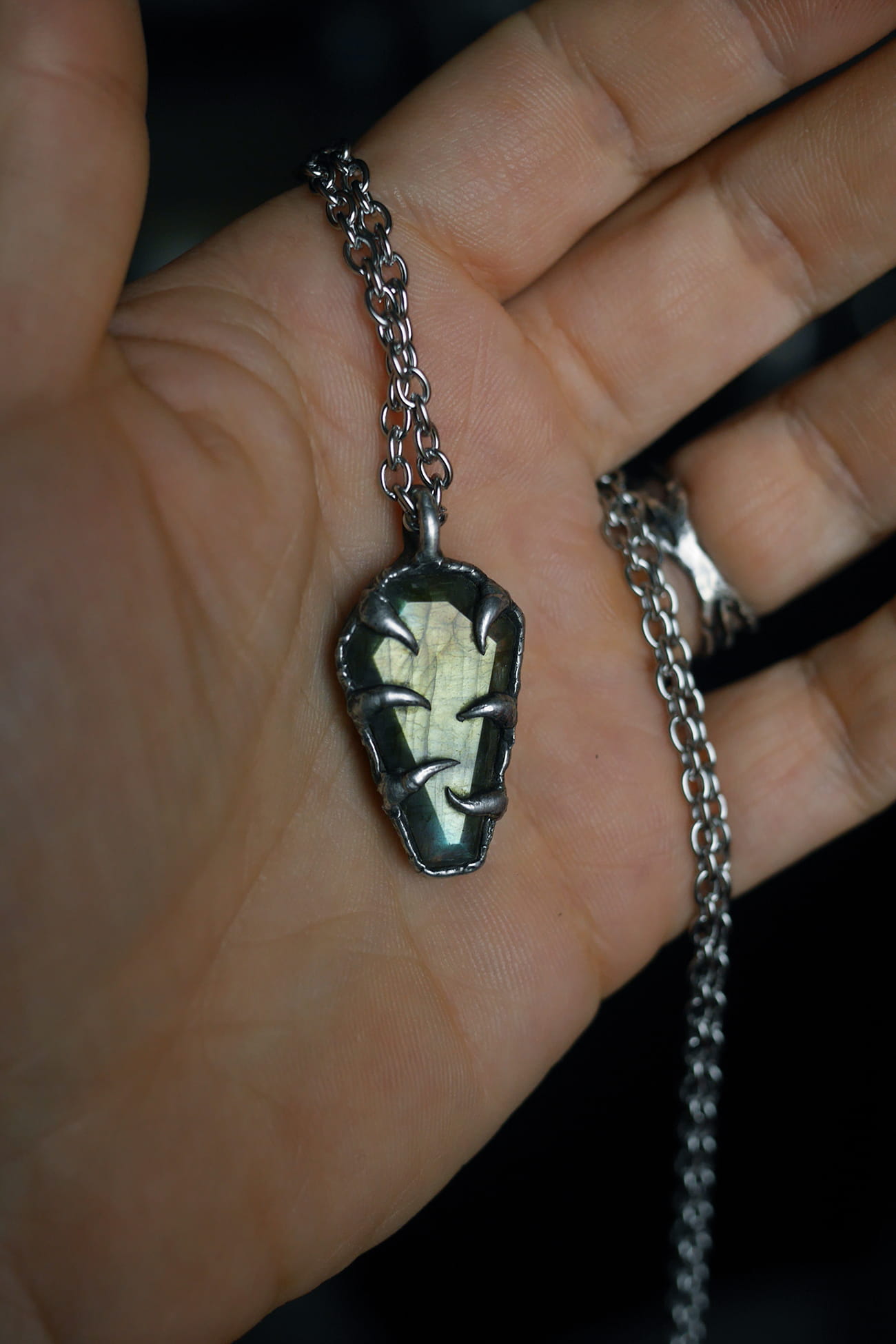 Labradoryt w kształcie trumienki w surowej oprawie z pazurkami.