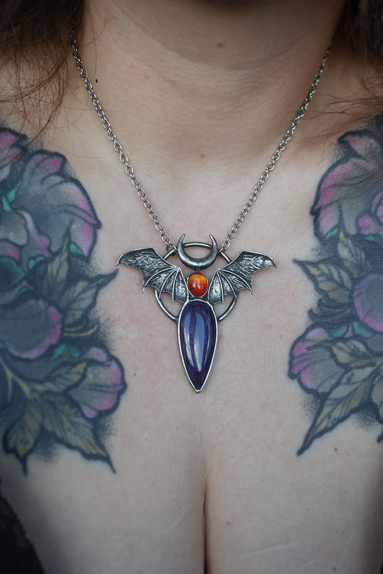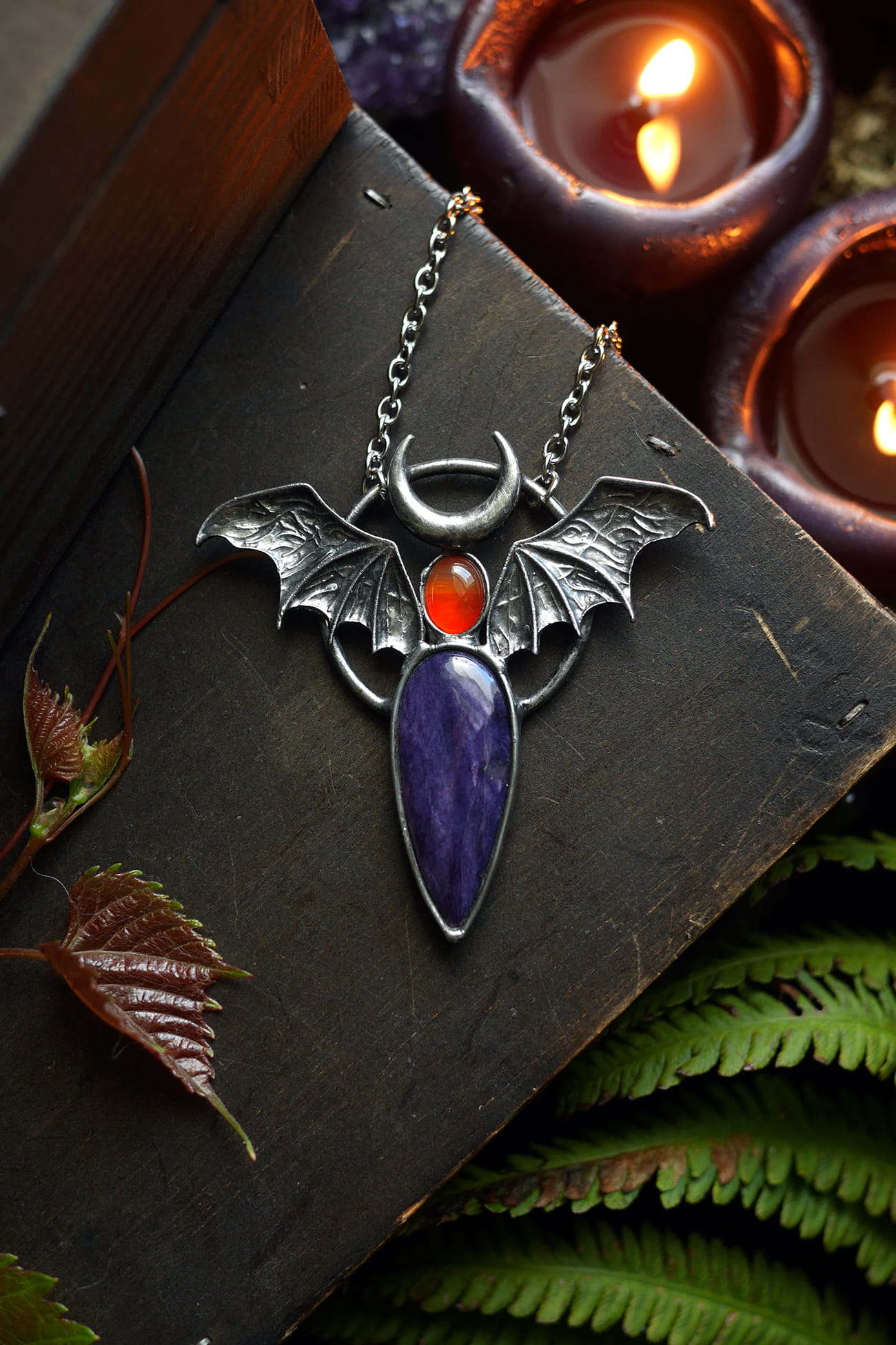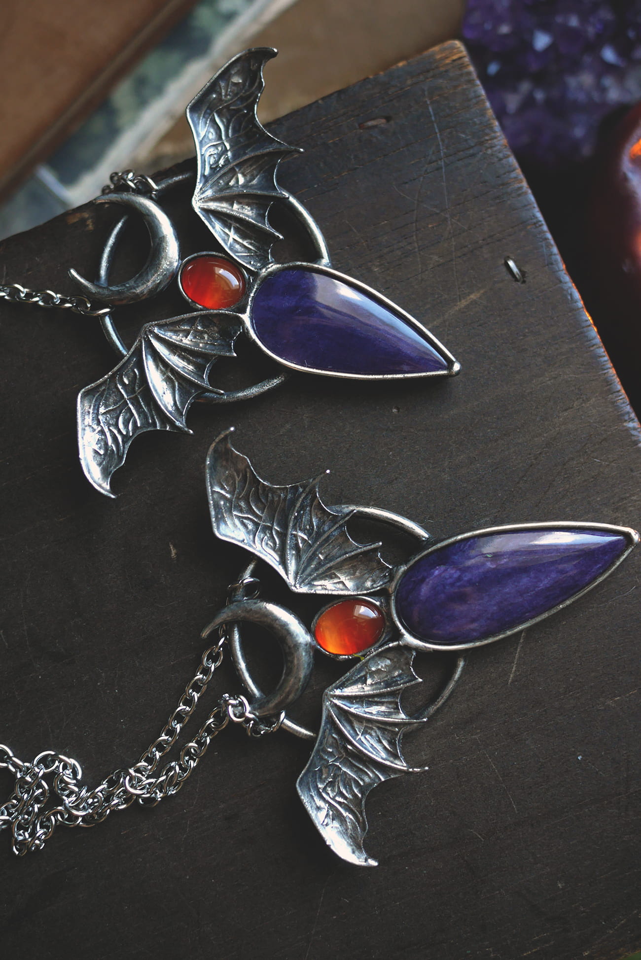 Uskrzydlony czaroit w połączeniu z półksiężycem oraz agatem pomarańczowym.
