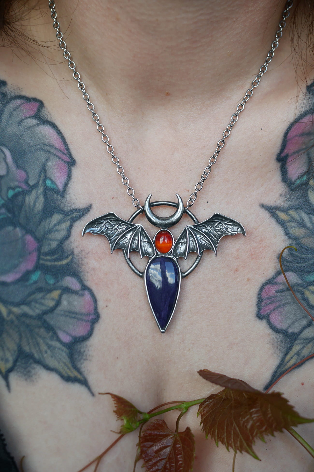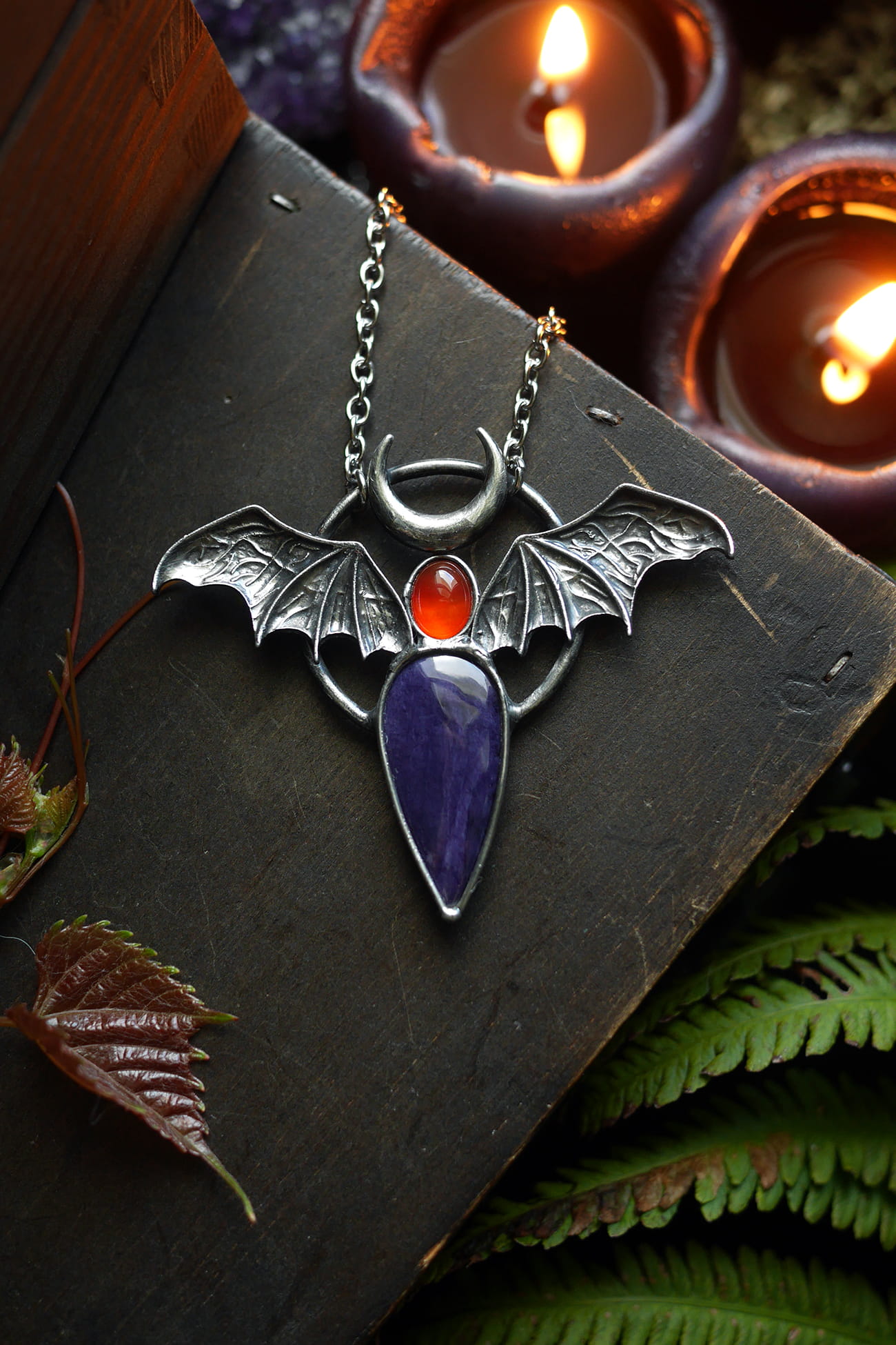 Uskrzydlony czaroit w połączeniu z półksiężycem oraz agatem pomarańczowym.