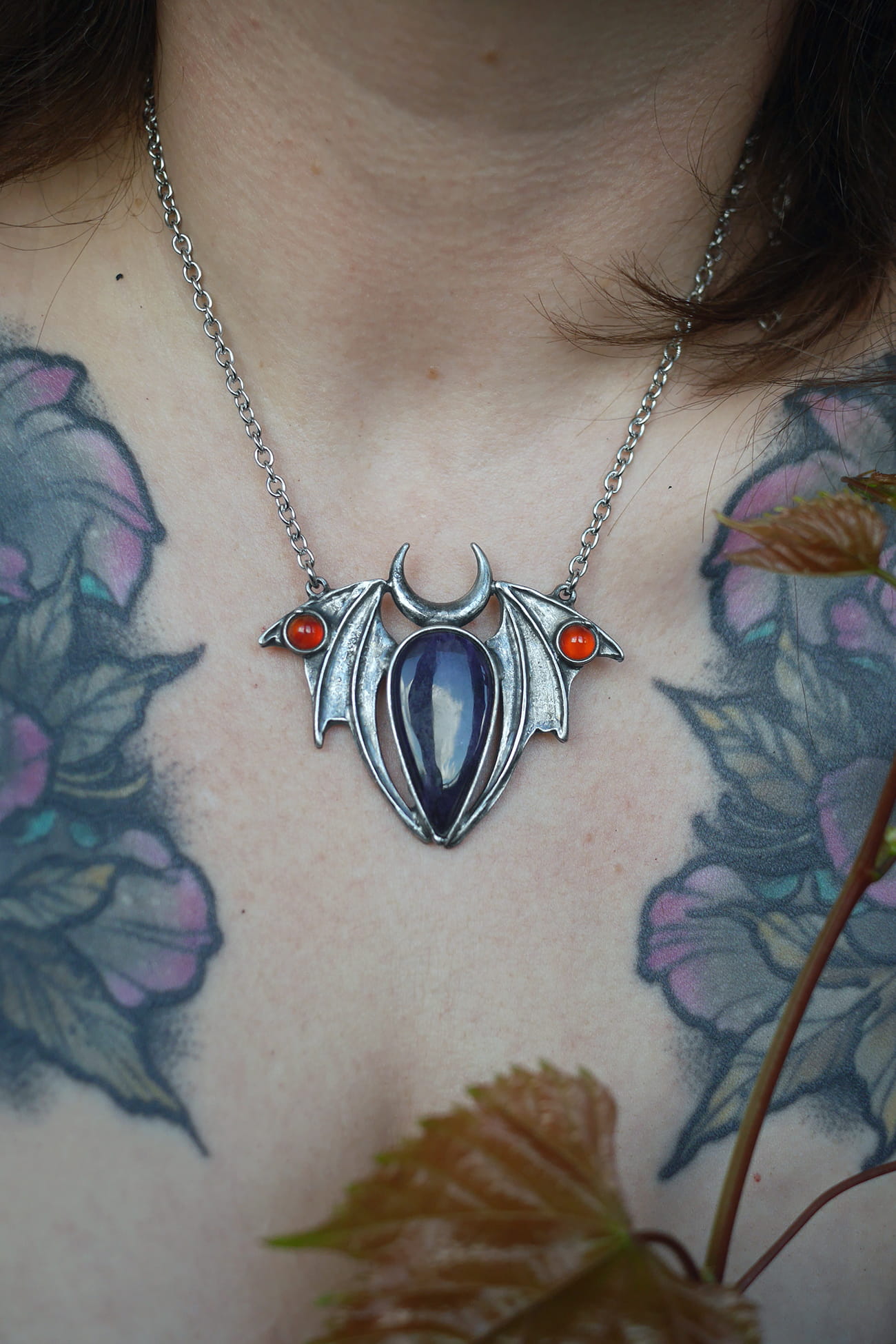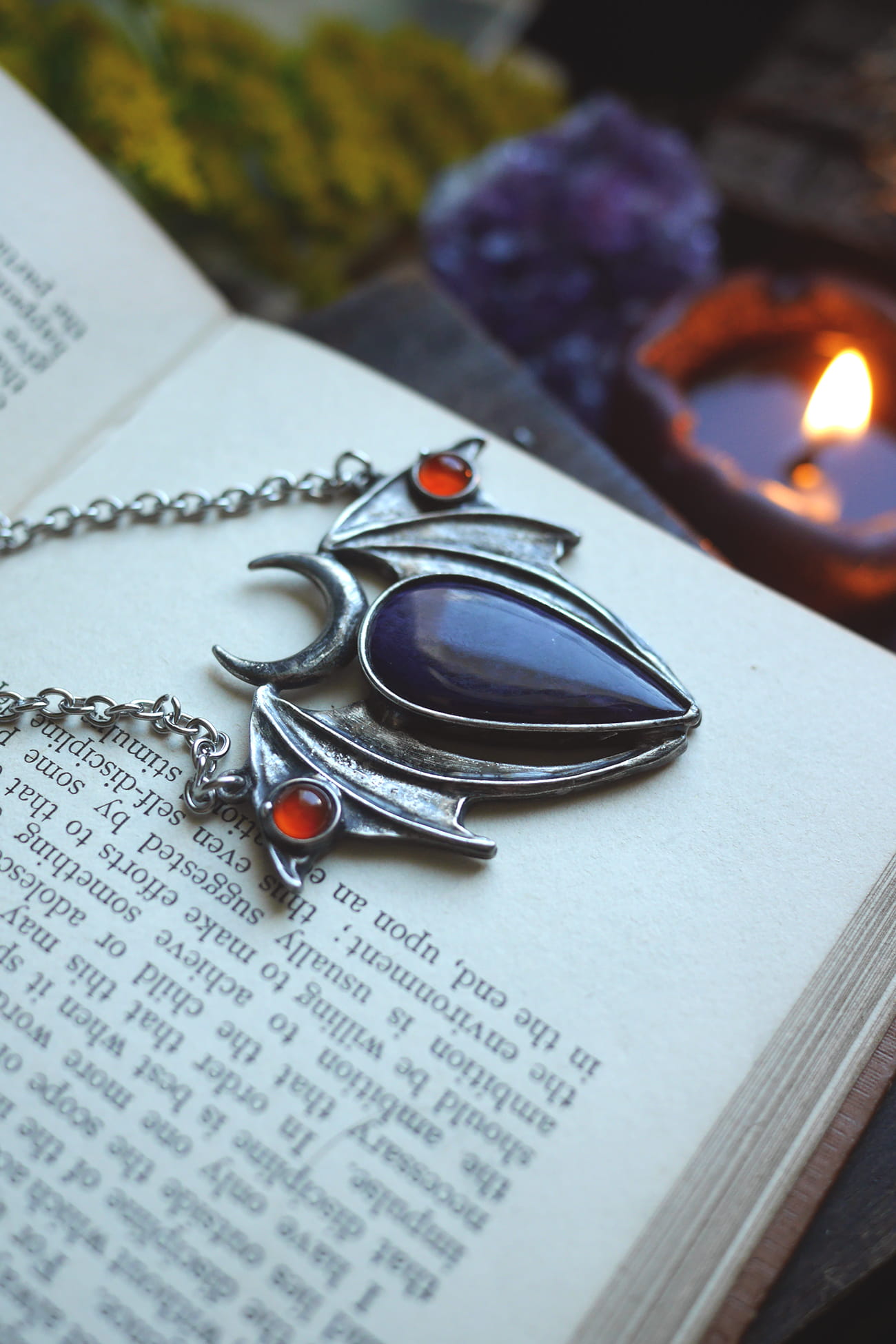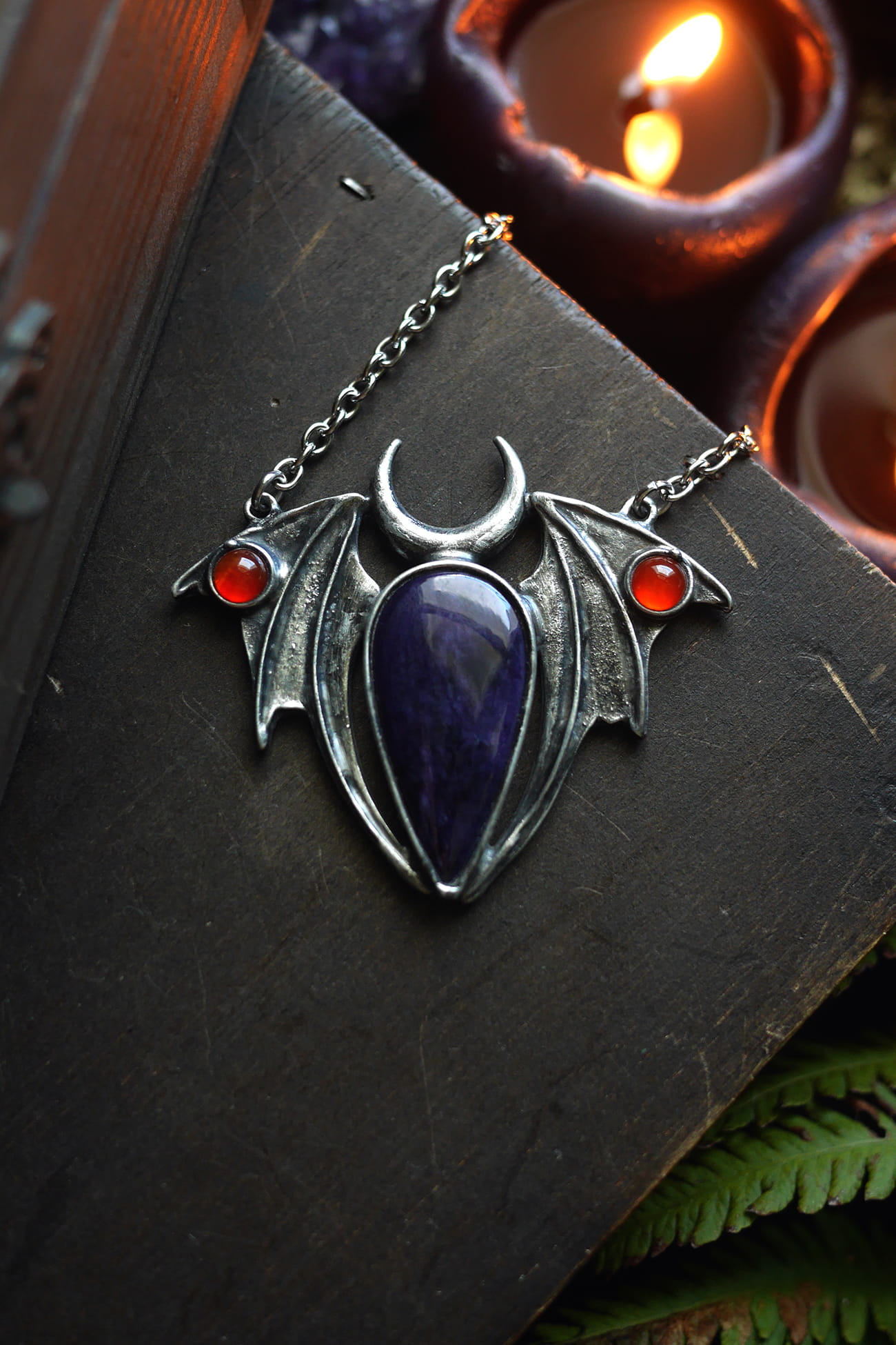 Uskrzydlony czaroit w połączeniu z półksiężycem oraz agatem pomarańczowym.