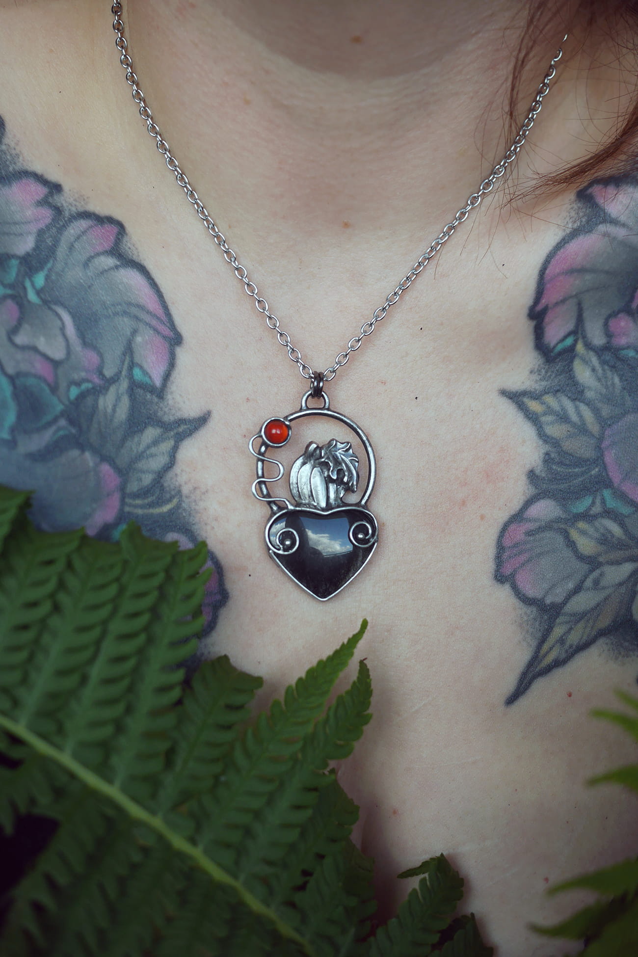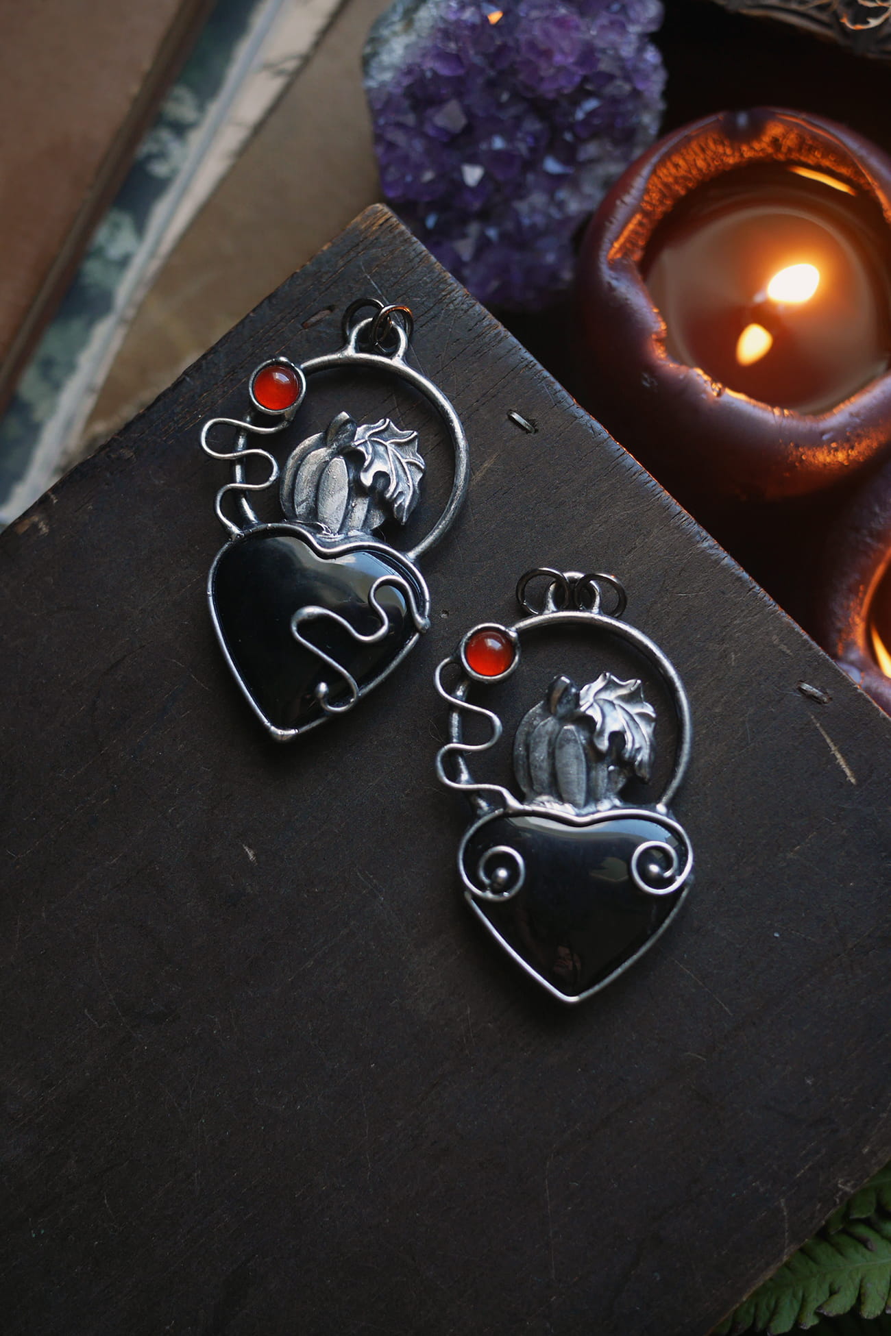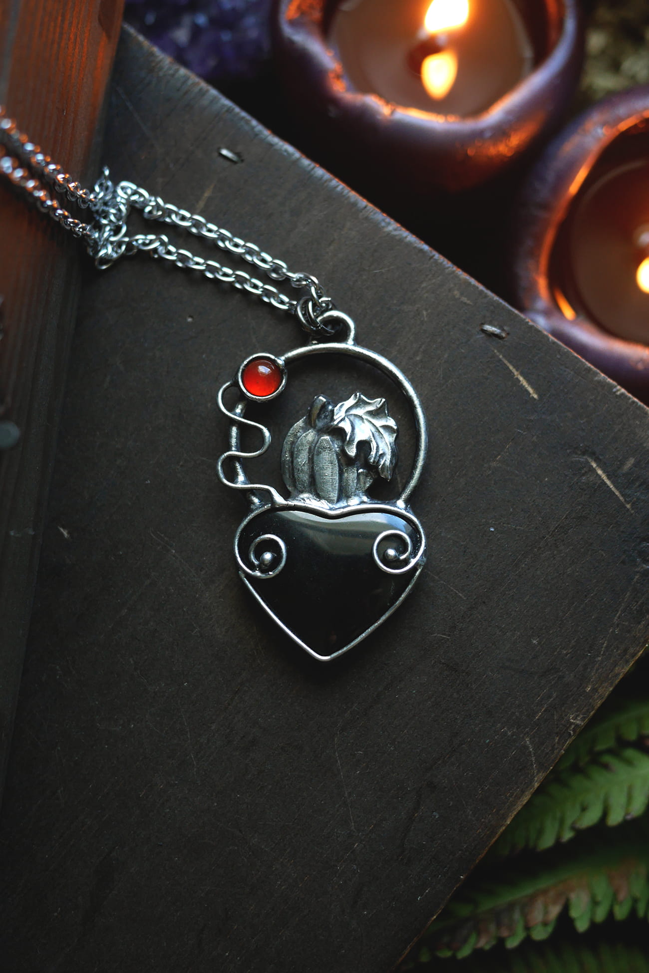 Czarne serce w połączeniu z dużą dynią, ozdobnymi pędami oraz agatem.