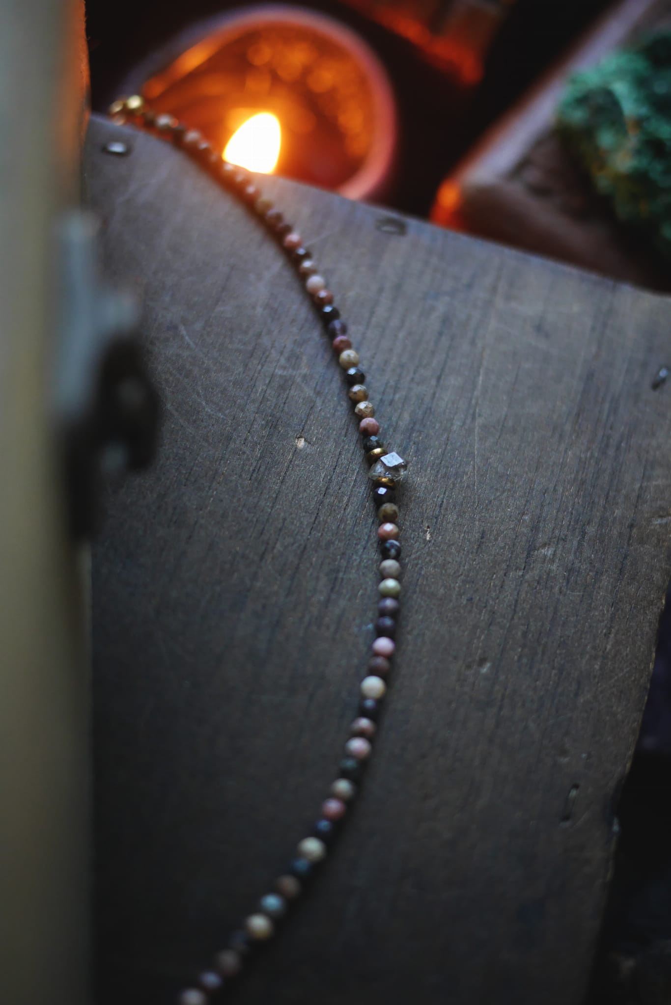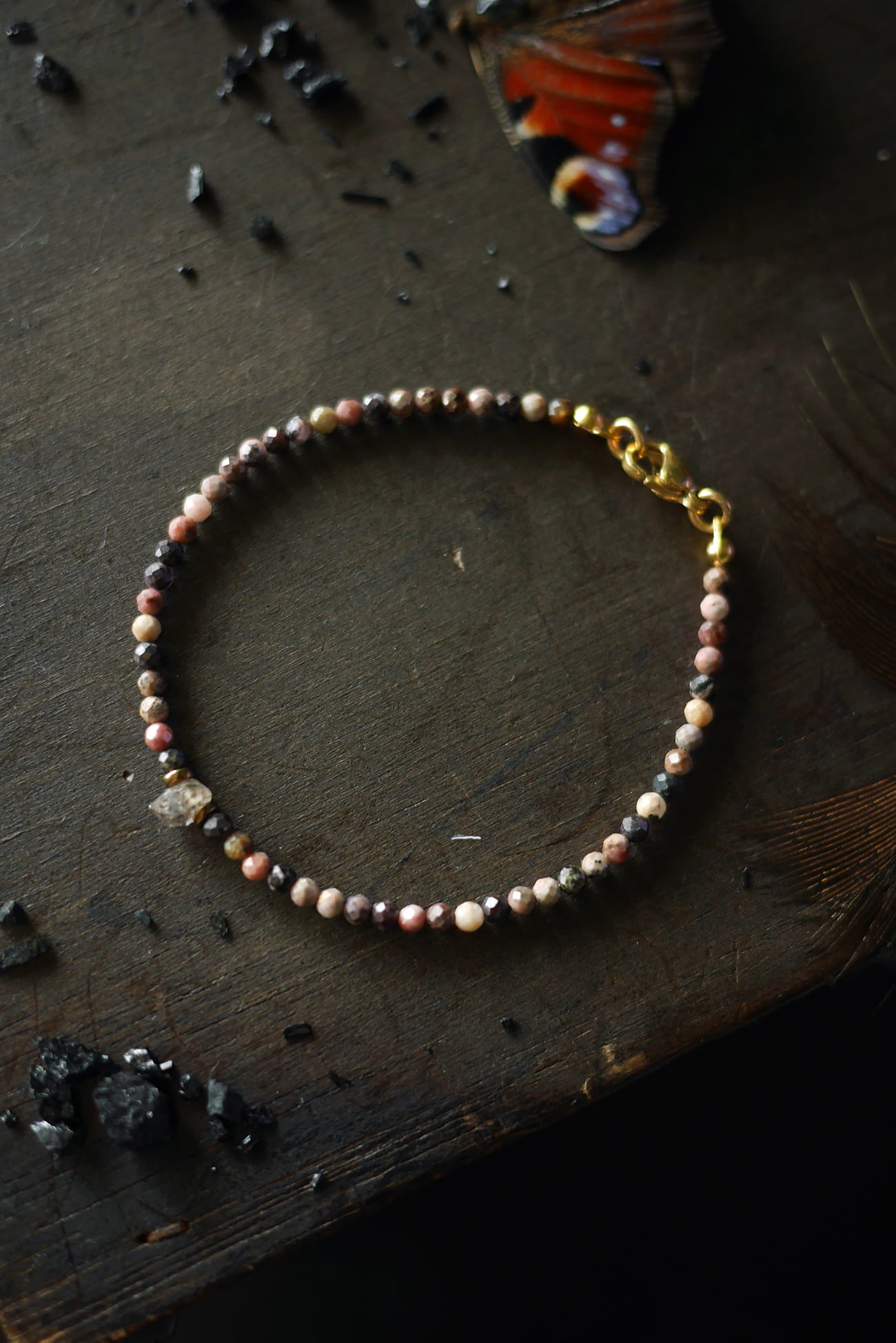 W centralnej części znajduje się kwarc herkimer. Przekładki oddzielające kamień brązowe, szklane.