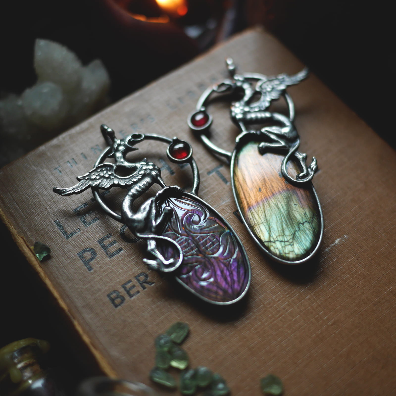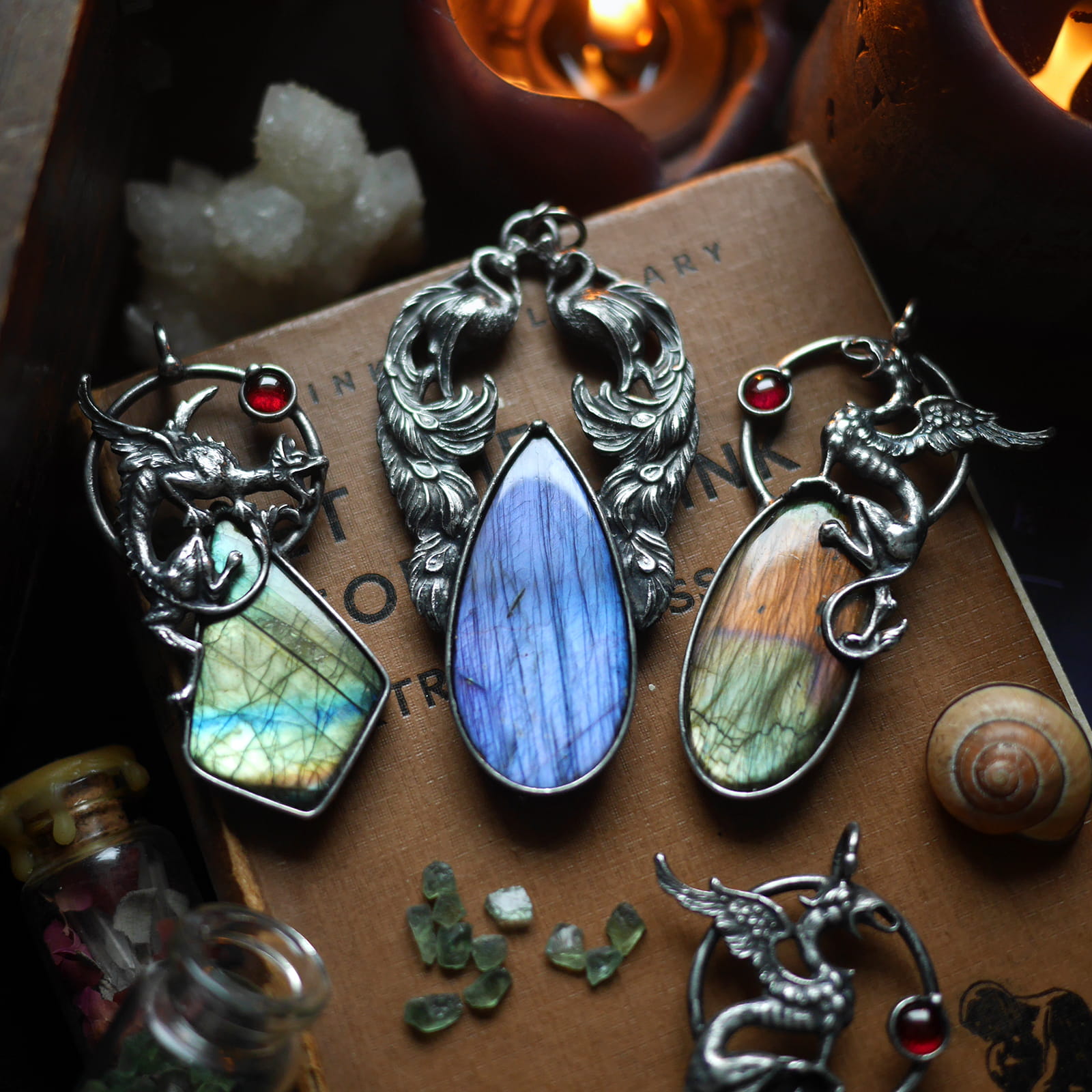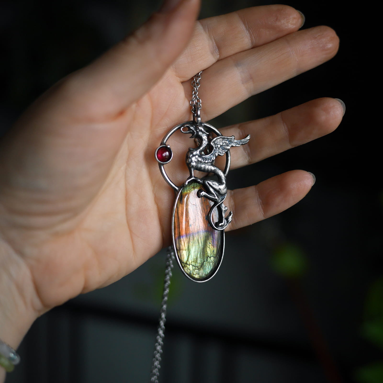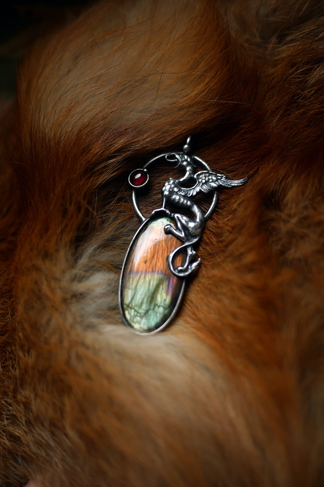 Kamień: labradoryt o pomarańczowo zielonym ogniu, czerwony granat.
