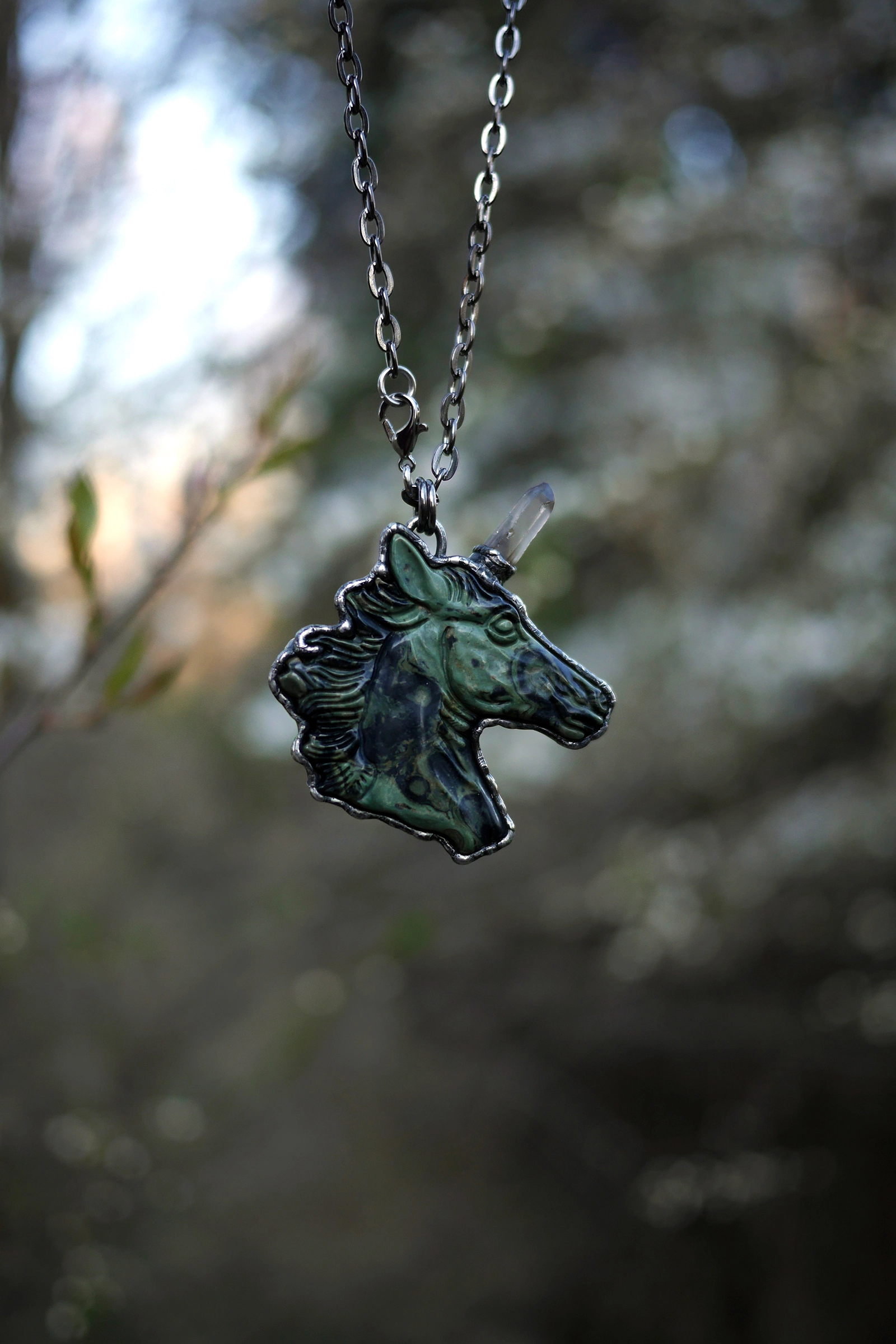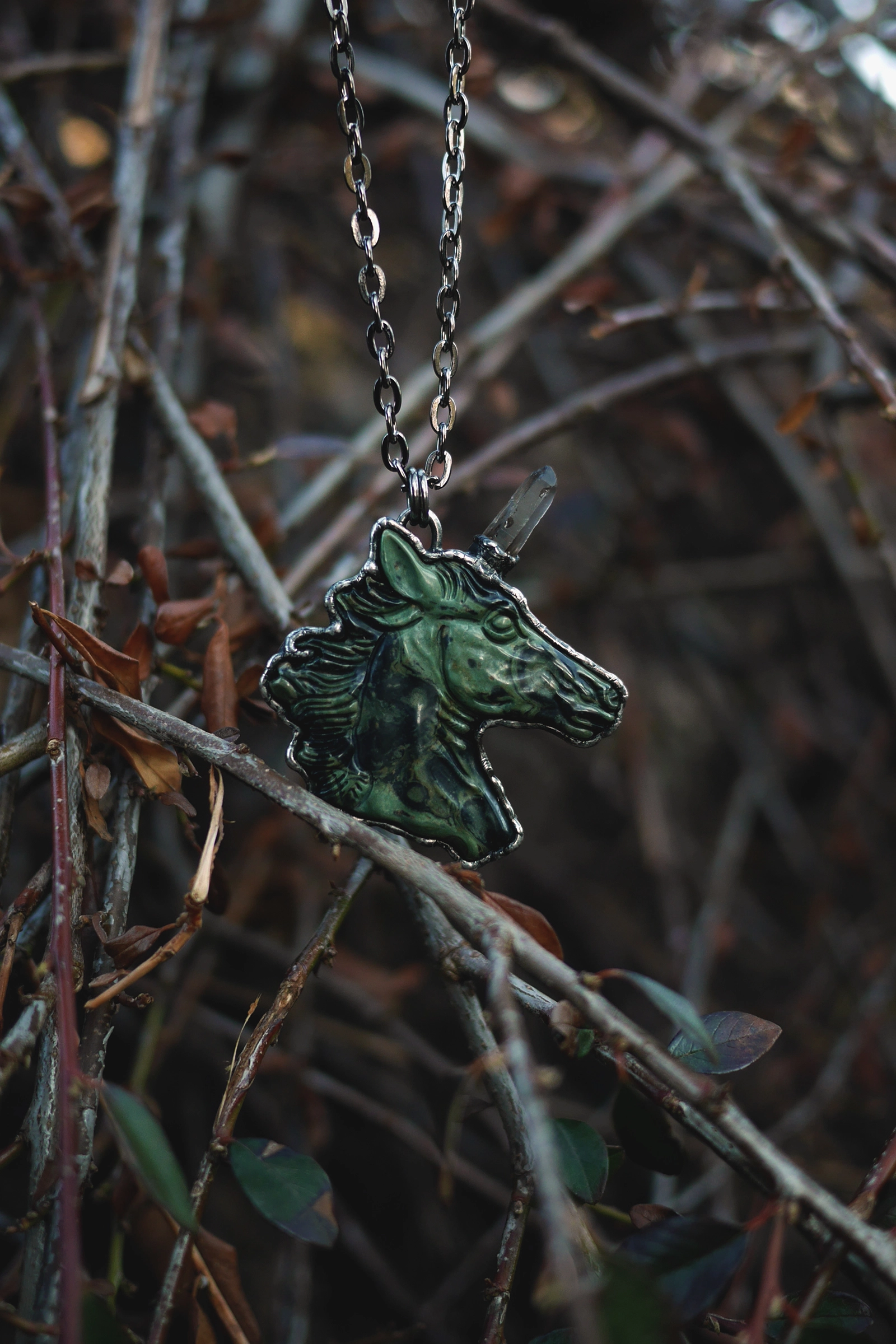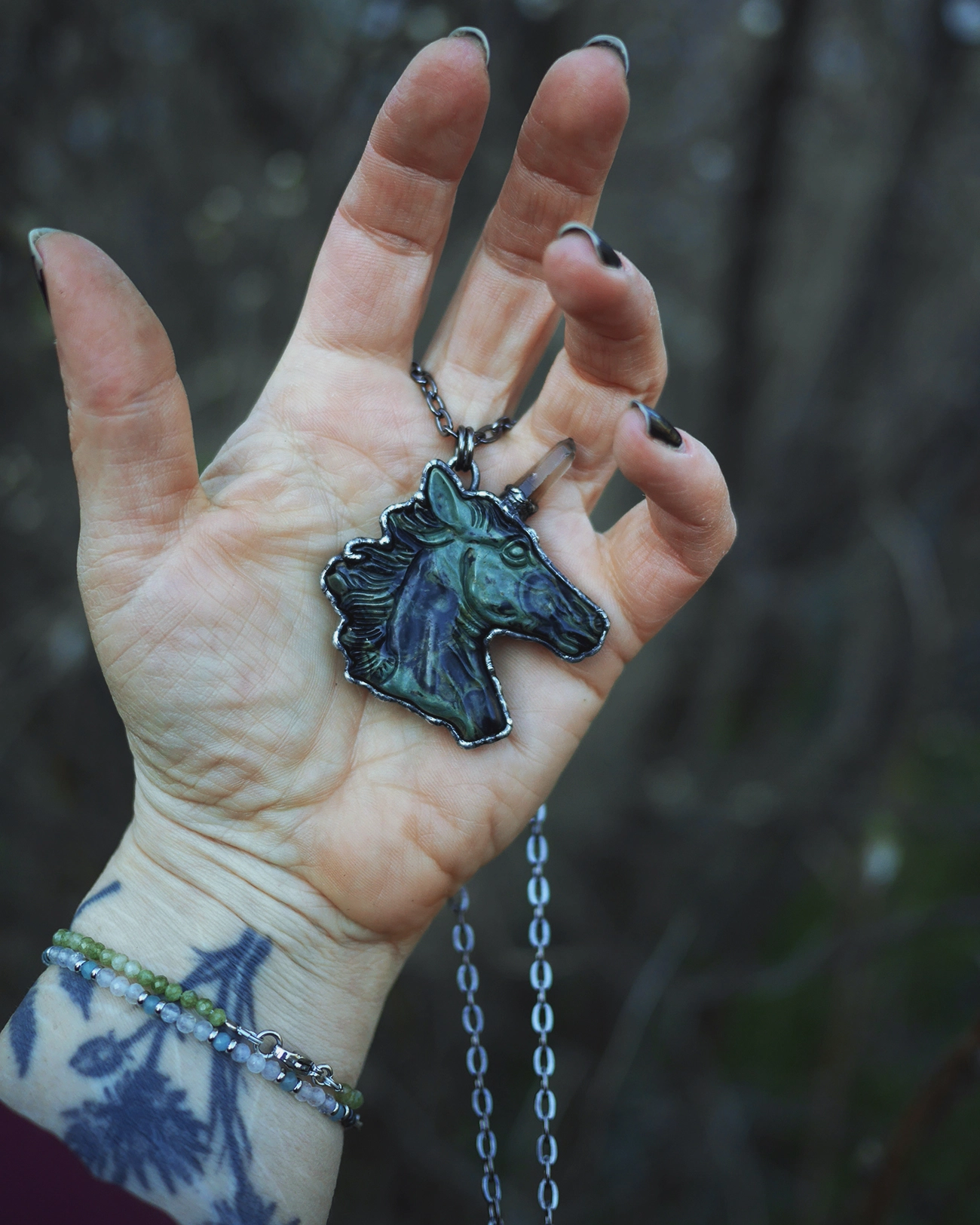 Kamień: rzeźbiony koń z jaspisu kambaba, surowy kwarc dymny.
