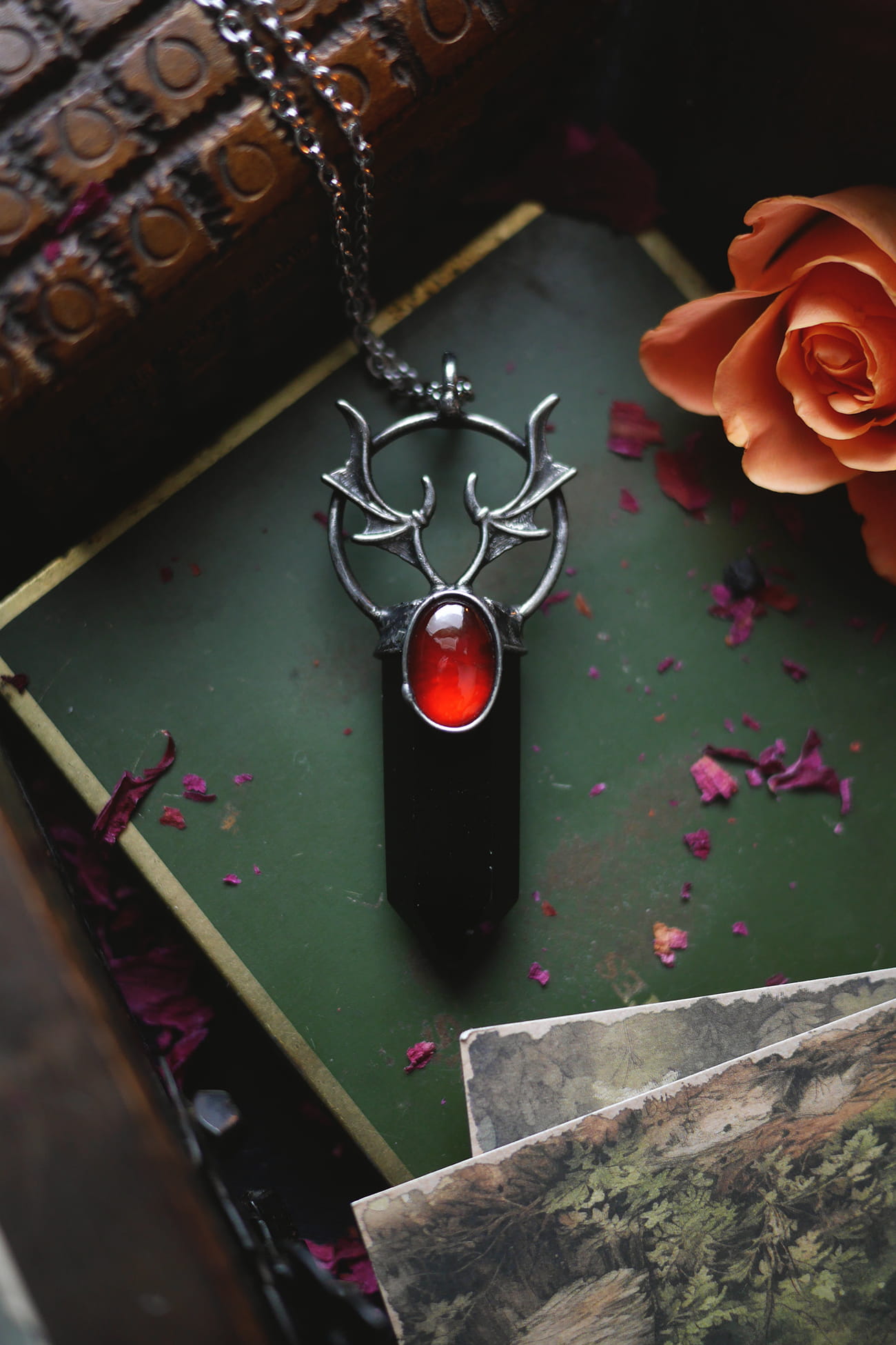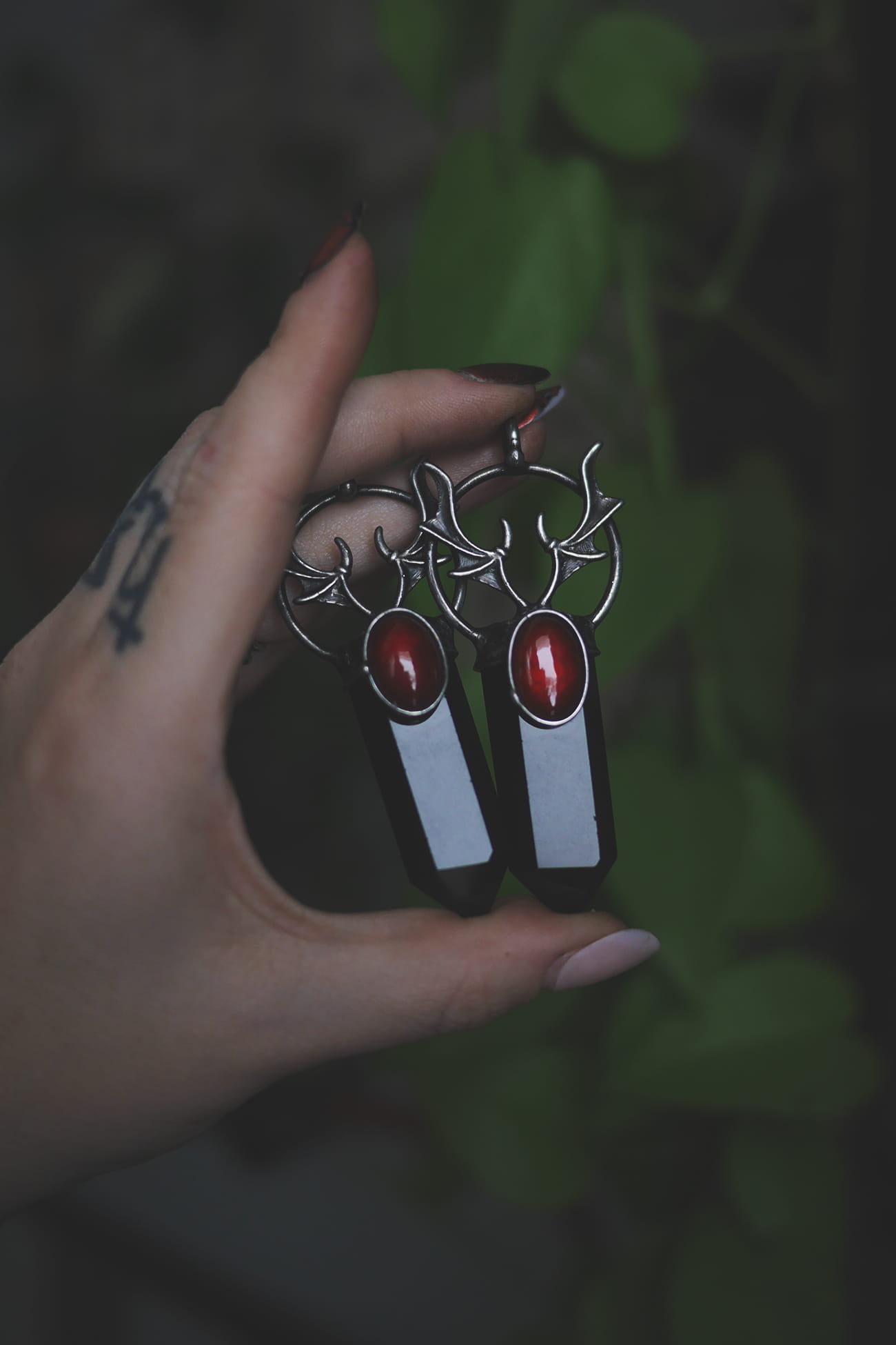 Obsydian szlifowany w szpic w połączeniu z granatem oraz skrzydełkami nietoperza na obręczy.