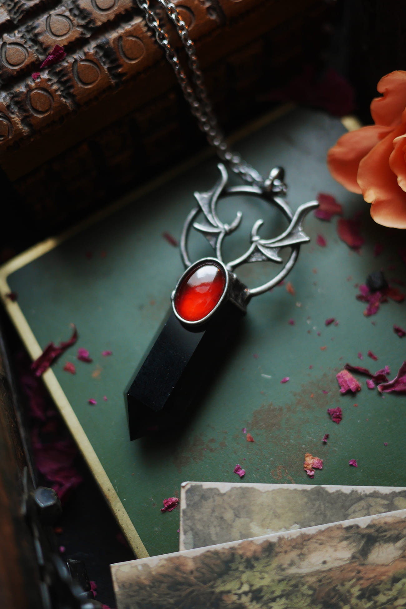 Kamień: czarny obsydian szlifowany w szpic, owalny czerwony granat.
