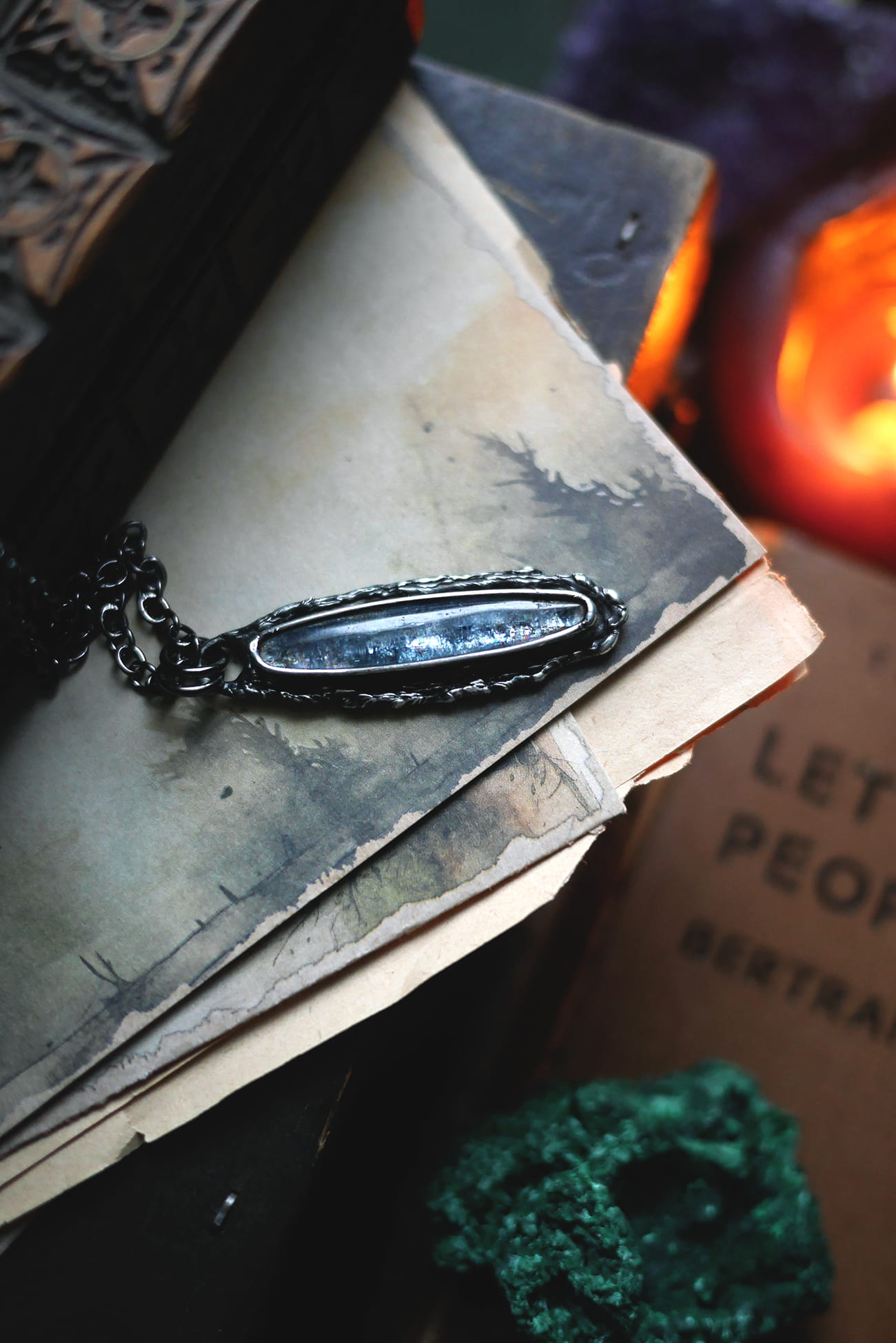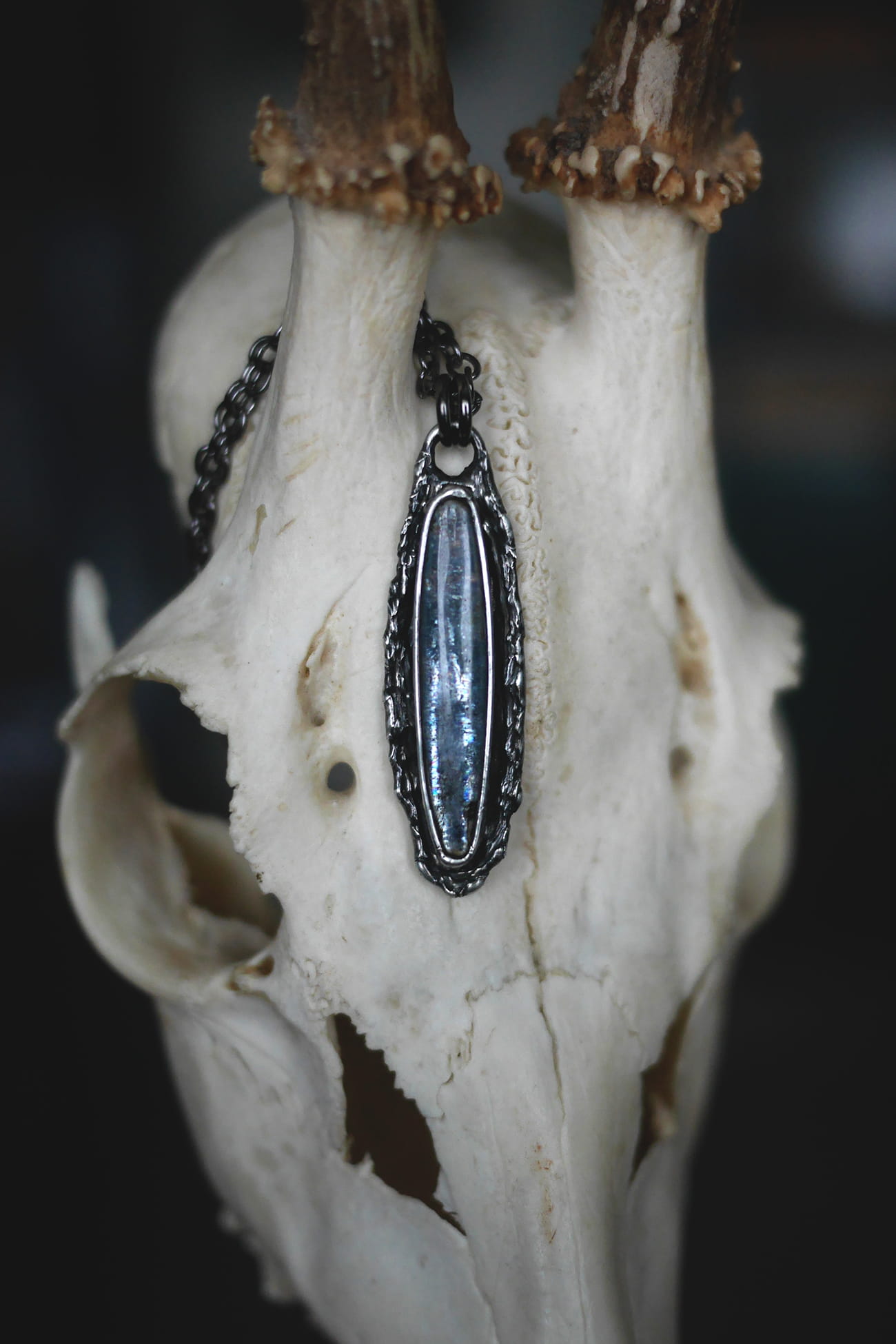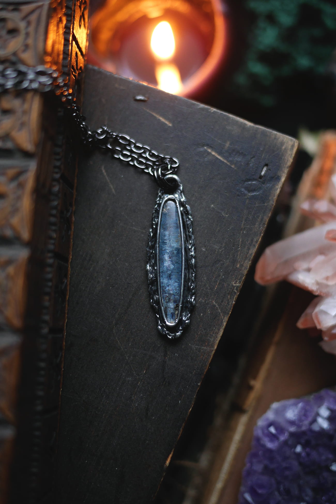 Niebieski kyanit w surowej oprawie z miedzi i cyny.