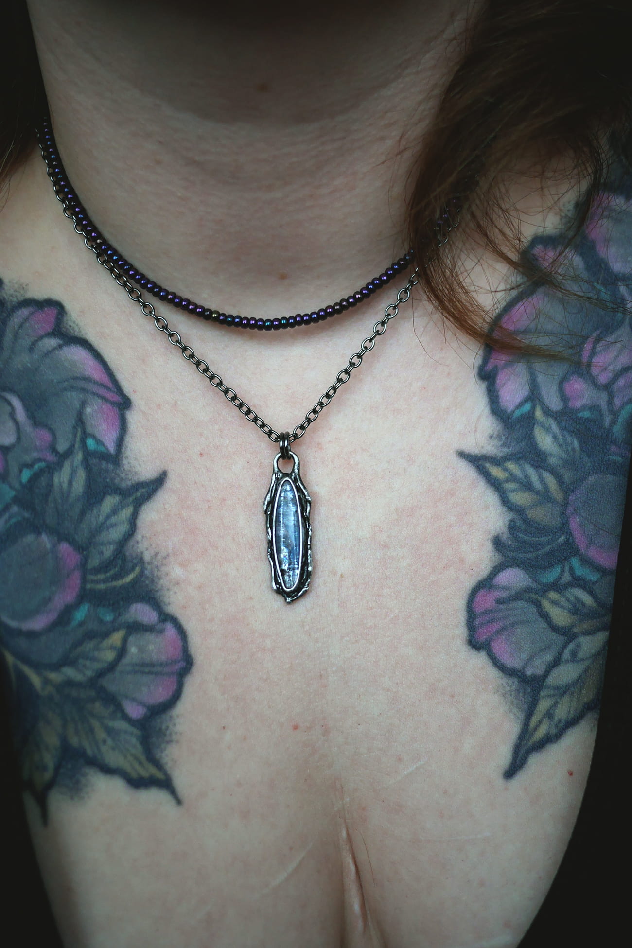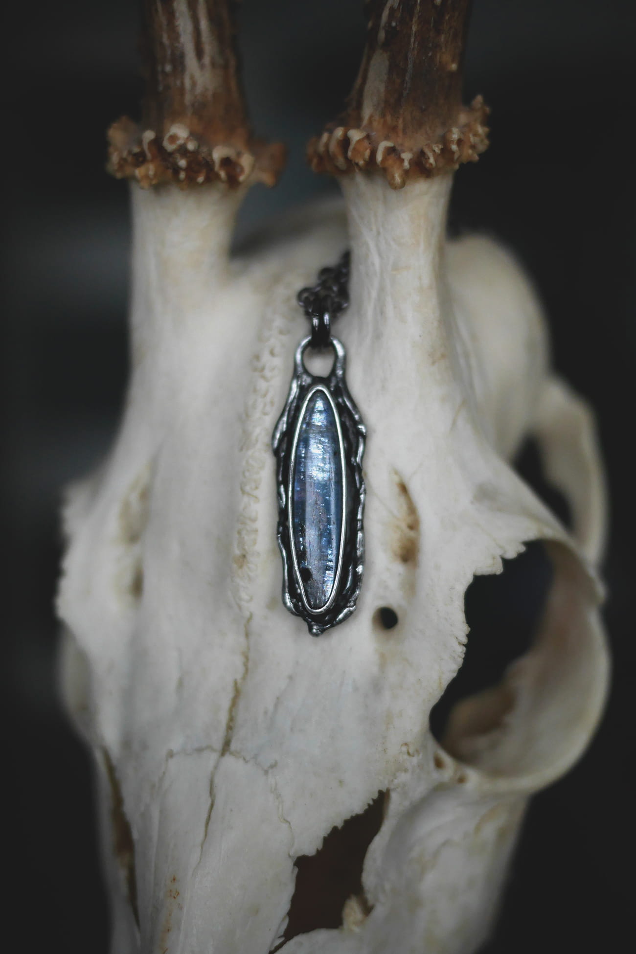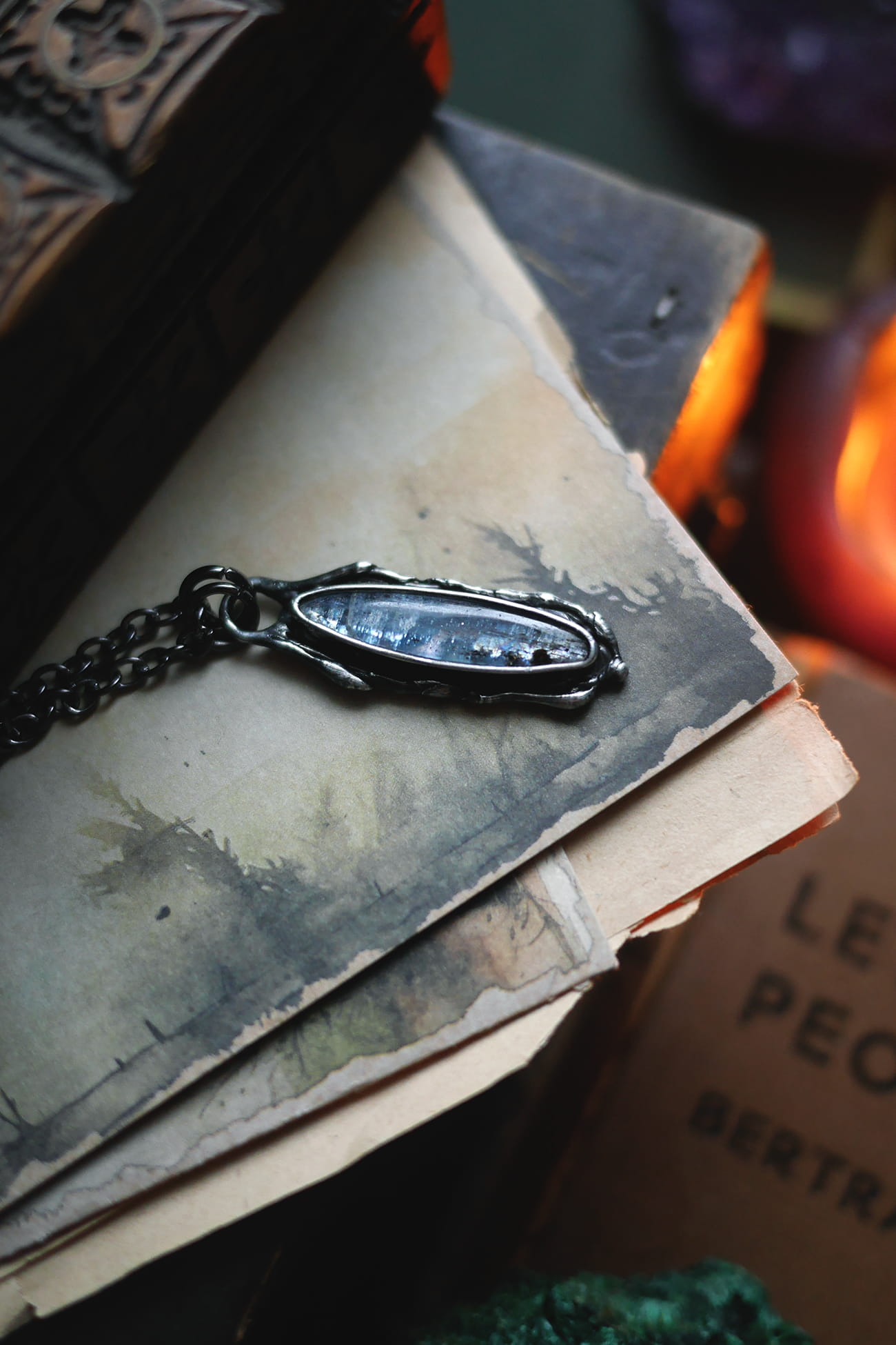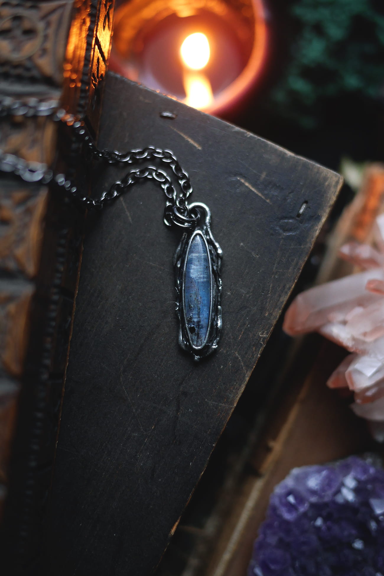 Niebieski kyanit w surowej oprawie z miedzi i cyny.