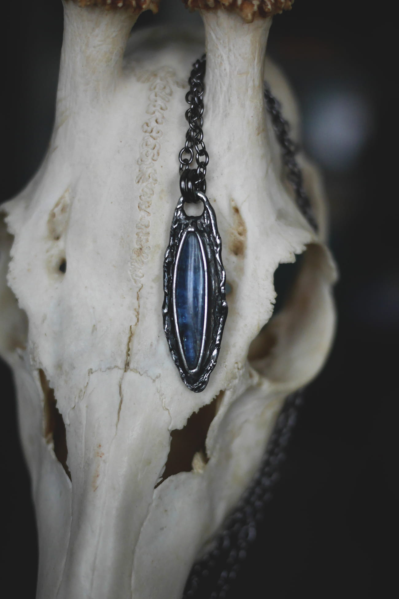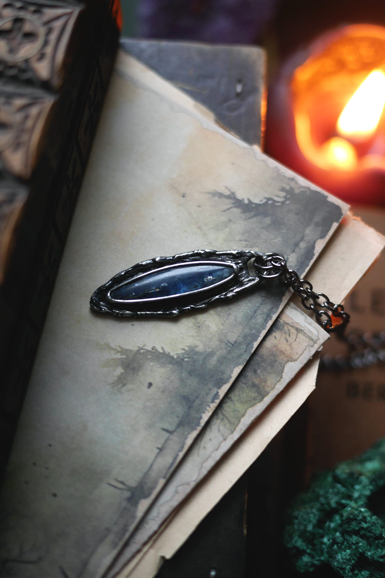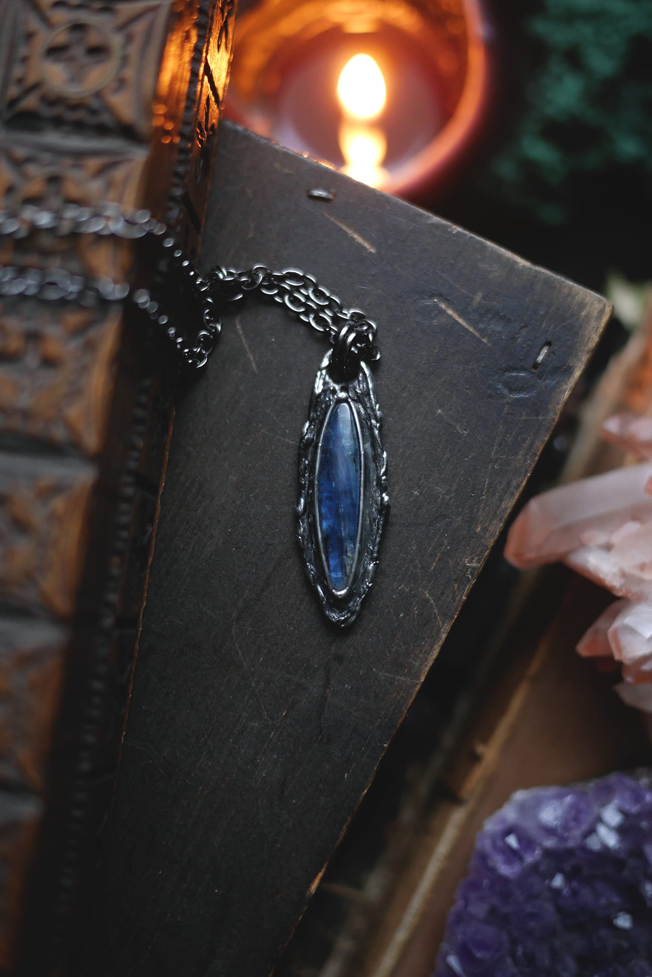Niebieski kyanit w surowej oprawie z miedzi i cyny.