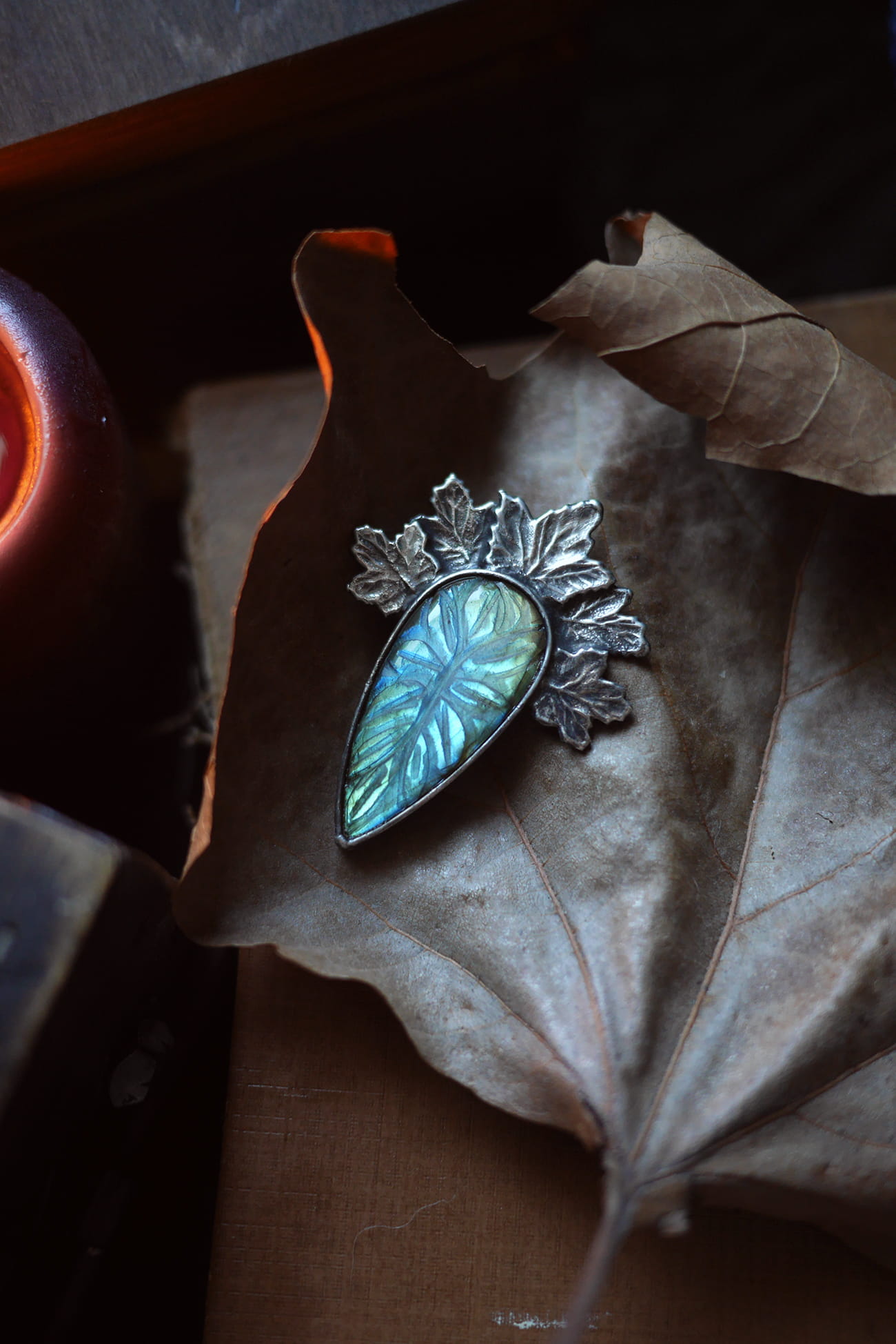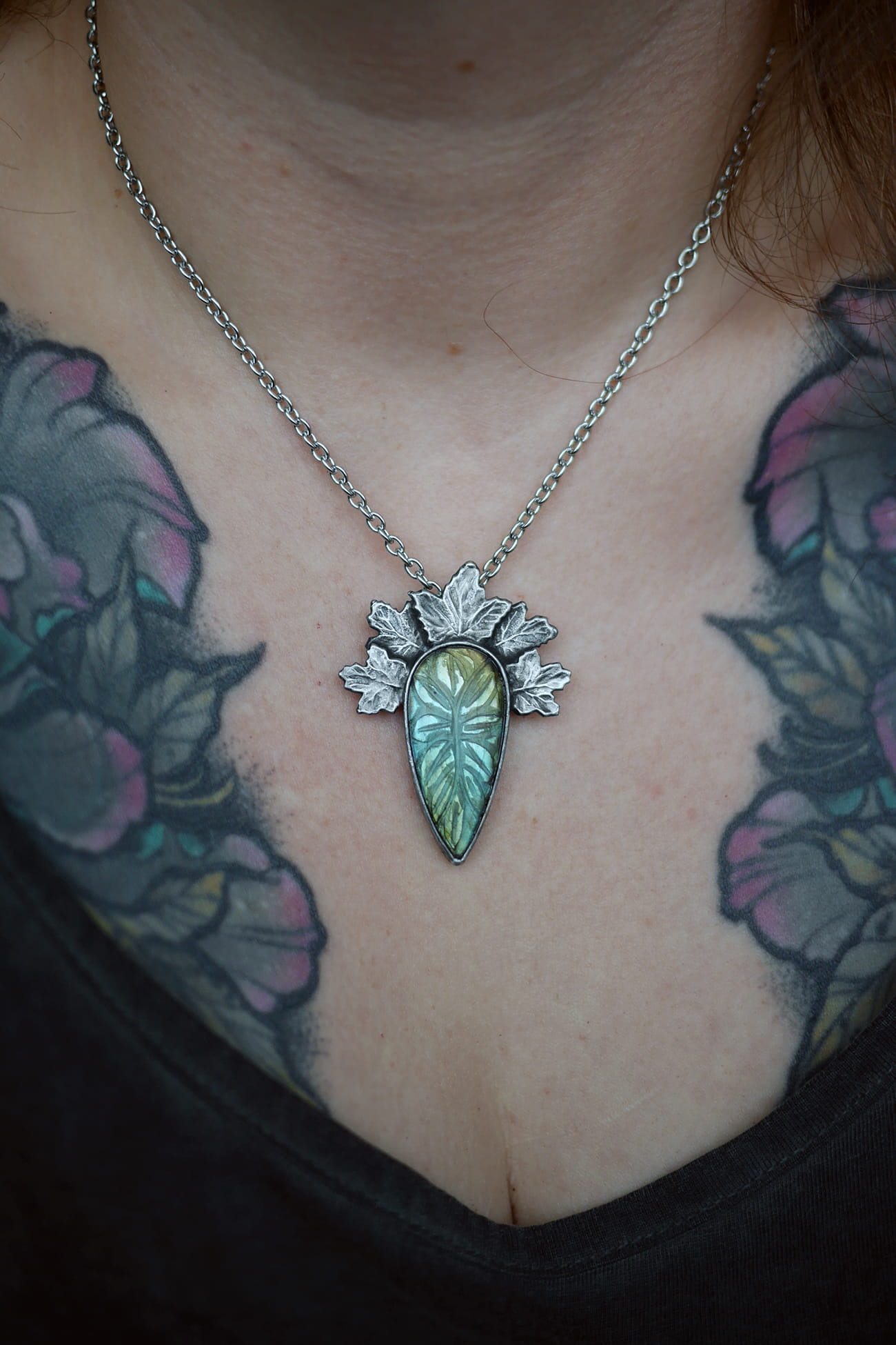 Kamień: rzeźbiony labradoryt o seledynowo złotym ogniu.