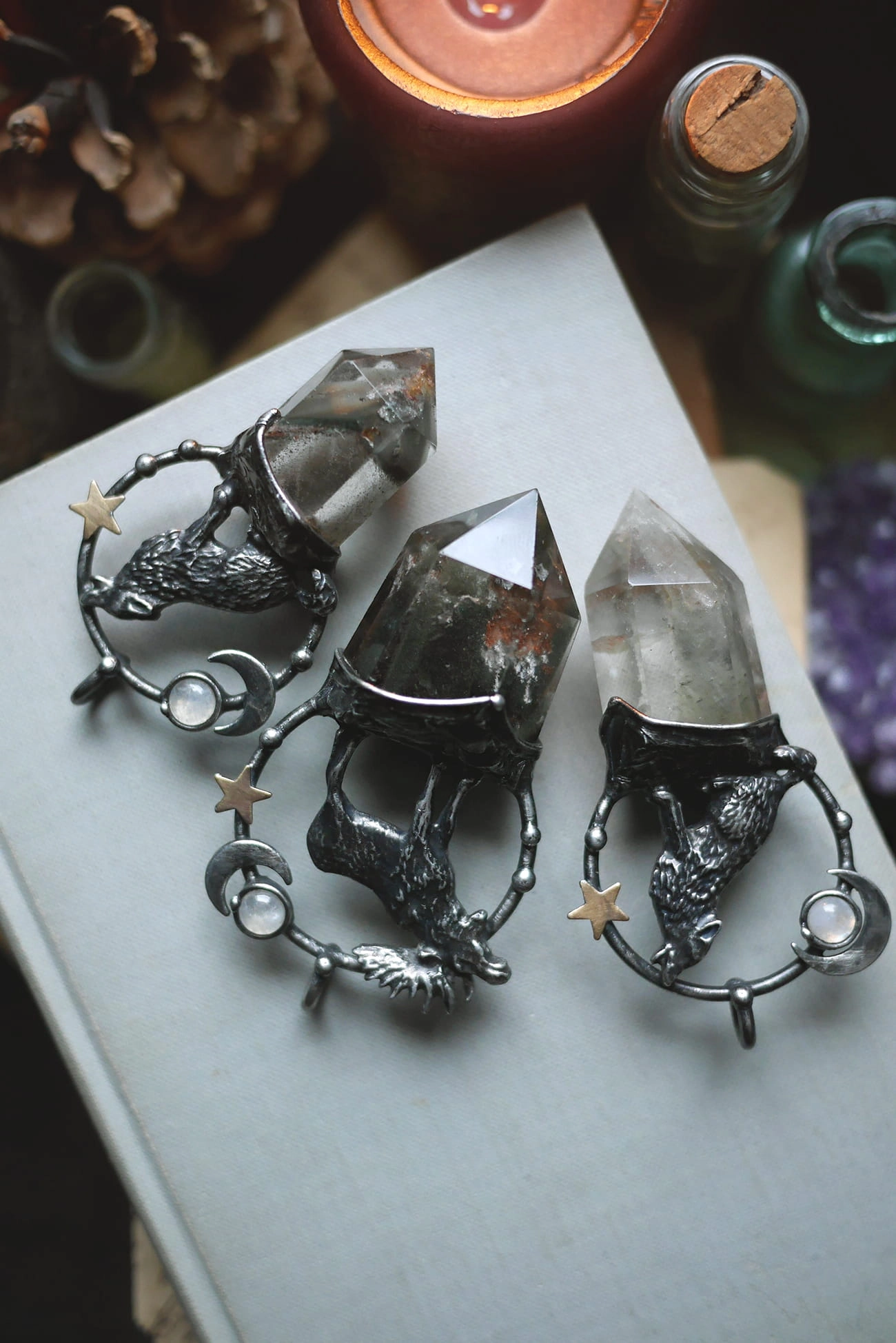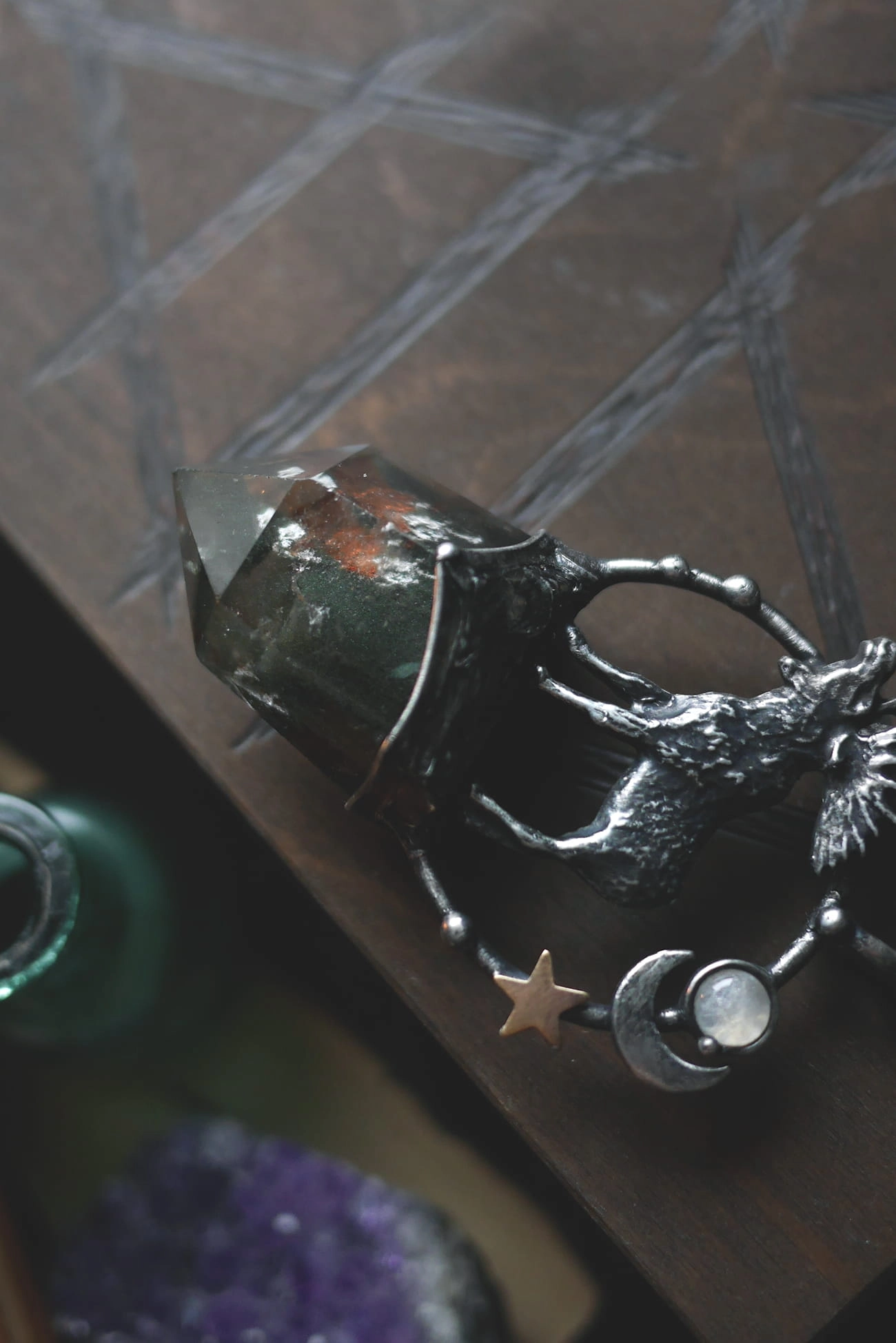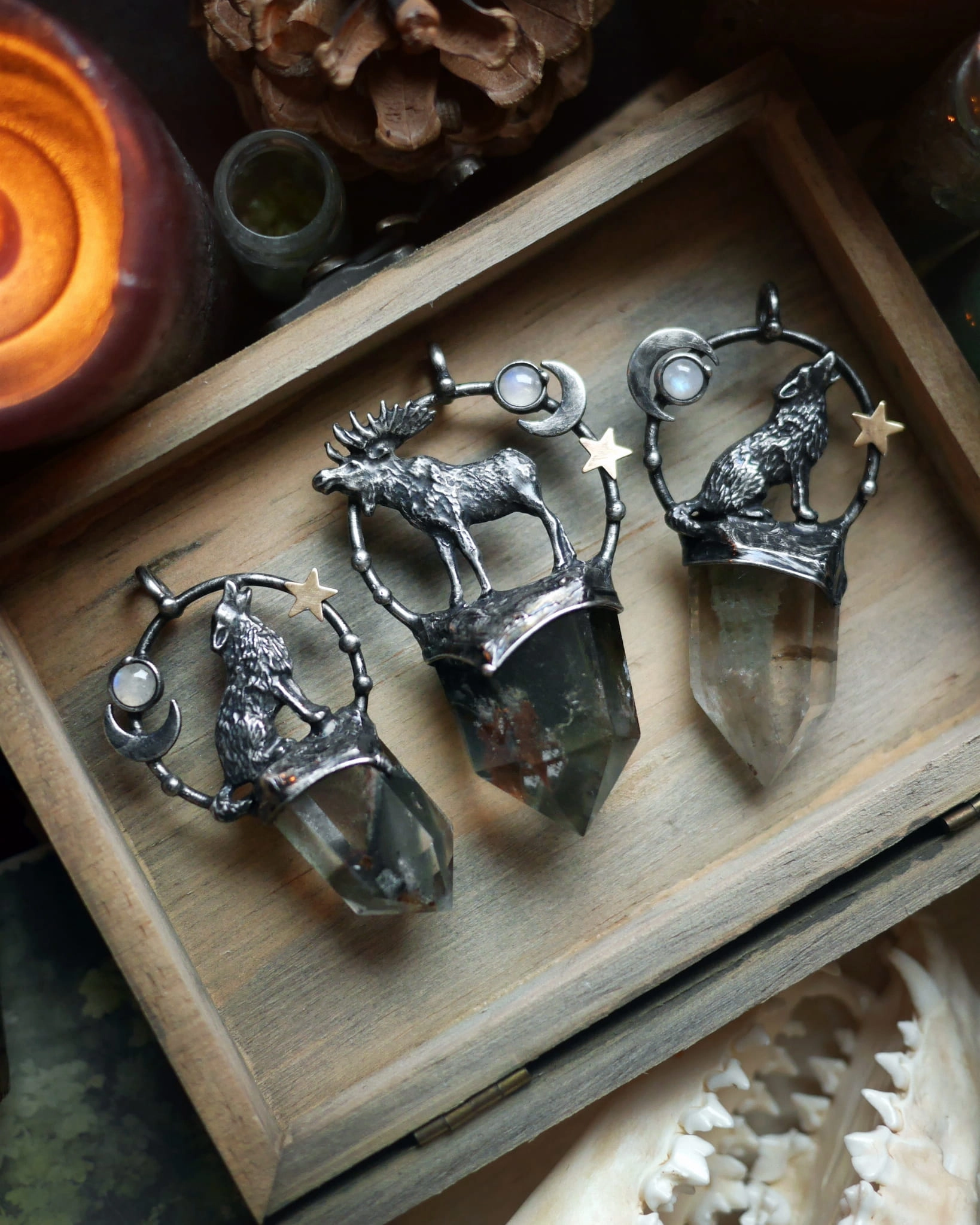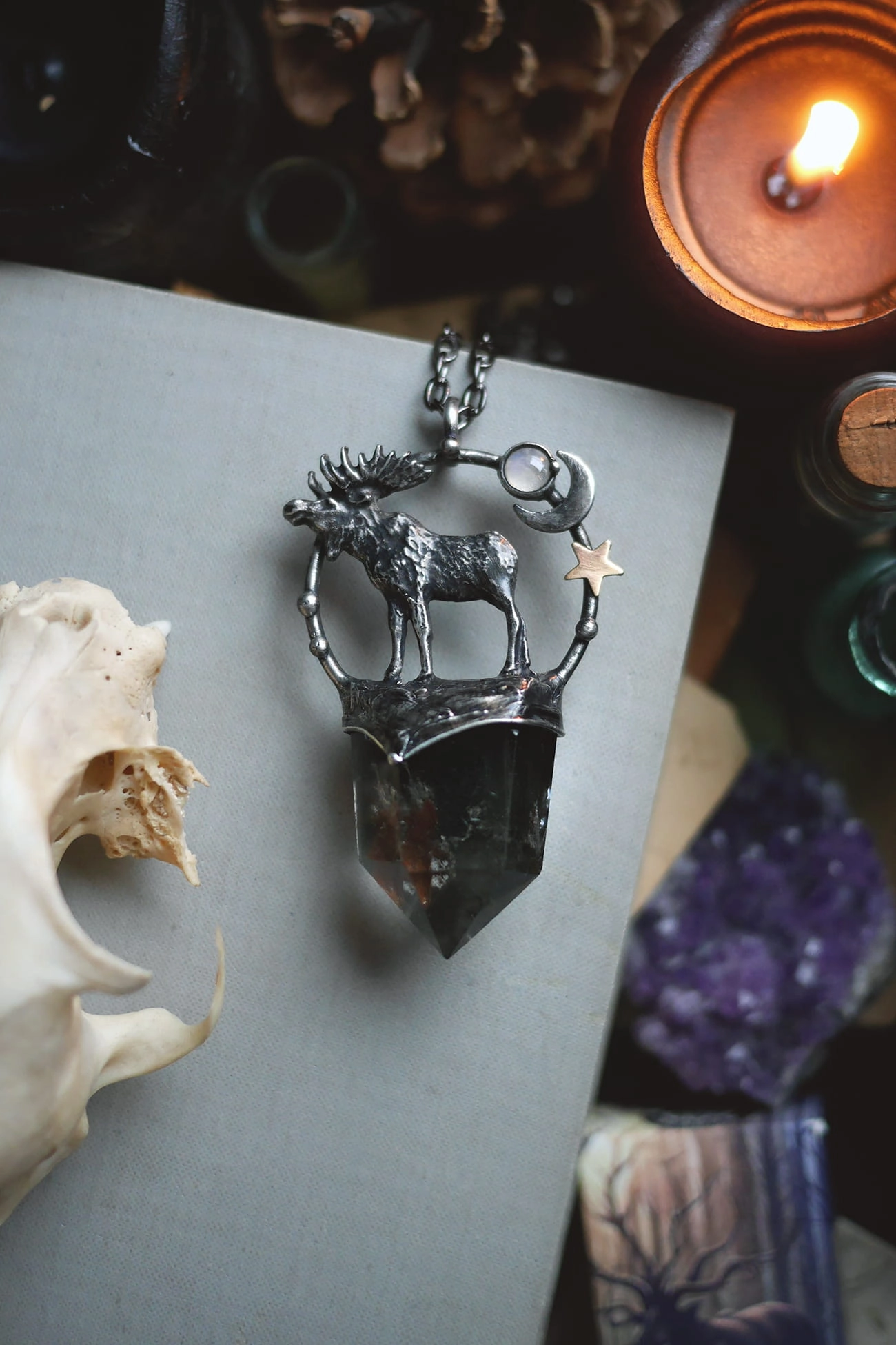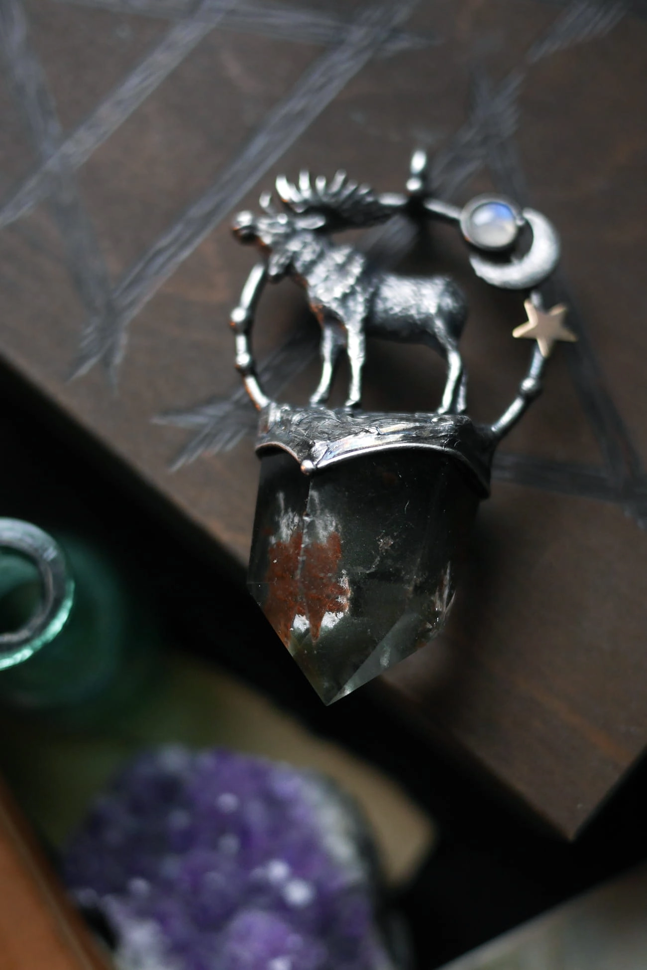 Kwarc ogrodowy w połączeniu z kamieniem księżycowym, półksiężycem, łosiem oraz mosiężną gwiazdką.