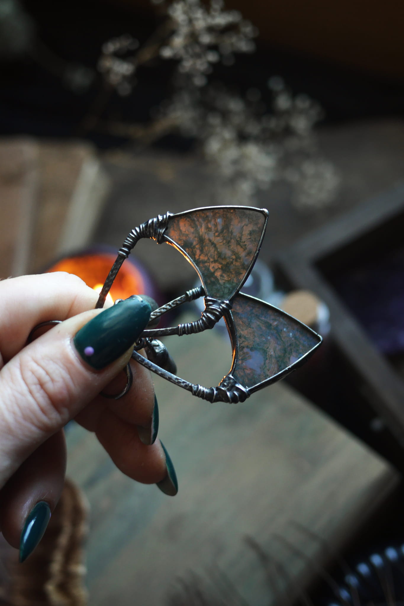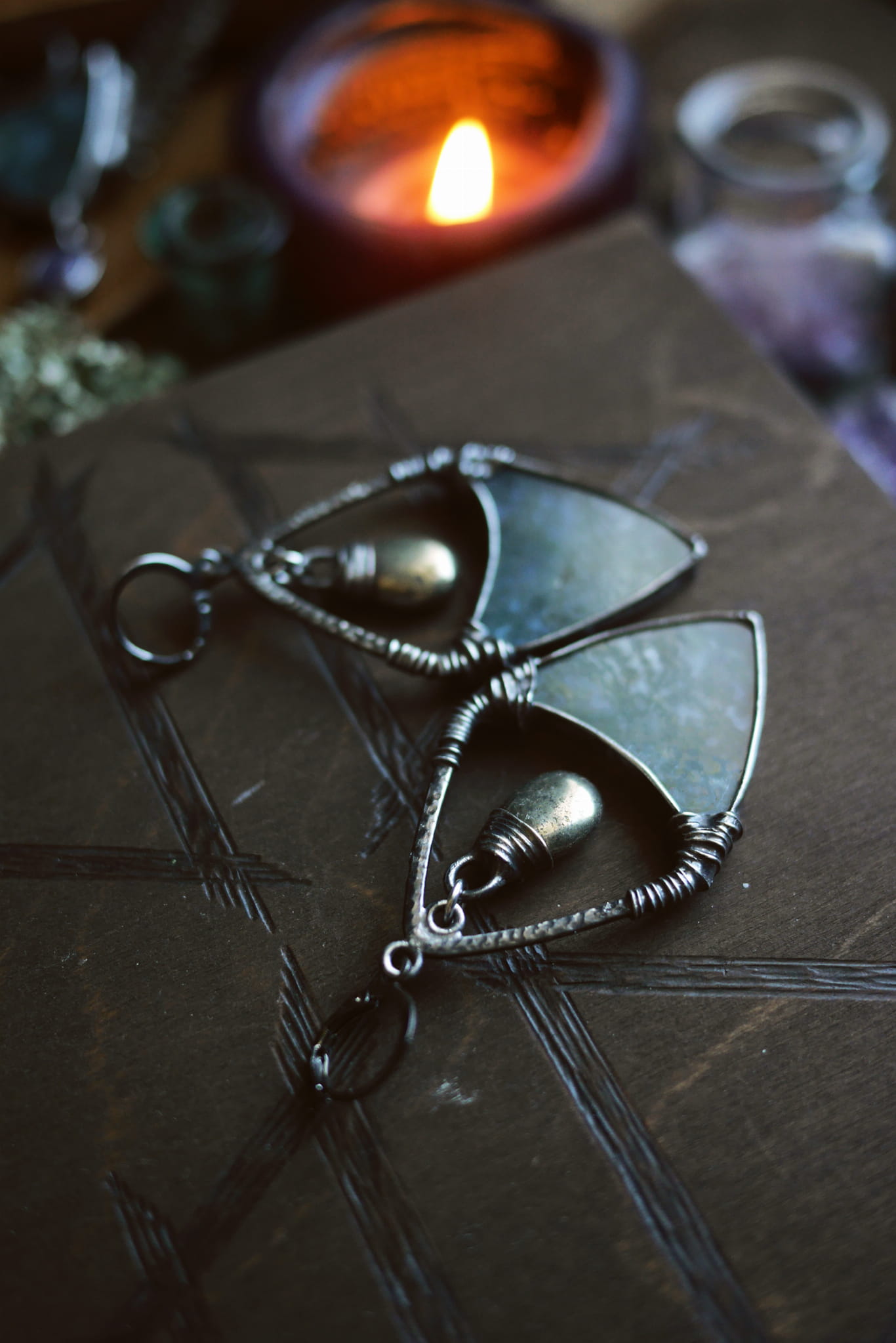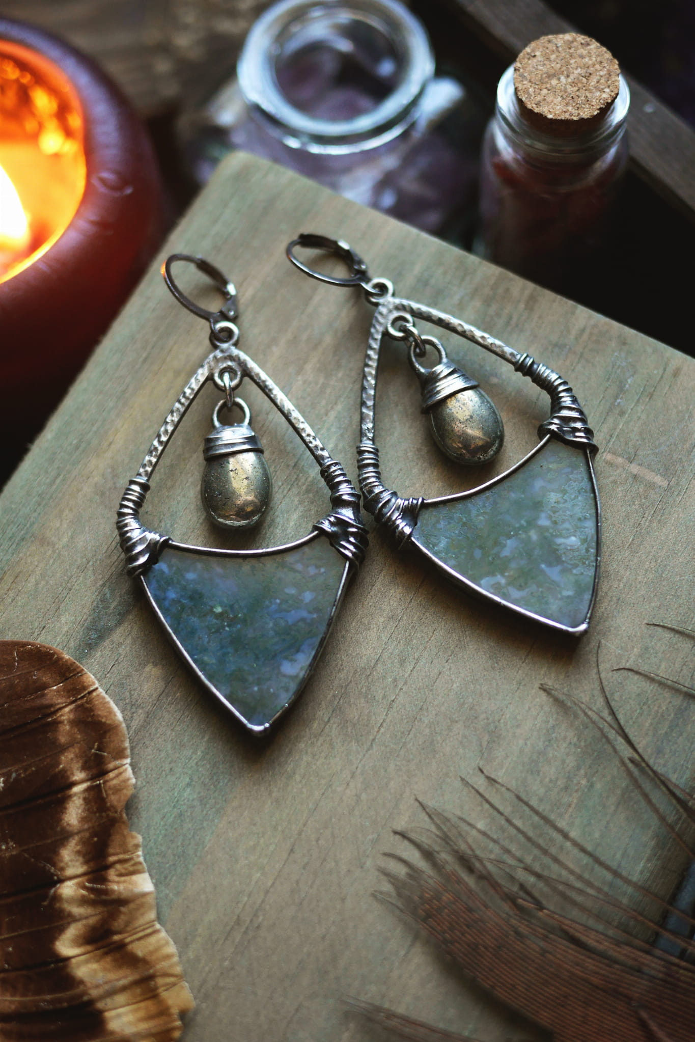 Okazałe kolczyki z plastrami agatu mszystego i kropelkami pirytu.