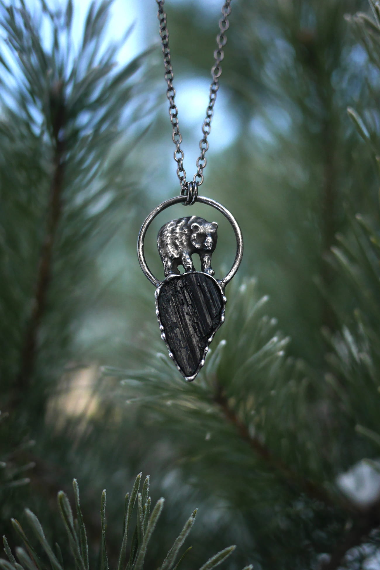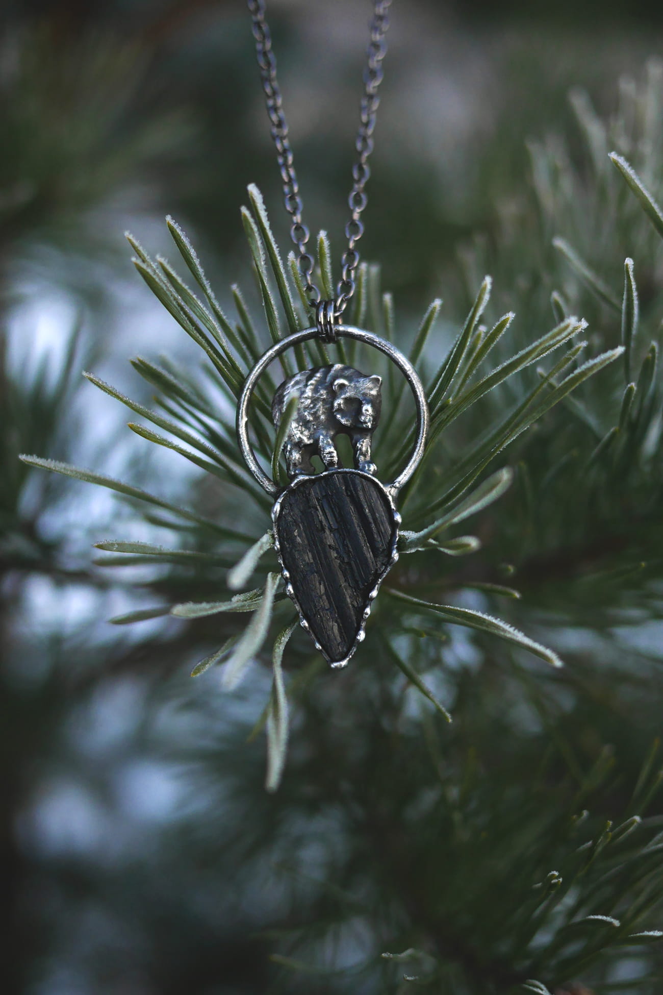 Surowy, czarny turmalin w połączeniu z niedźwiedziem.