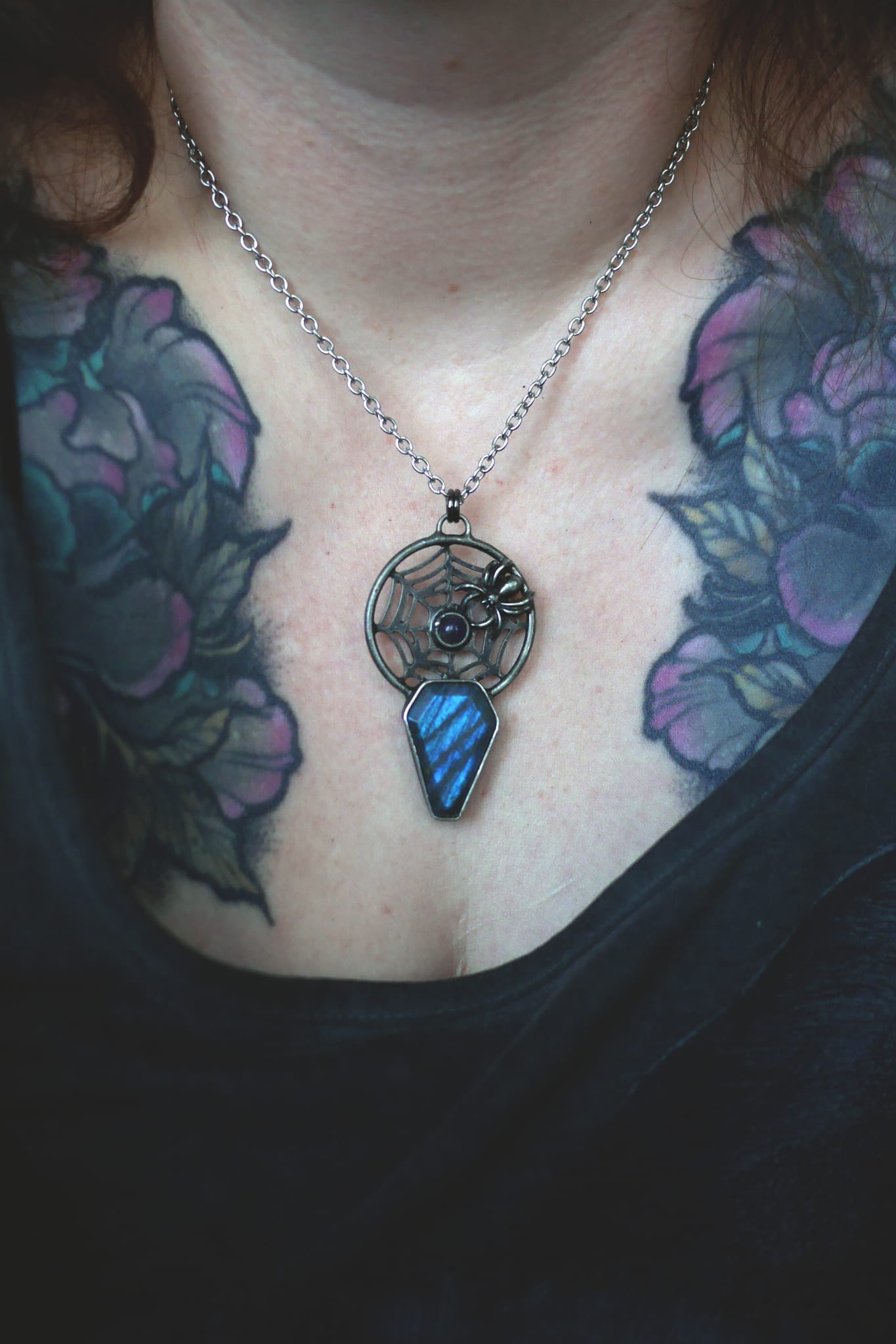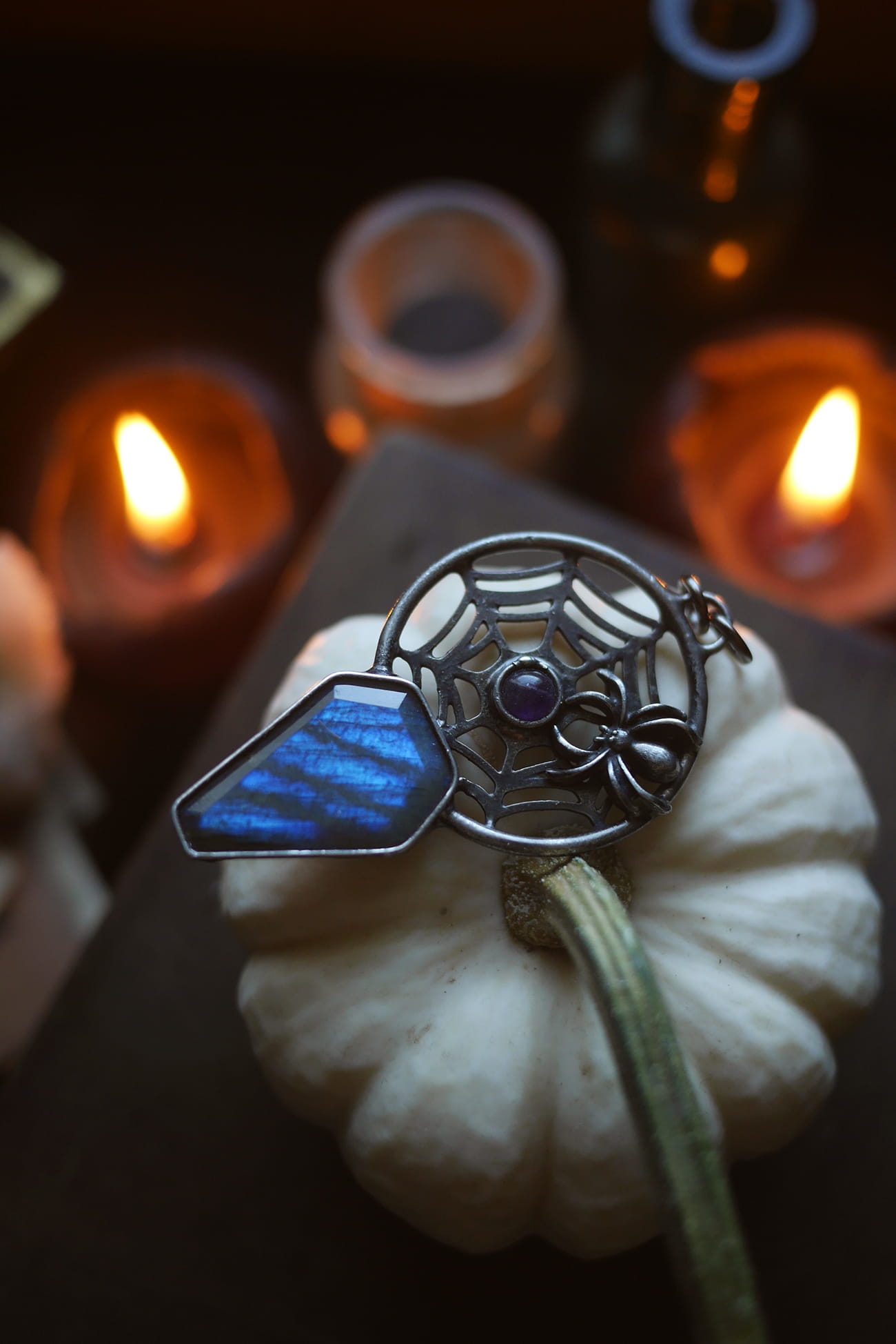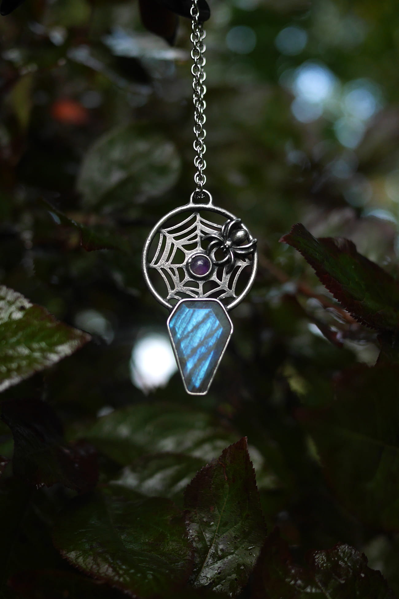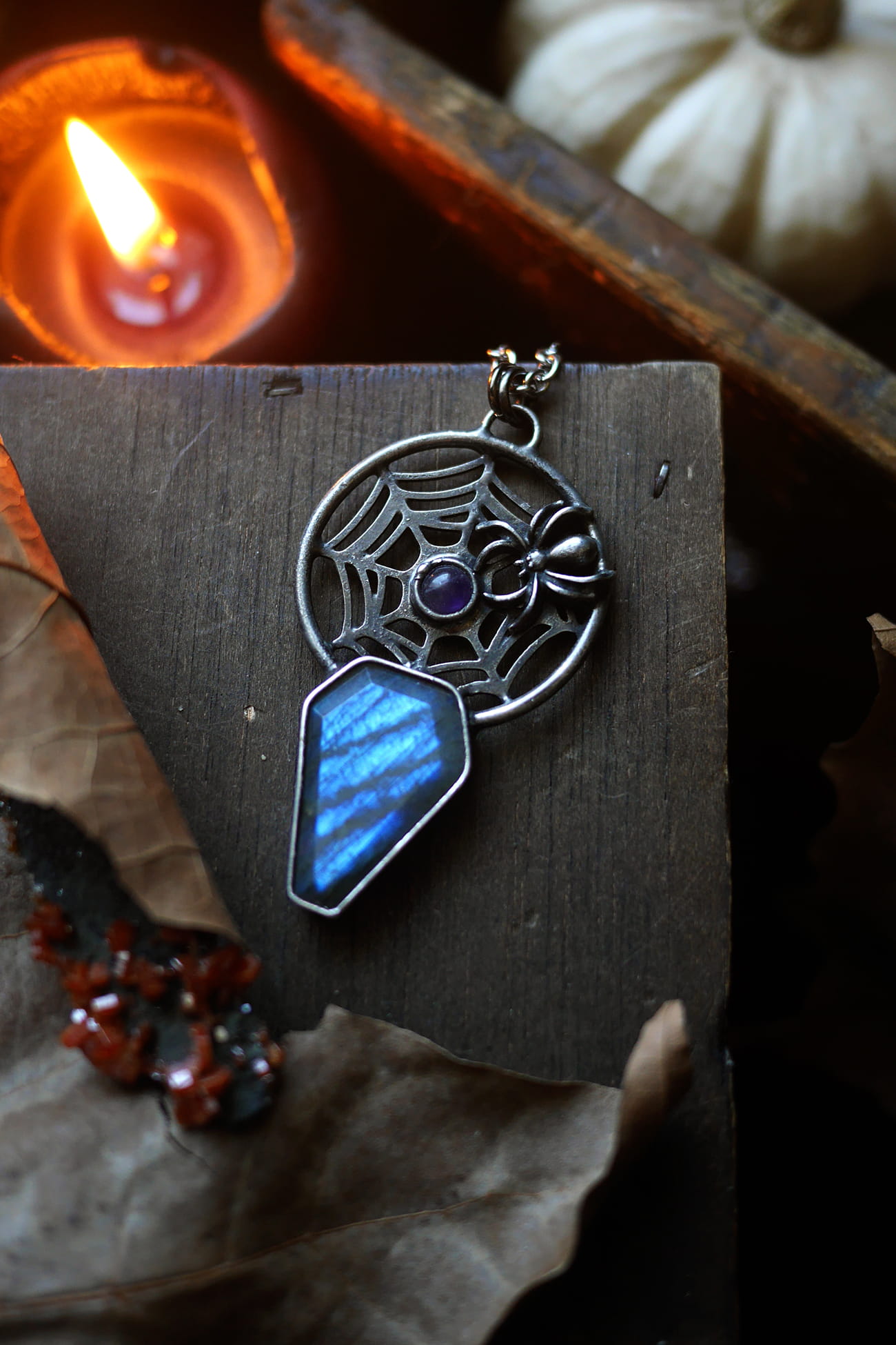 Labradoryt w kształcie trumny w połączeniu z pajęczyną, pająkiem oraz ametystem.