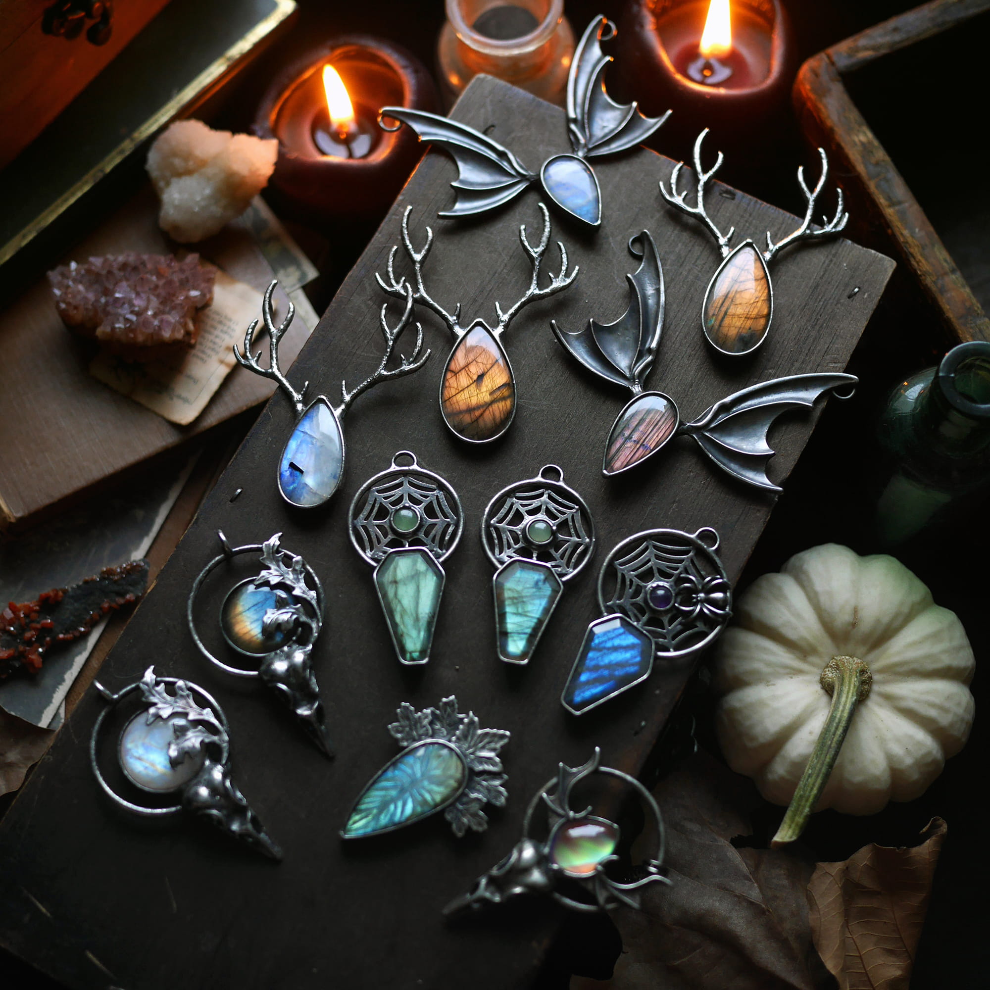 Kamień: labradoryt w kształcie trumny o niebieskim ogniu, ametyst.