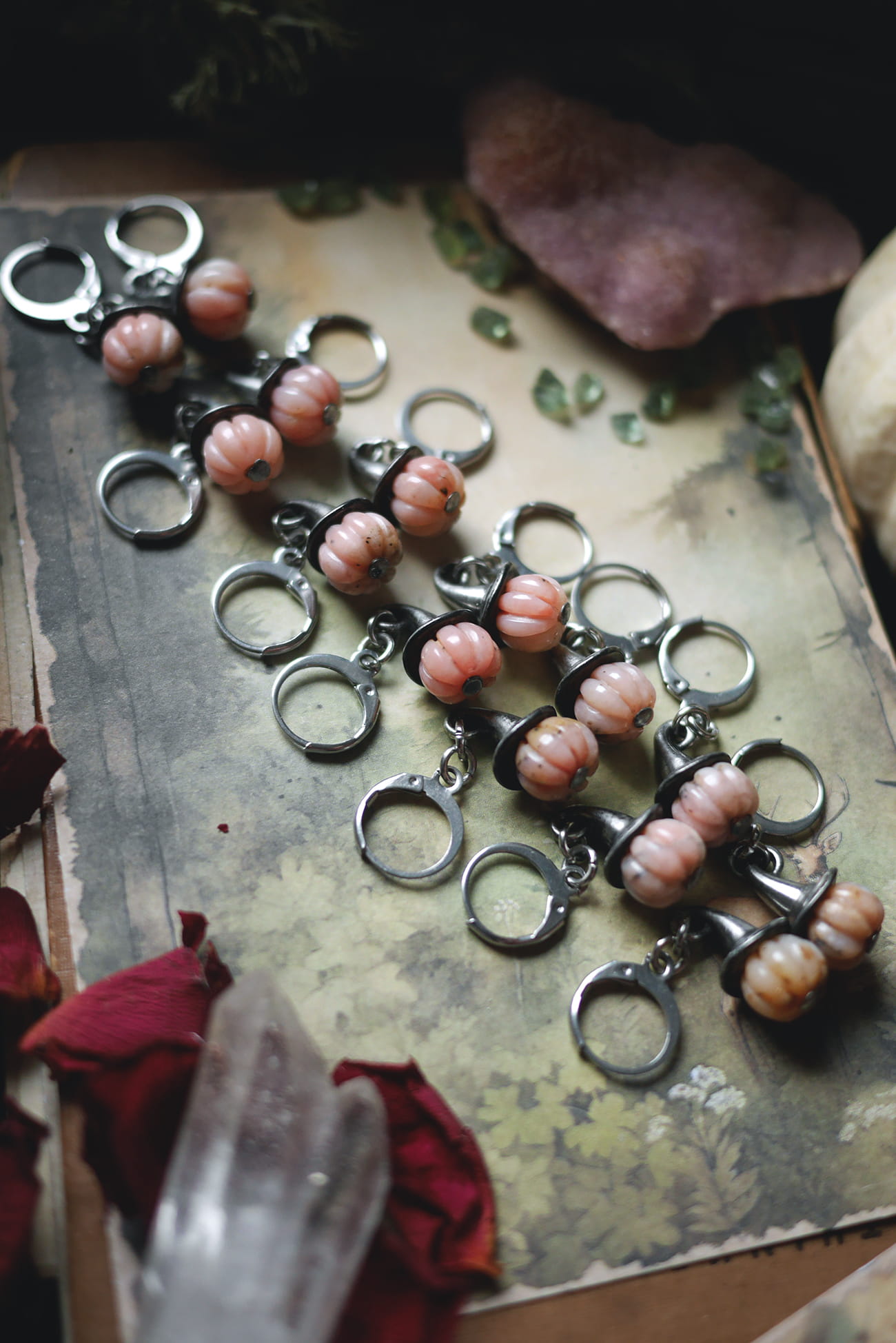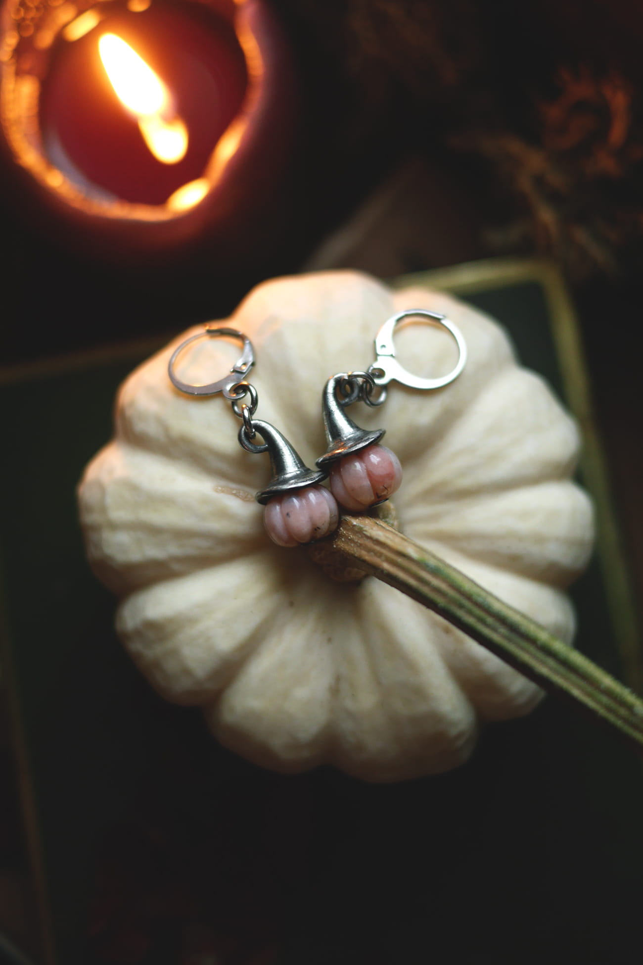 Kolczyki na biglach zamkniętych z dyniami przyodziewającymi kapelusze czarownicy.