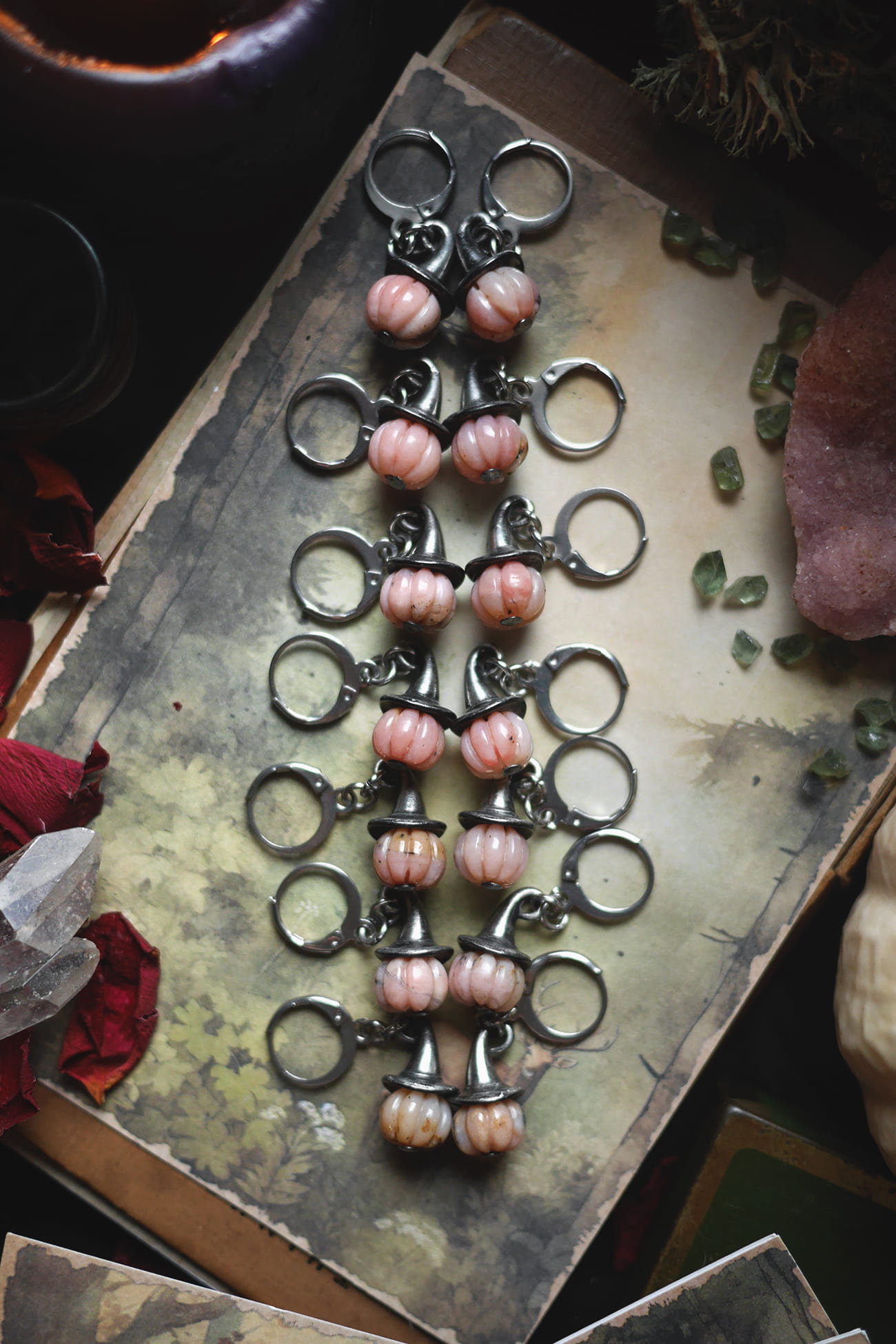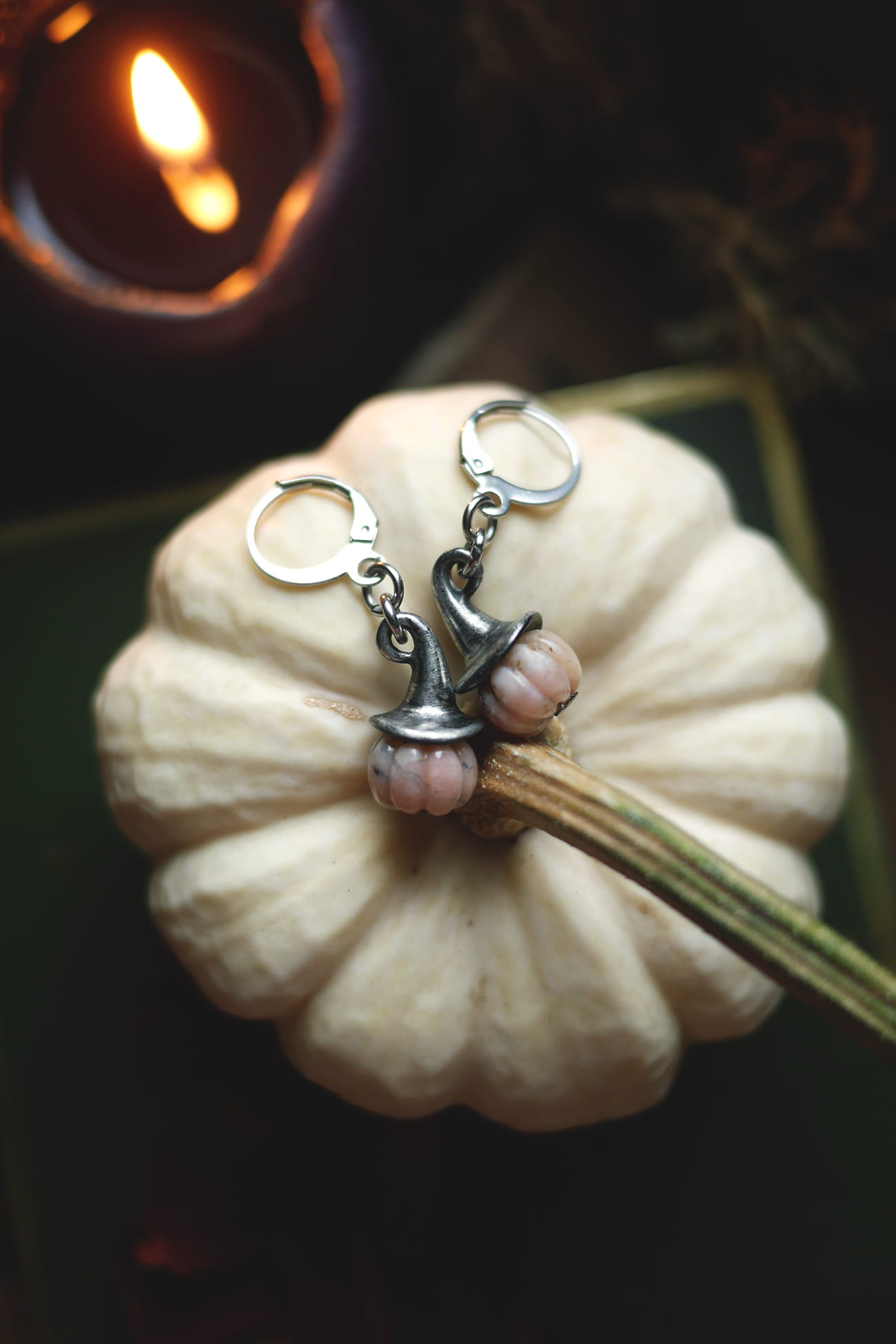 Kolczyki na biglach zamkniętych z dyniami przyodziewającymi kapelusze czarownicy.