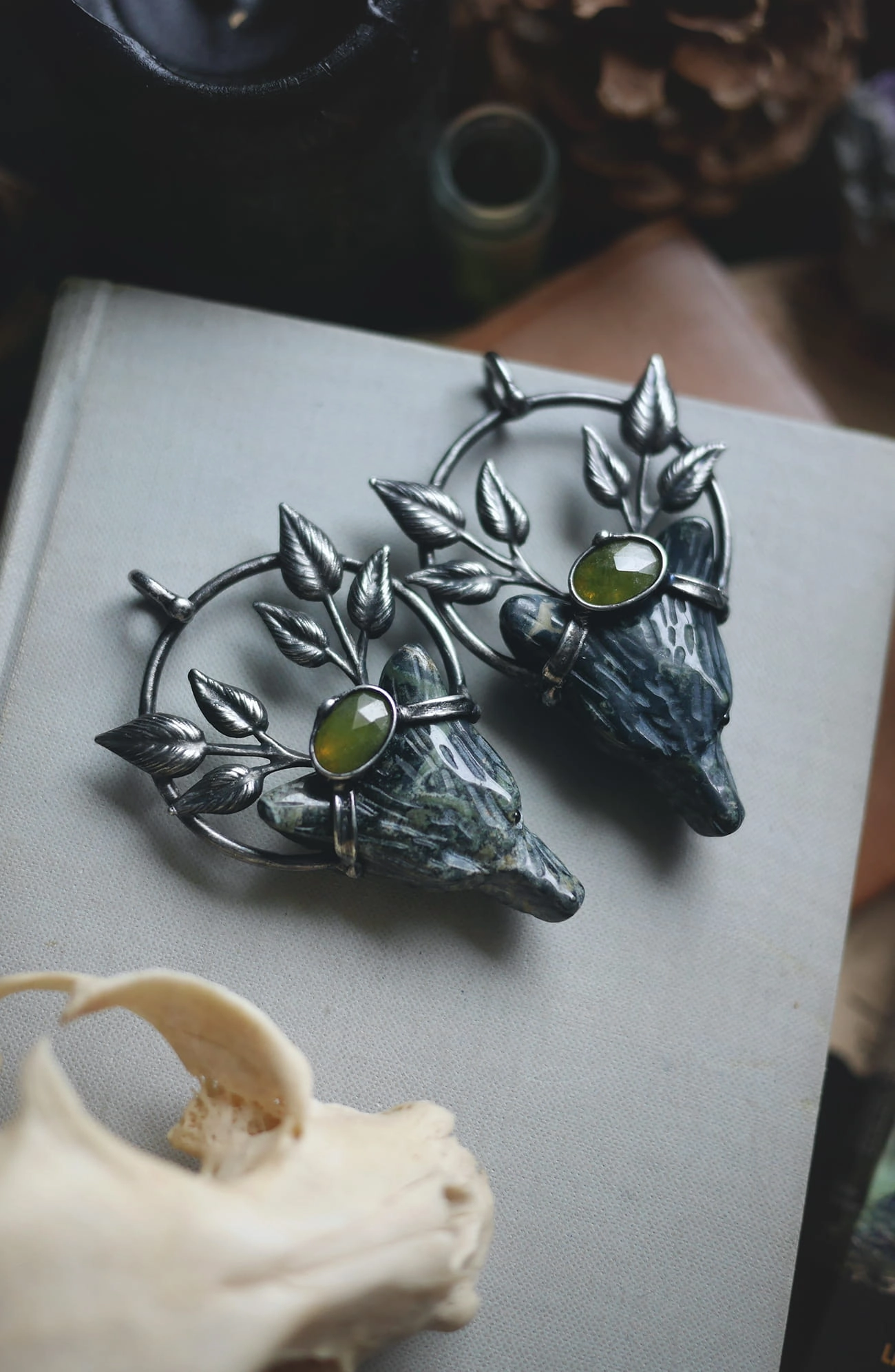Rzeźbiona głowa wilka wykonana z jaspisu kambaba w połączeniu z wezuwianitem oraz listkami.