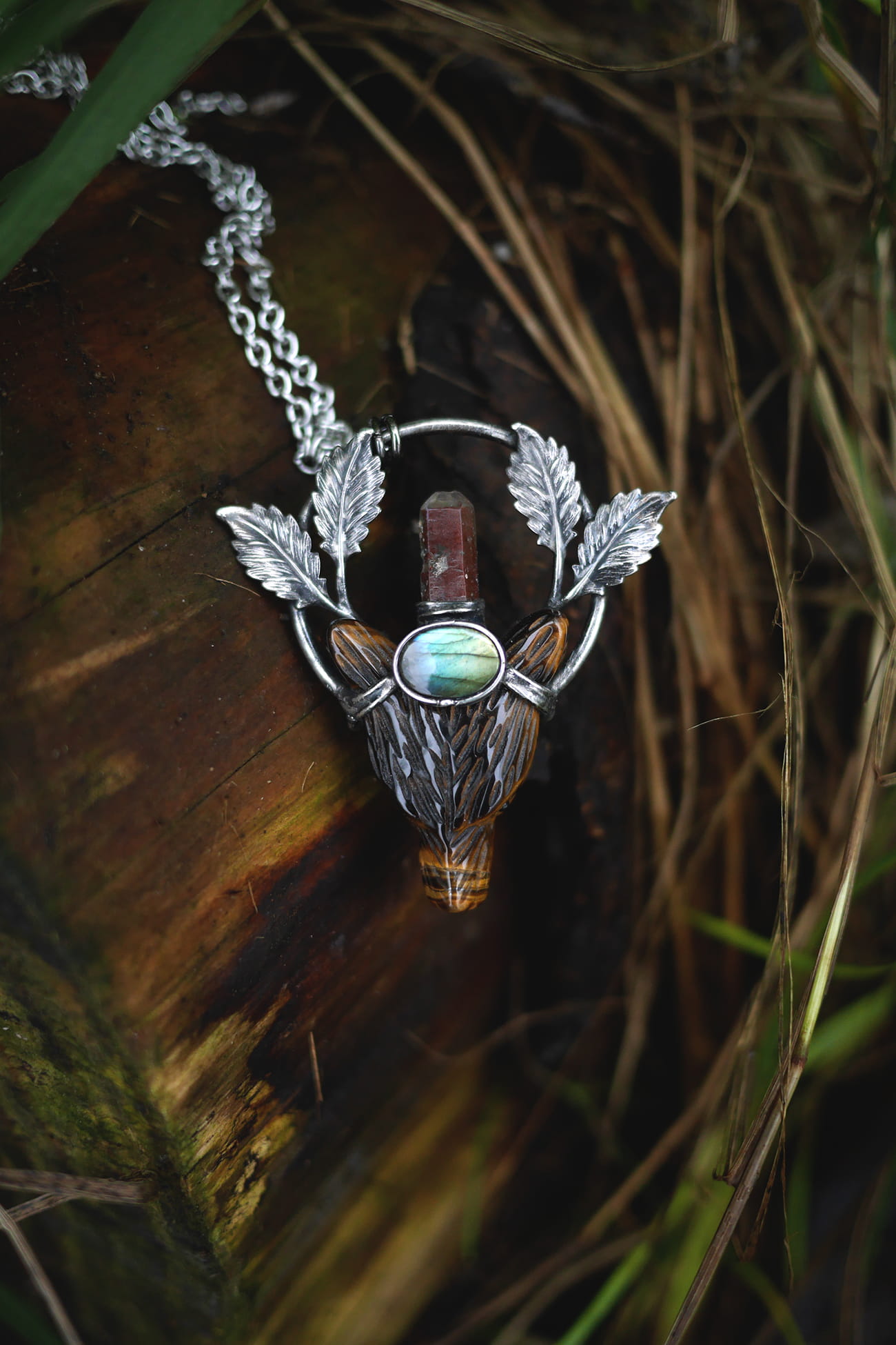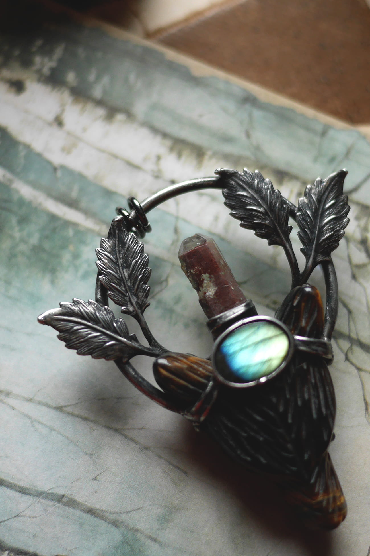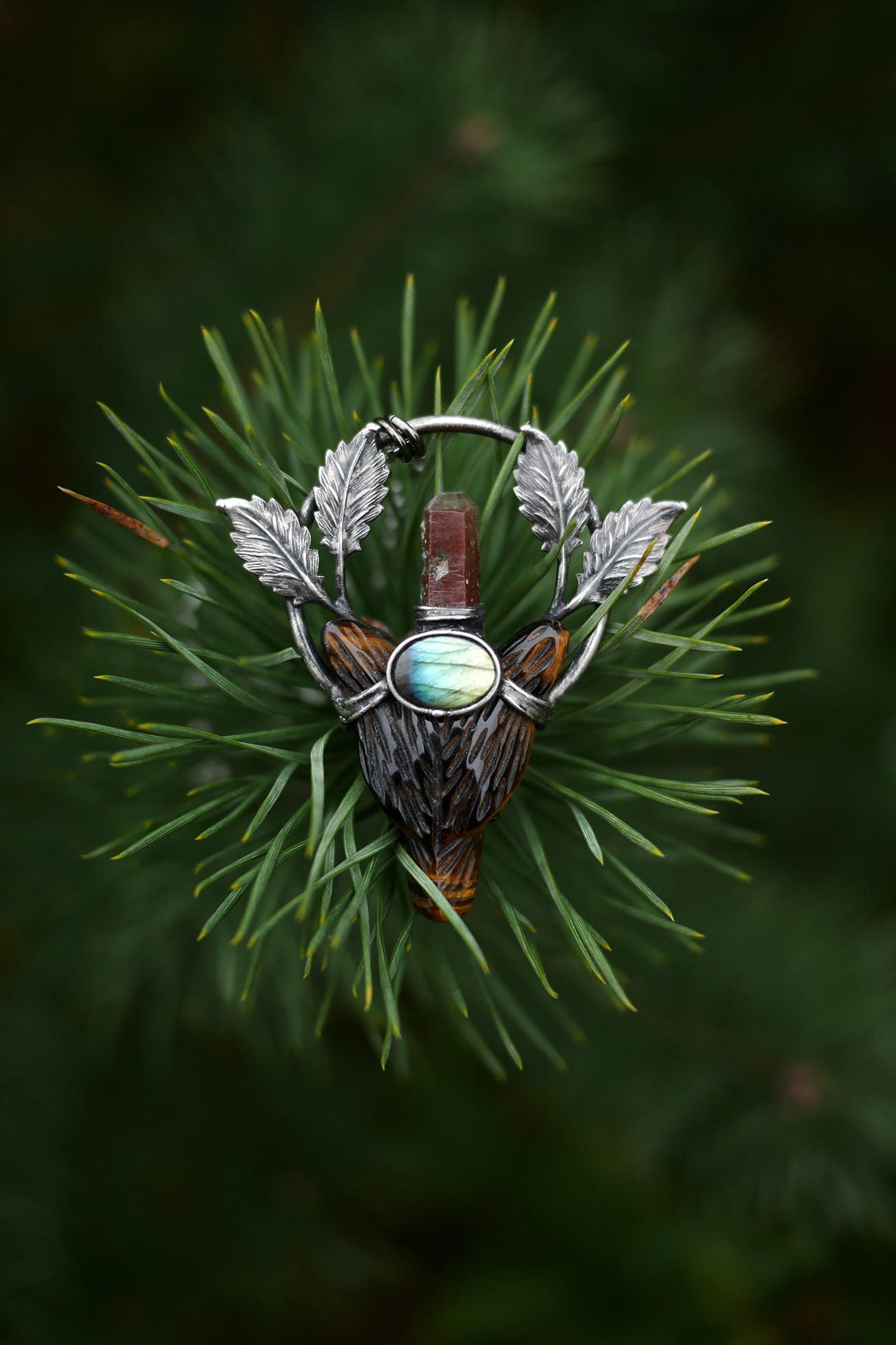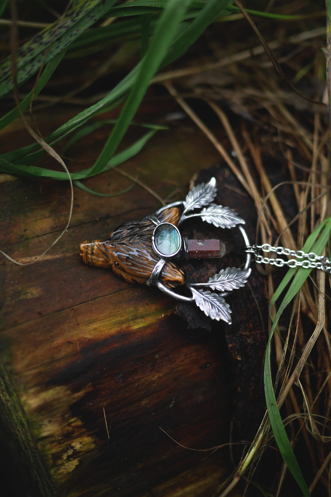 Rzeźbiona głowa wilka wykonana z tygrysiego oka w połączeniu z labradorytem, kwarcem oraz listkami.