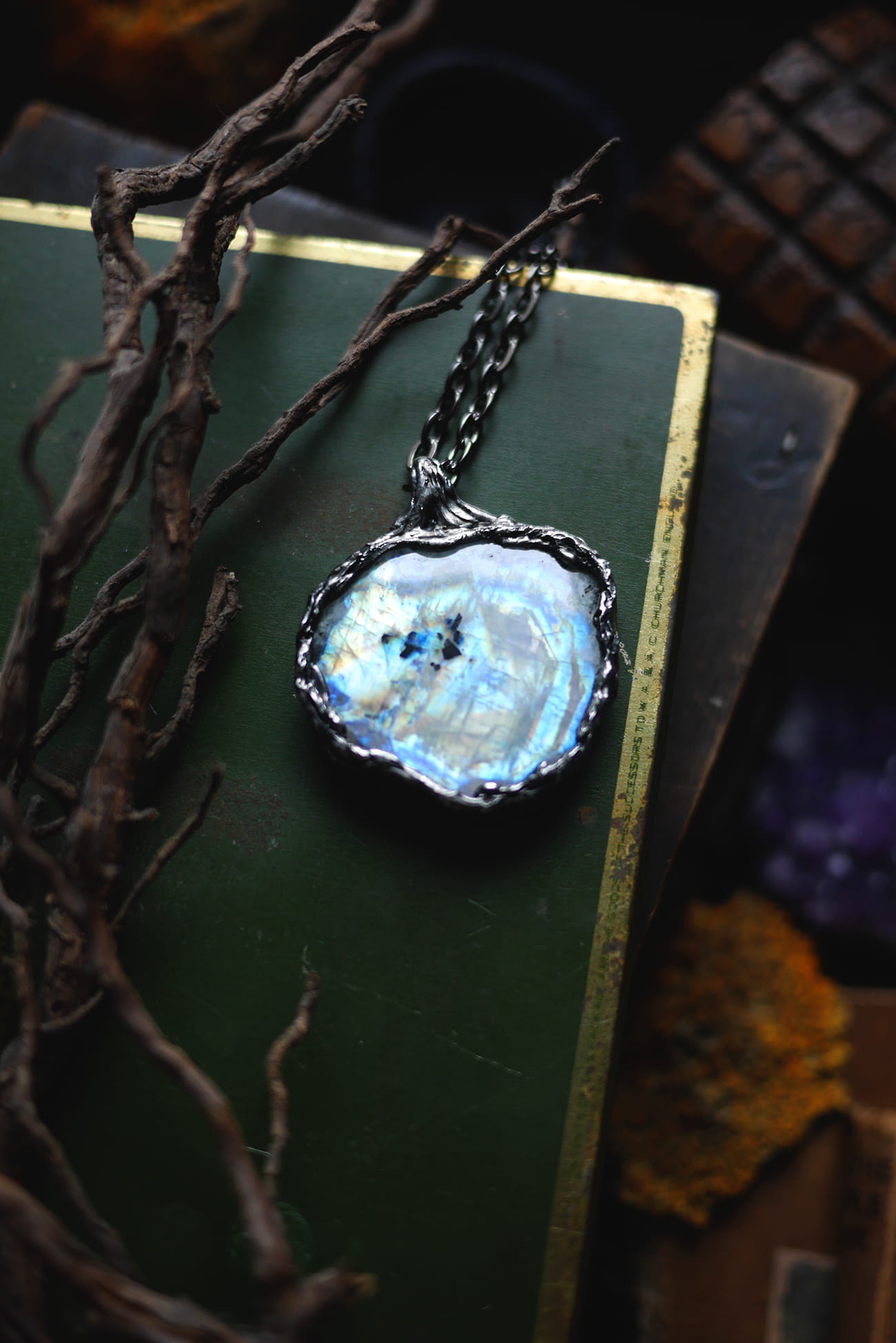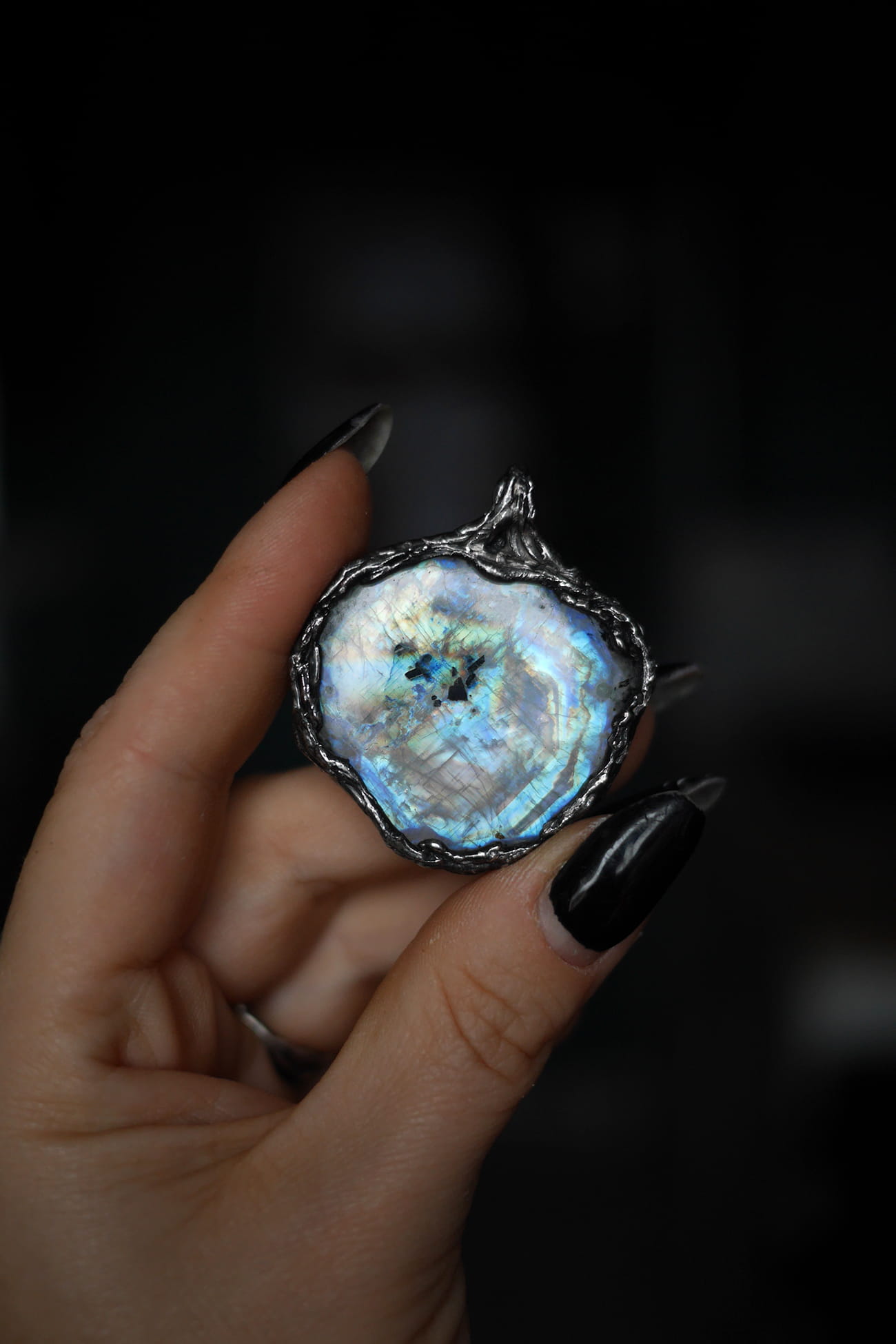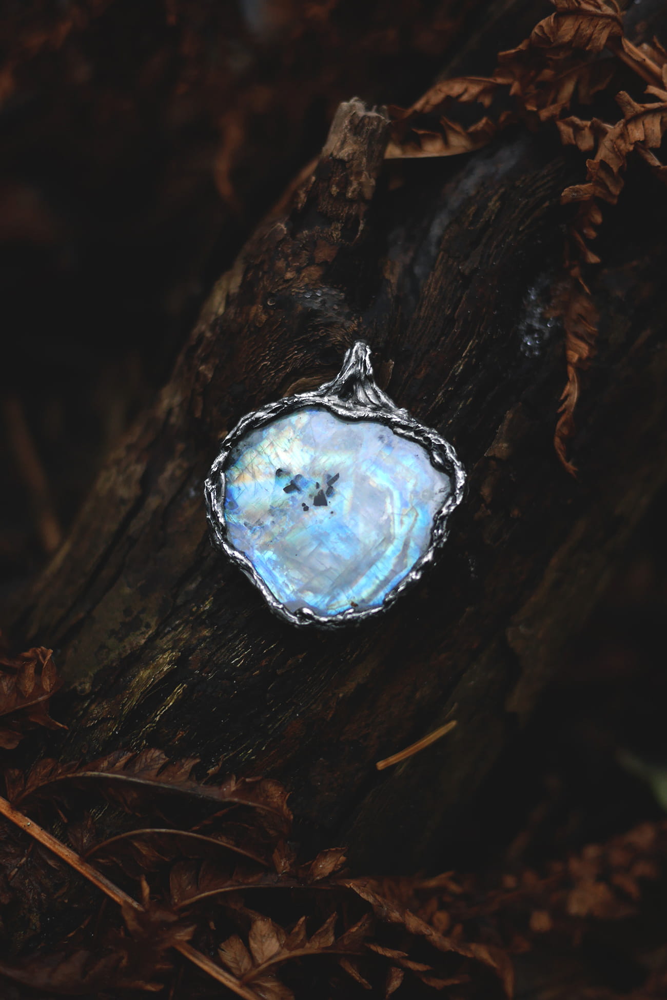 Kamień: kamień księżycowy o tęczowym ogniu, przewaga błękitu.