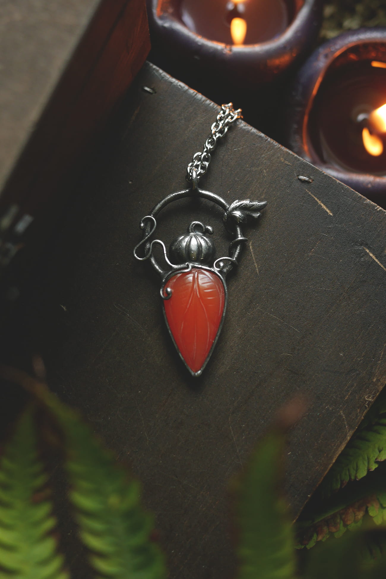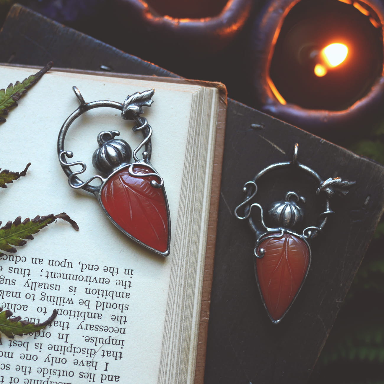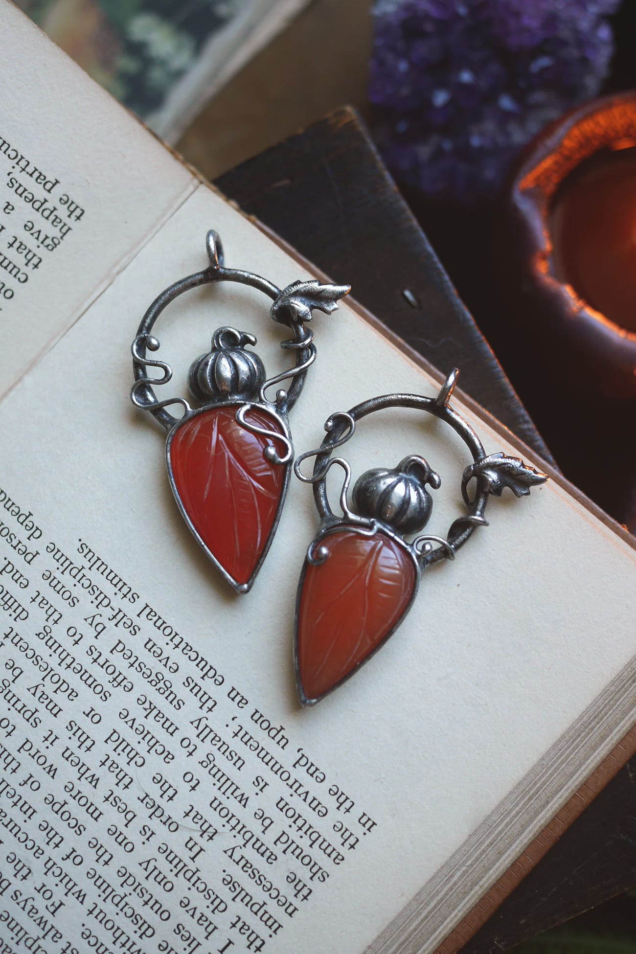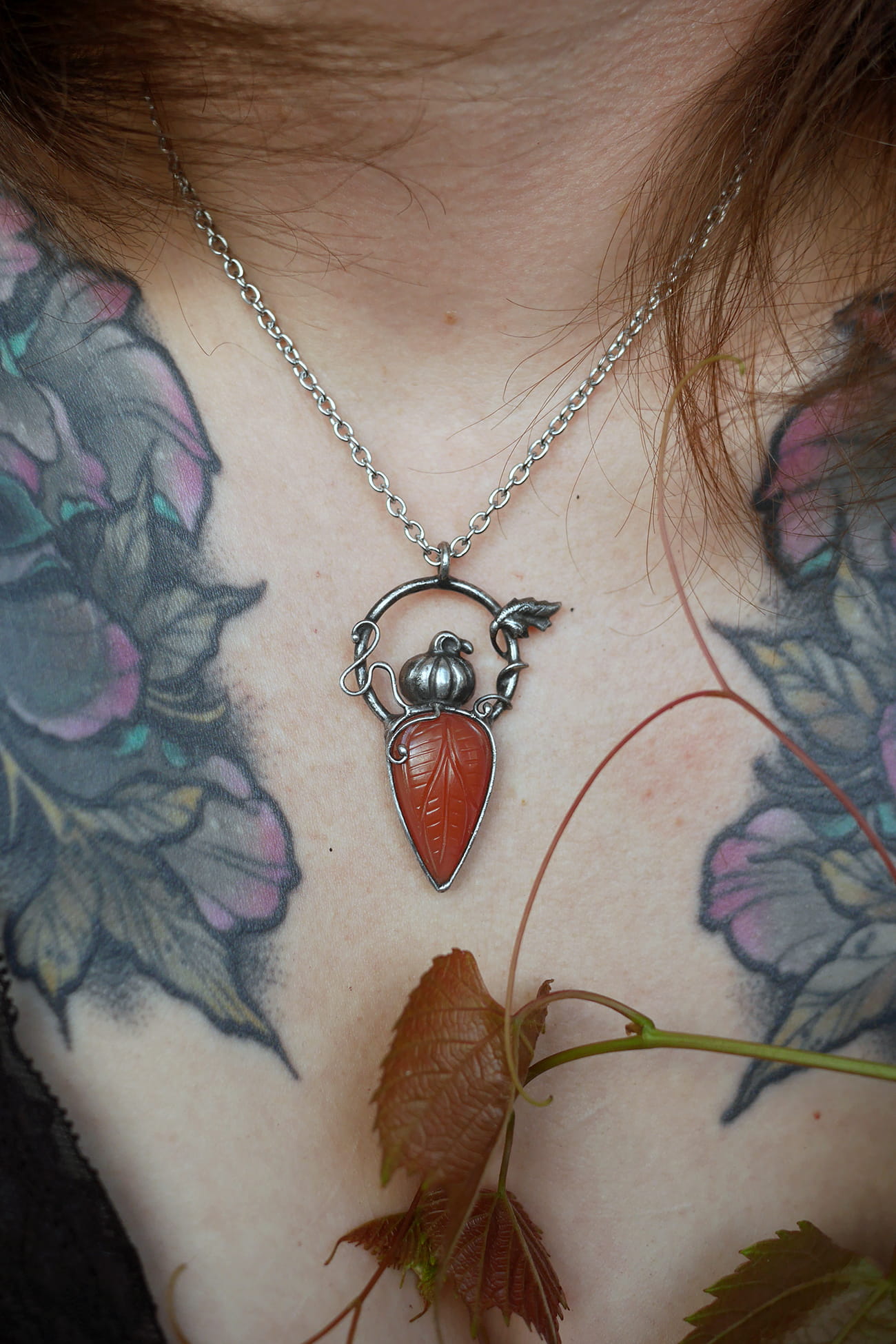 Rzeźbiony karneol w połączeniu z małą dynią i ozdobnymi pędami oraz listkiem.