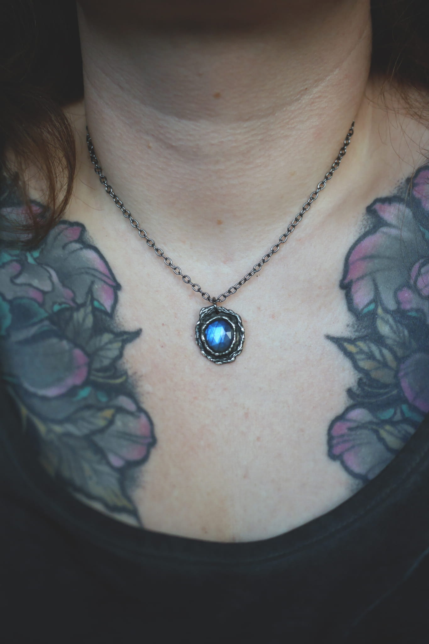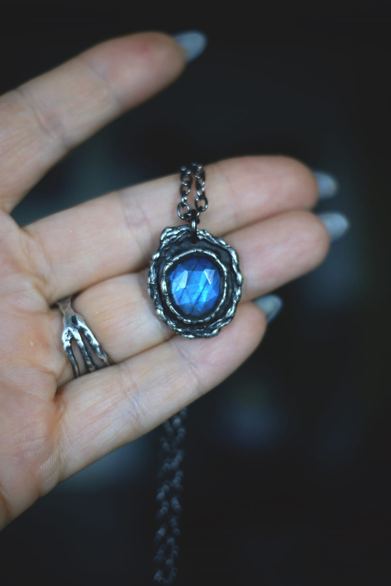 Fasetowany labradoryt w surowej oprawie z miedzi i cyny.