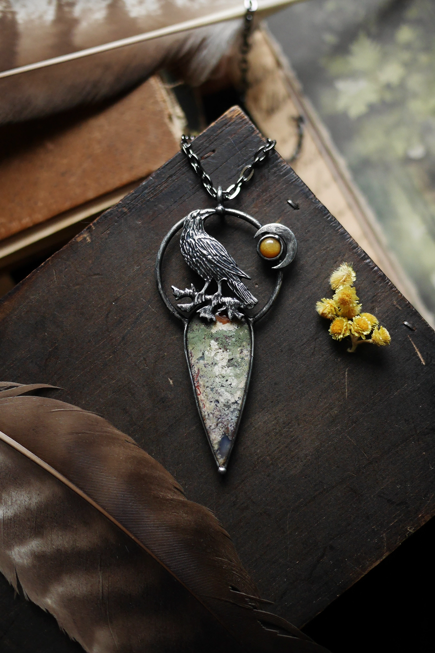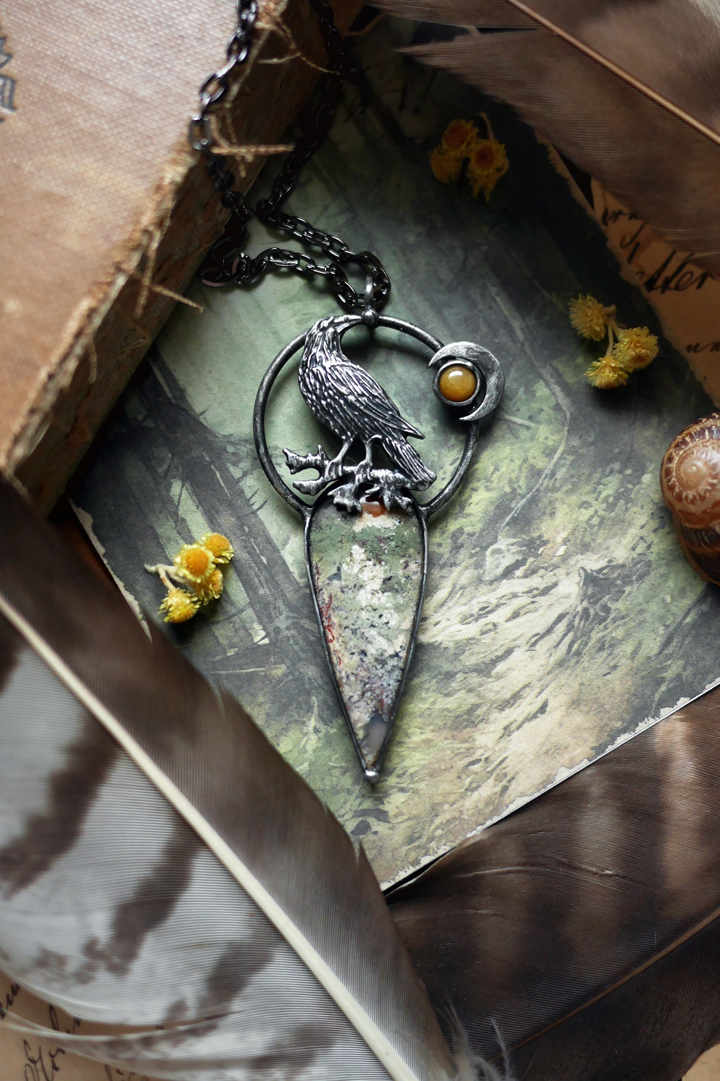 Agat mszysty z krukiem na obręczy, żółtym awenturynem oraz półksiężycem.