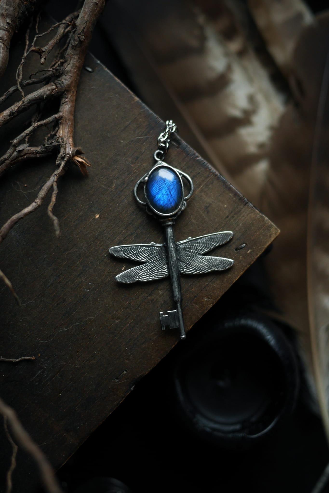 Uskrzydlony klucz z owalnym labradorytem.