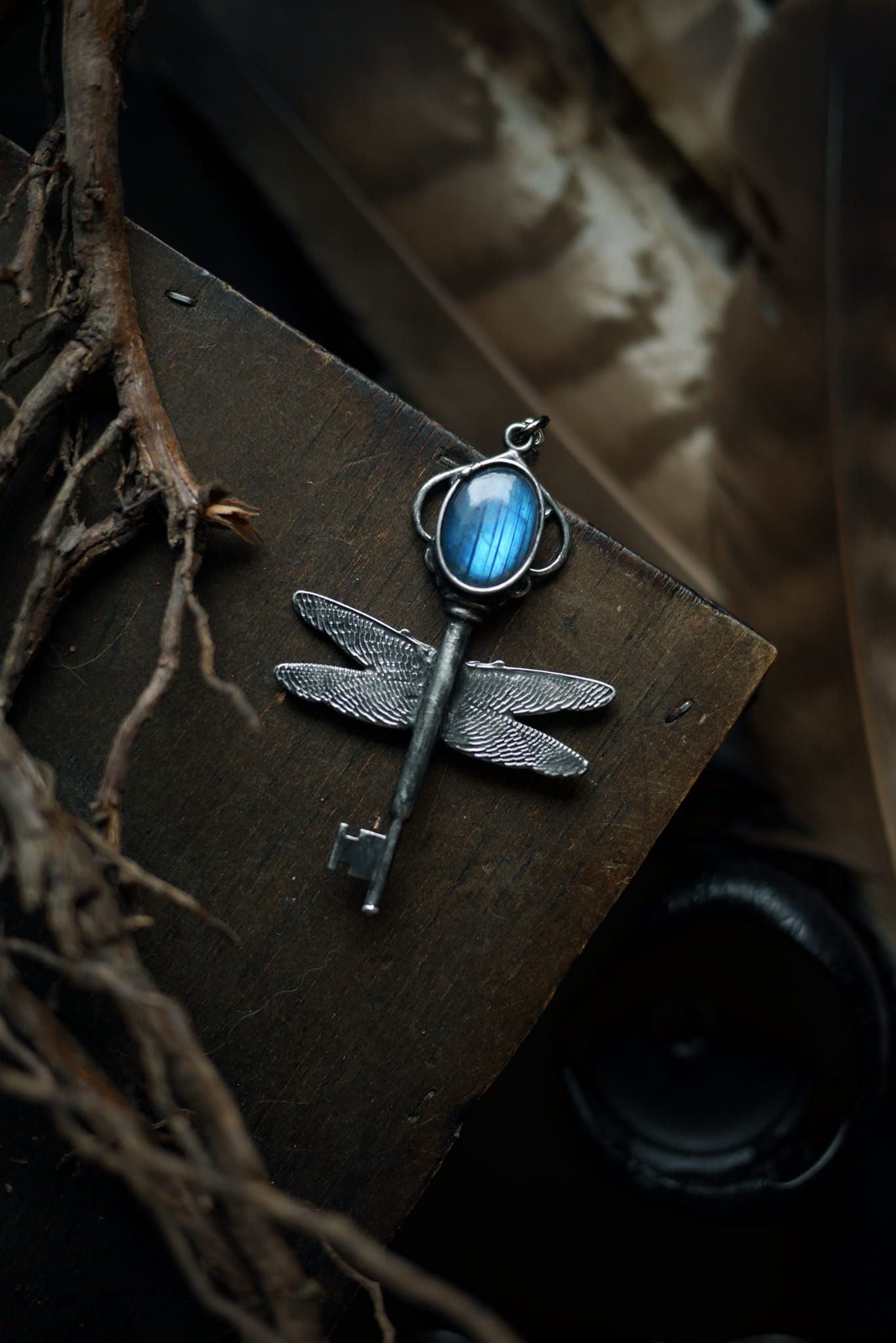 Uskrzydlony klucz z owalnym labradorytem.