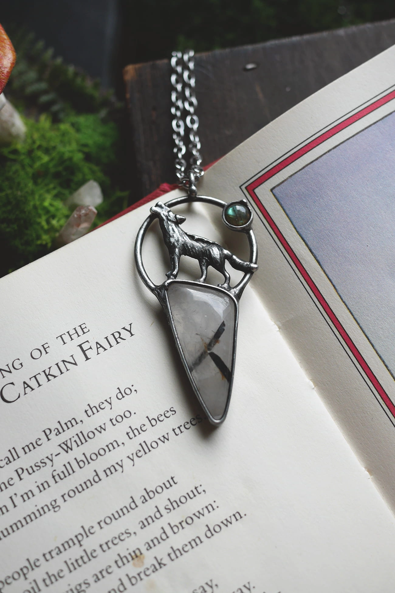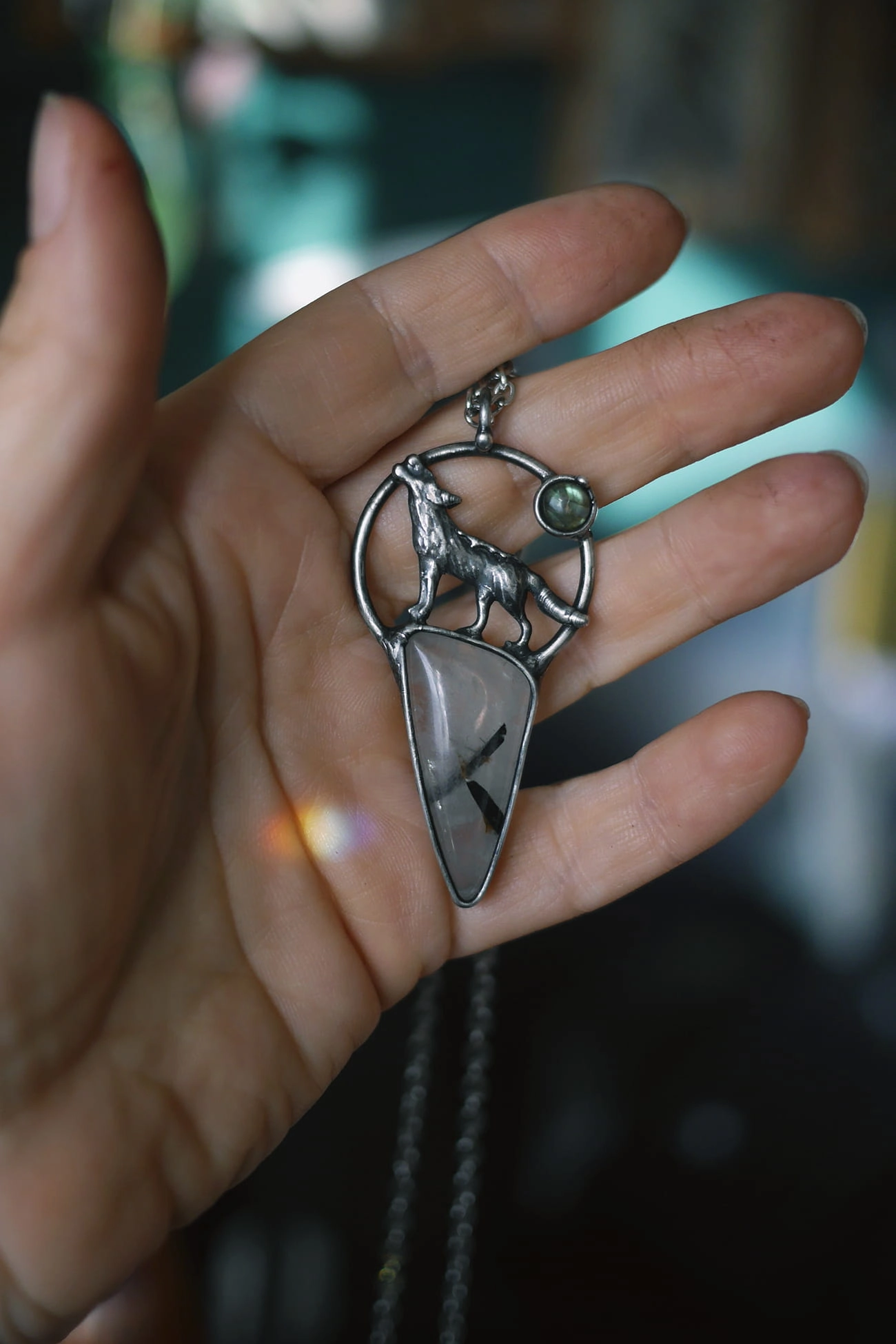 Kamień: kwarc z turmalinem, labradoryt o zielonym ogniu.