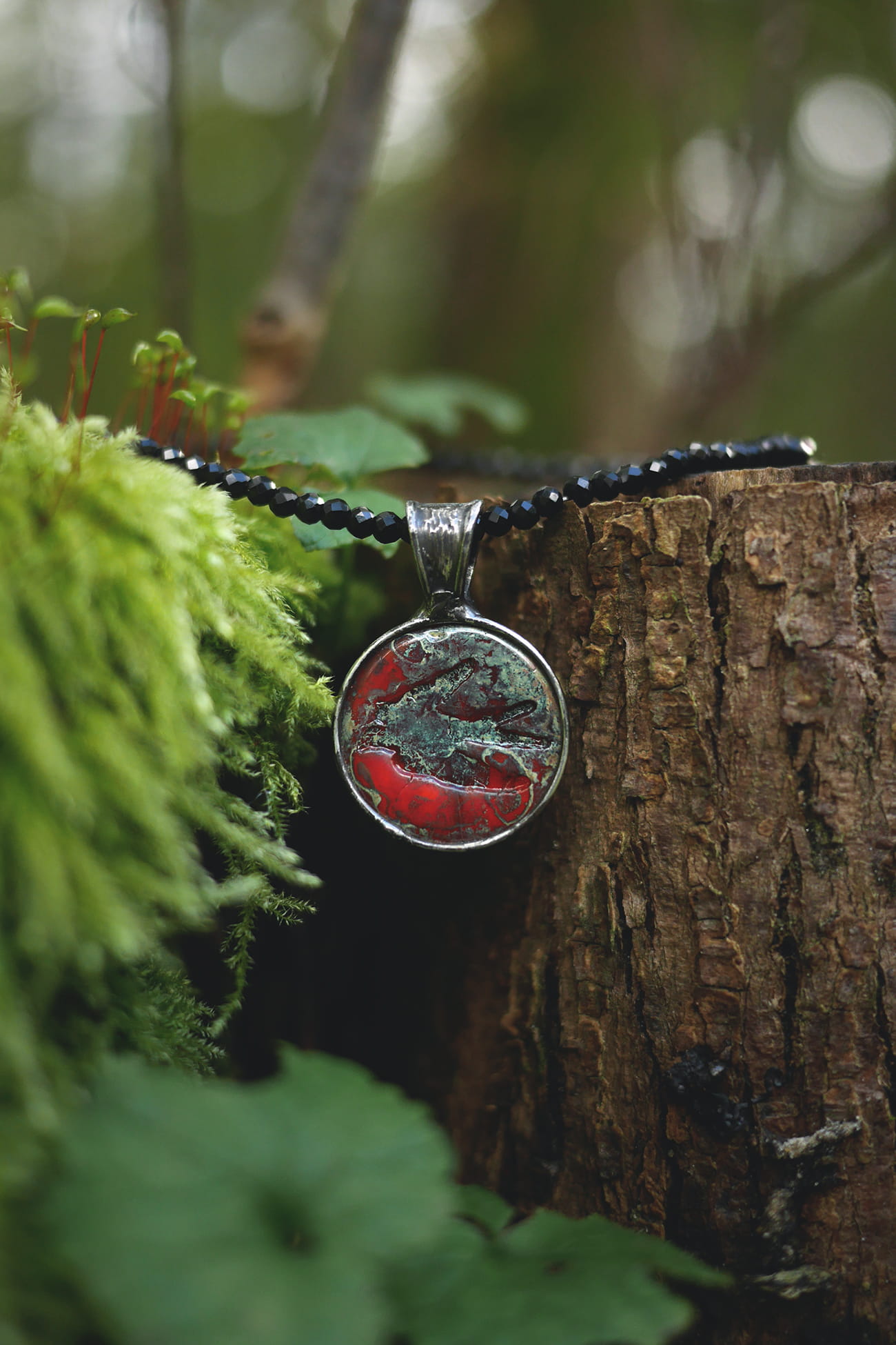 Zawieszka wykonana ze szkła czeskiego oprawiona w miedź i cynę bezołowiową, patynowana oraz polerowana.